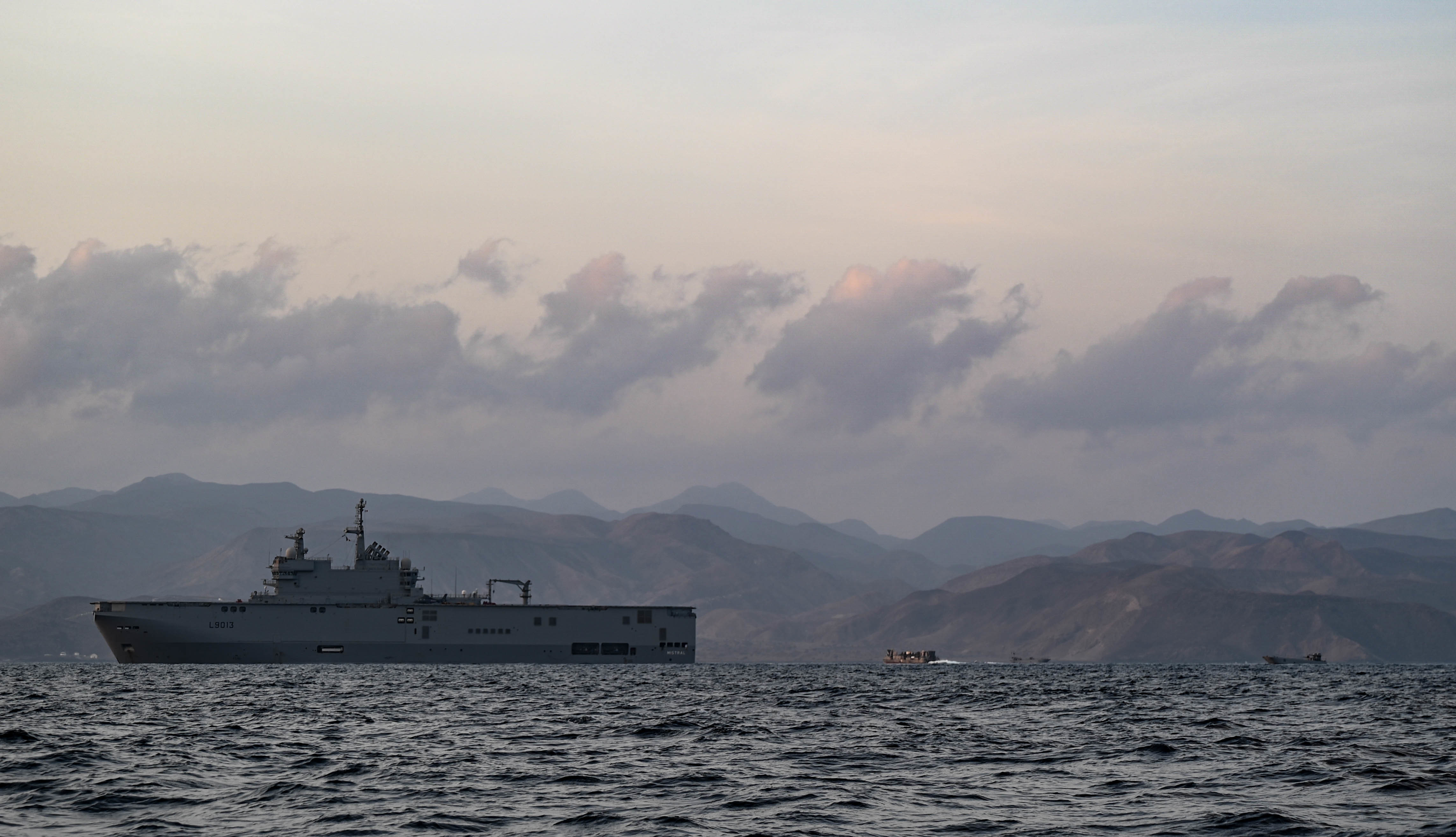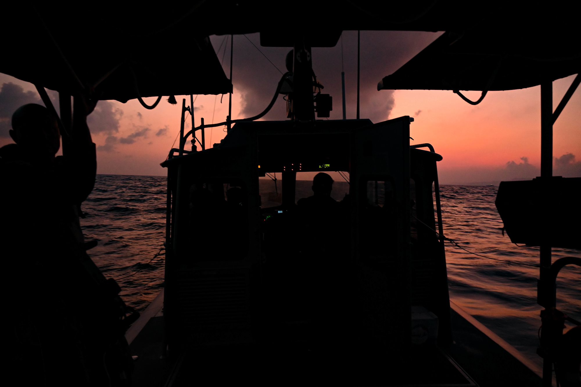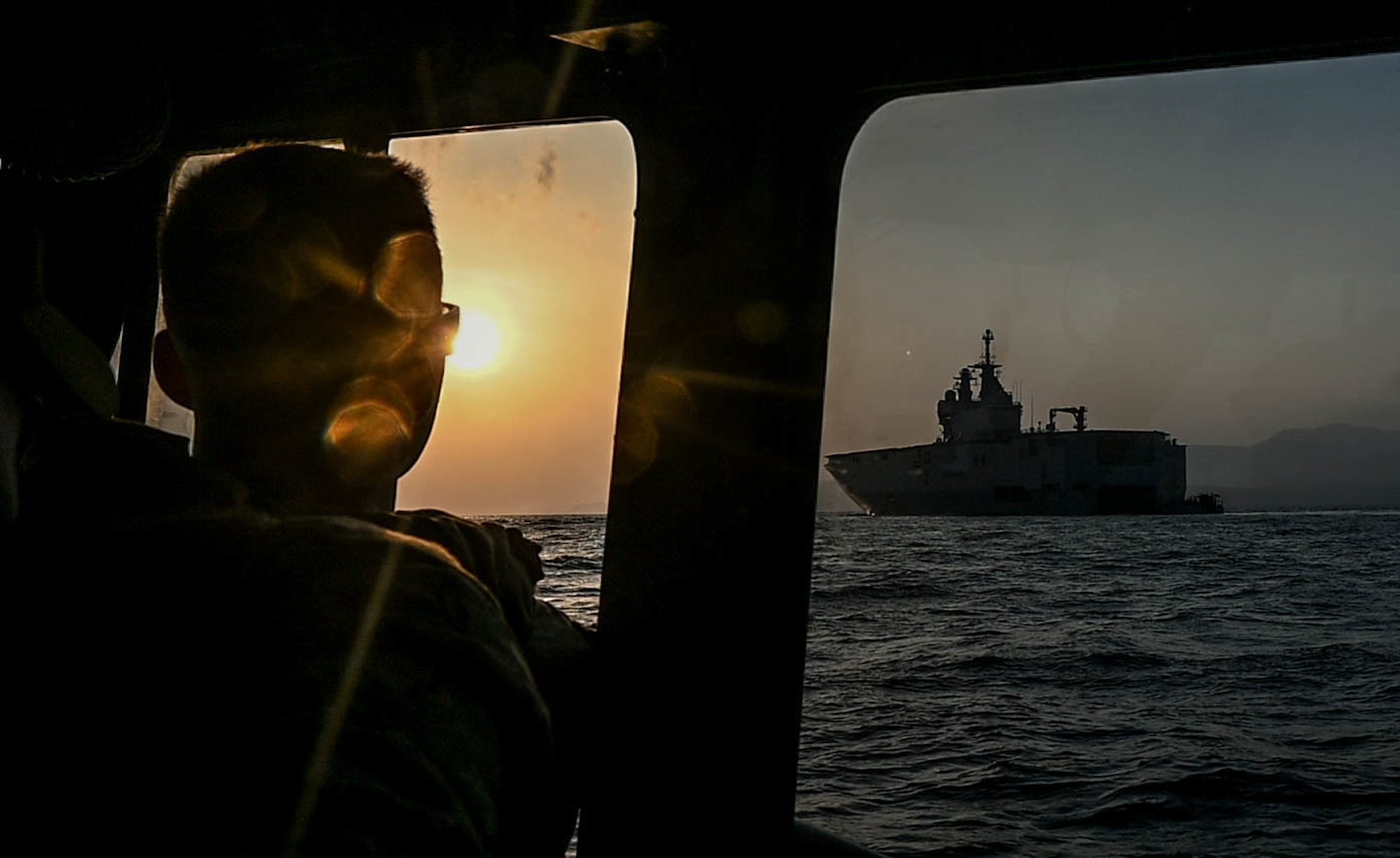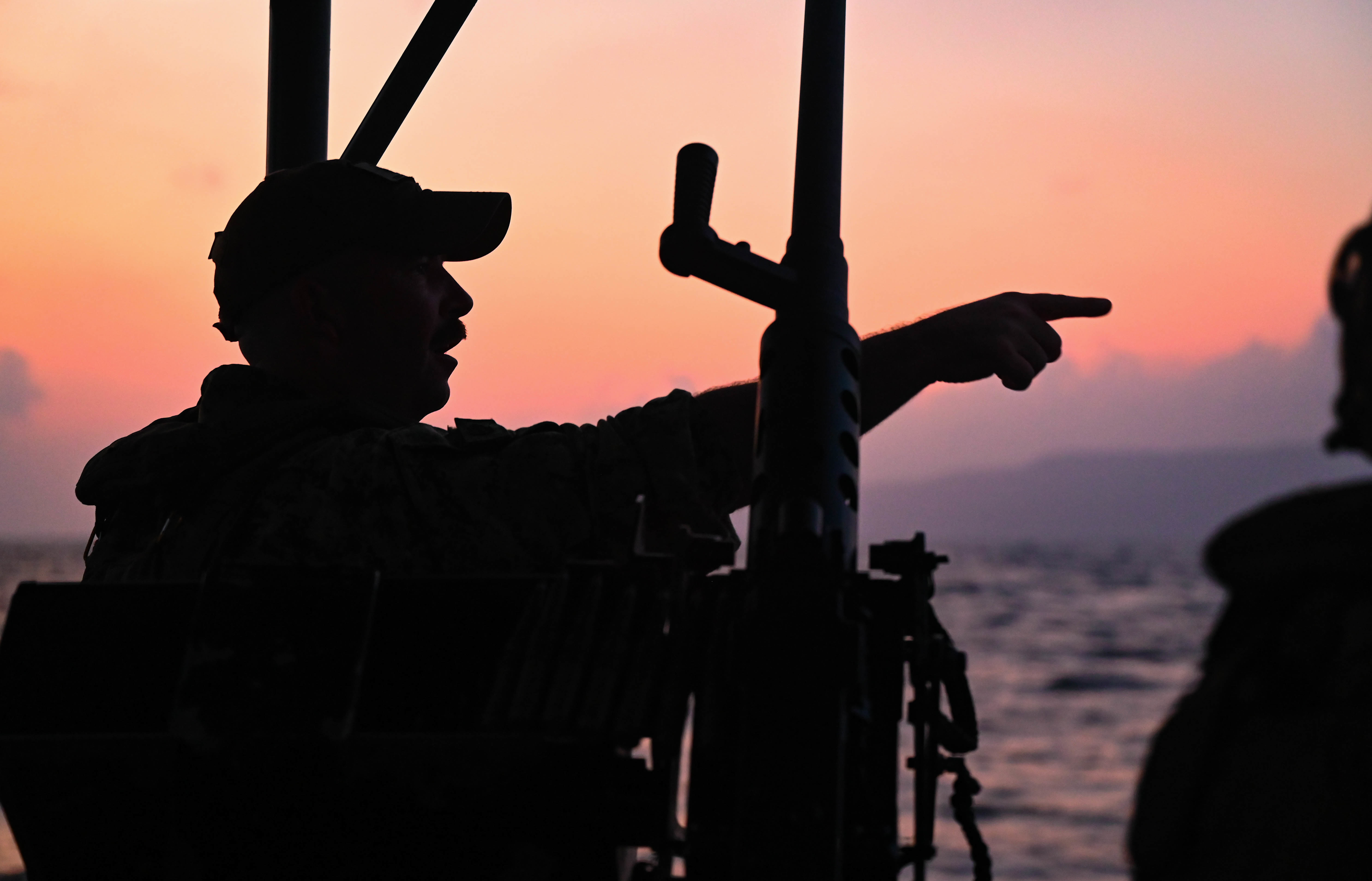 U.S. Navy Reserve members with the Maritime Expeditionary Security Squadron 10 (MSRON 10), Joint Base Charleston, South Carolina, watch as members of the French Armed Forces begin the amphibious assault portion of French-led Joint Exercise WAKRI 22, Port Djibouti, Djibouti, March 13, 2021. The participation of U.S. forces in the French WAKRI exercise demonstrates our interoperability capabilities in austere and complex locations. (U.S. Air Force photo by Staff Sgt. Alysia Blake)
