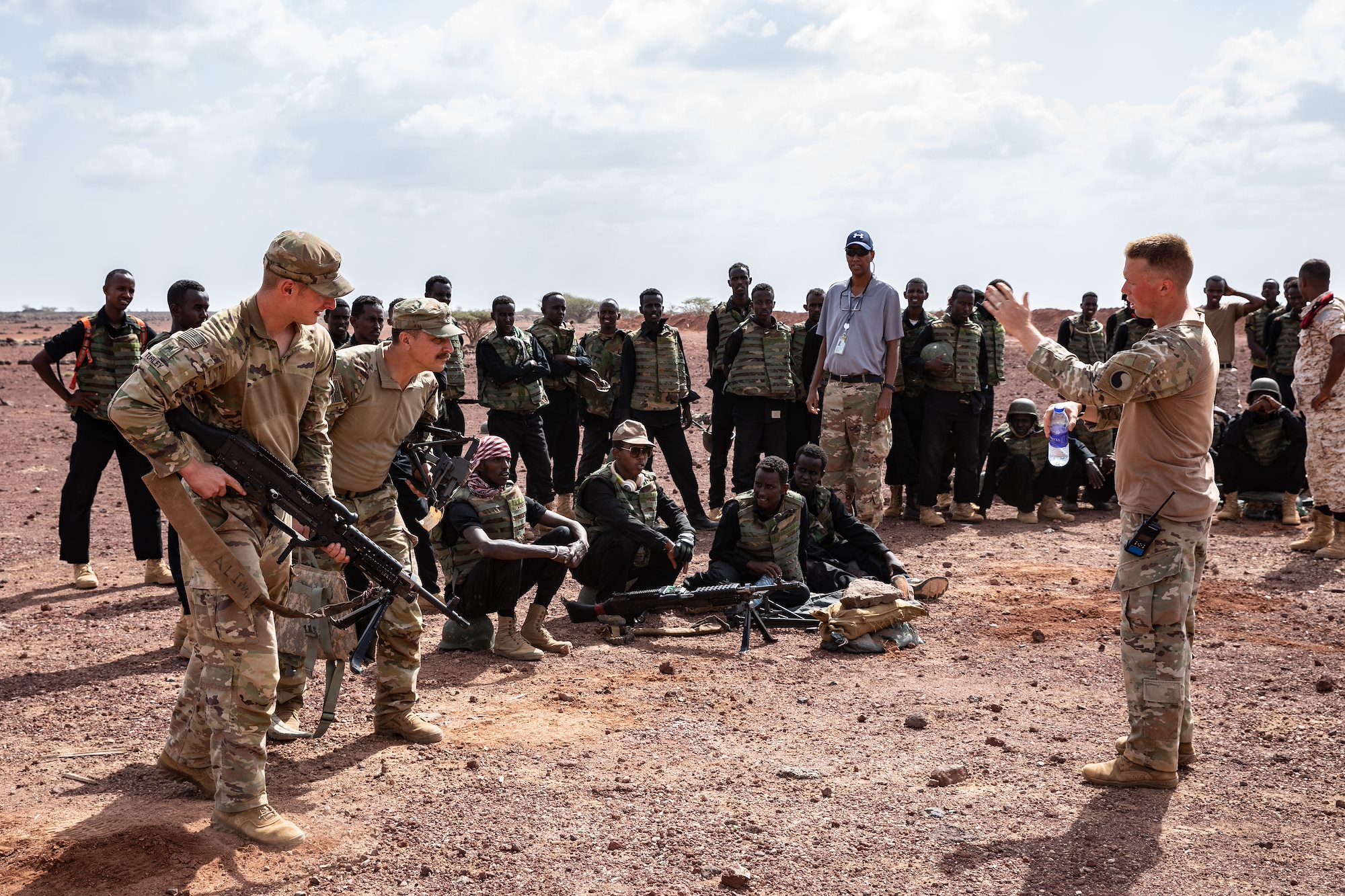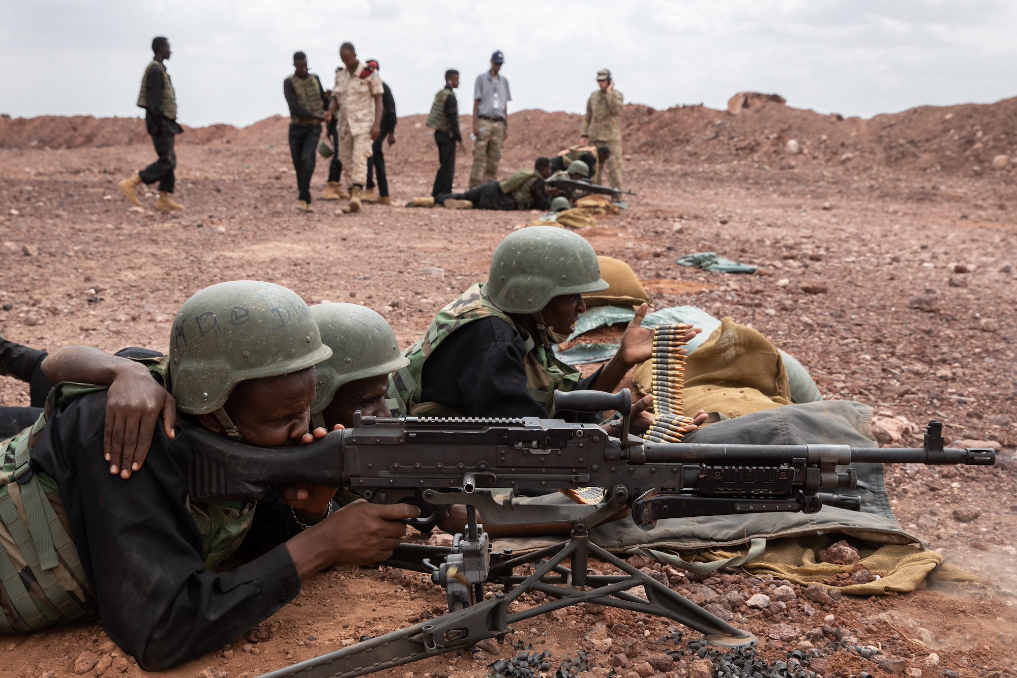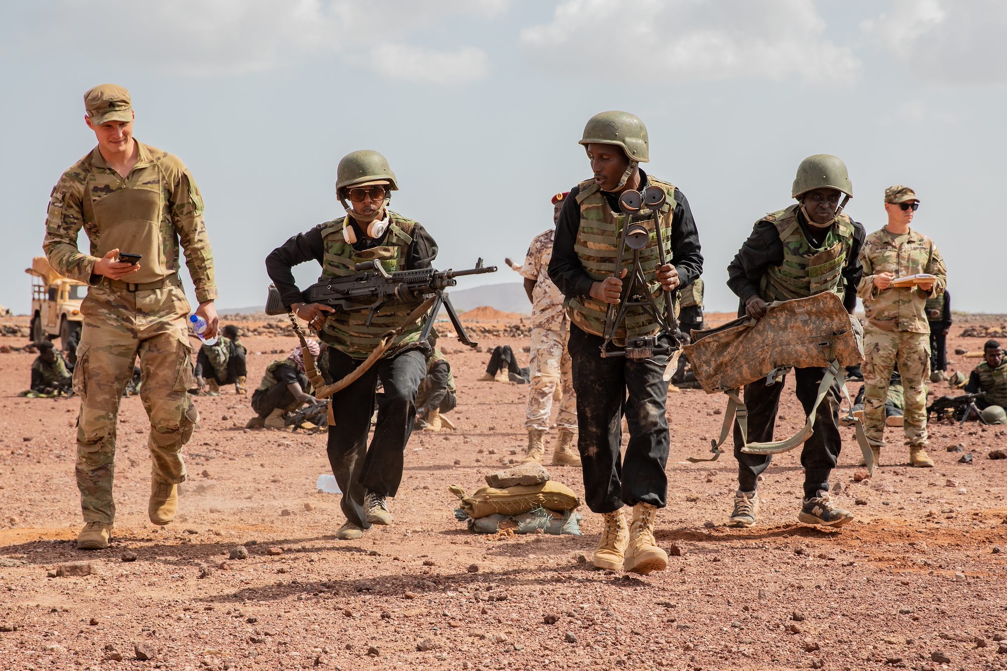 U.S. Soldiers assigned to C Company, Maneuver Company Advisor Team 2130 and Task Force Red Dragon, Combined Joint Task Force-Horn of Africa, support a Machine Gun University competition between Djiboutian Battalion Intervention Rapadie machine gun teams at Ali Oune, Djibouti, Jan. 26, 2022.