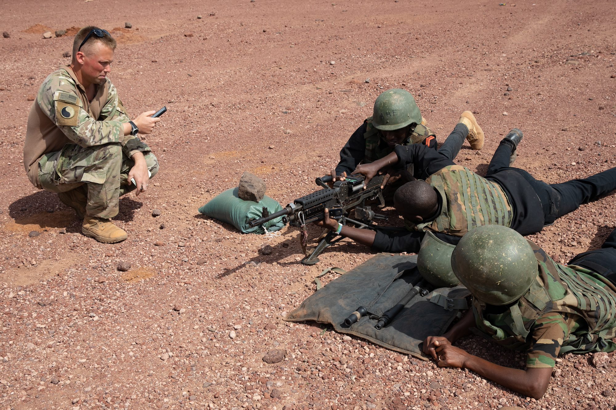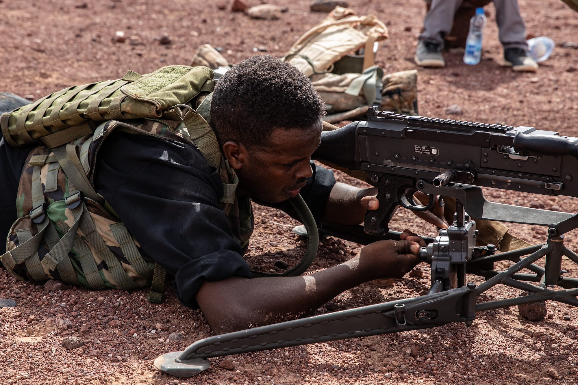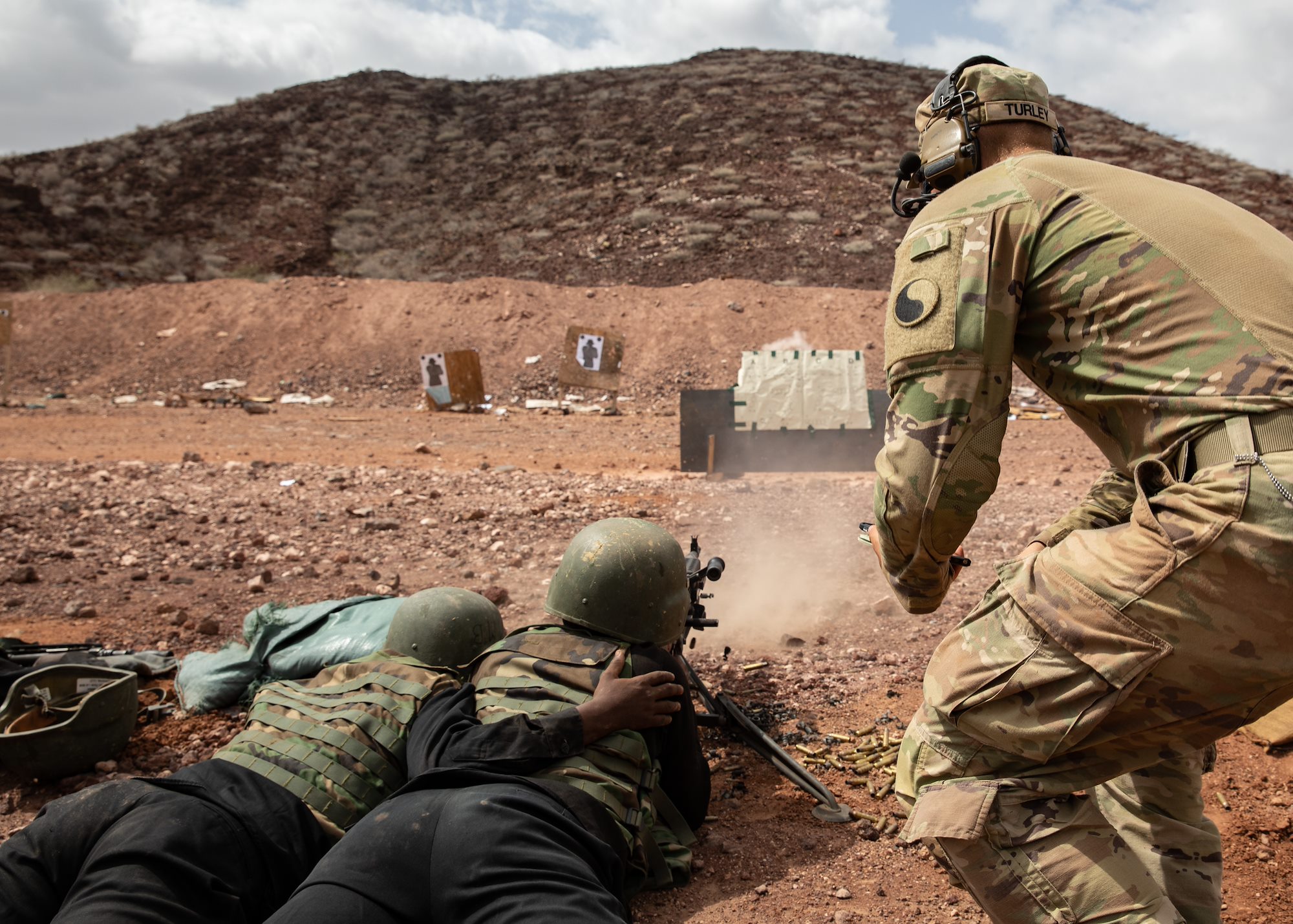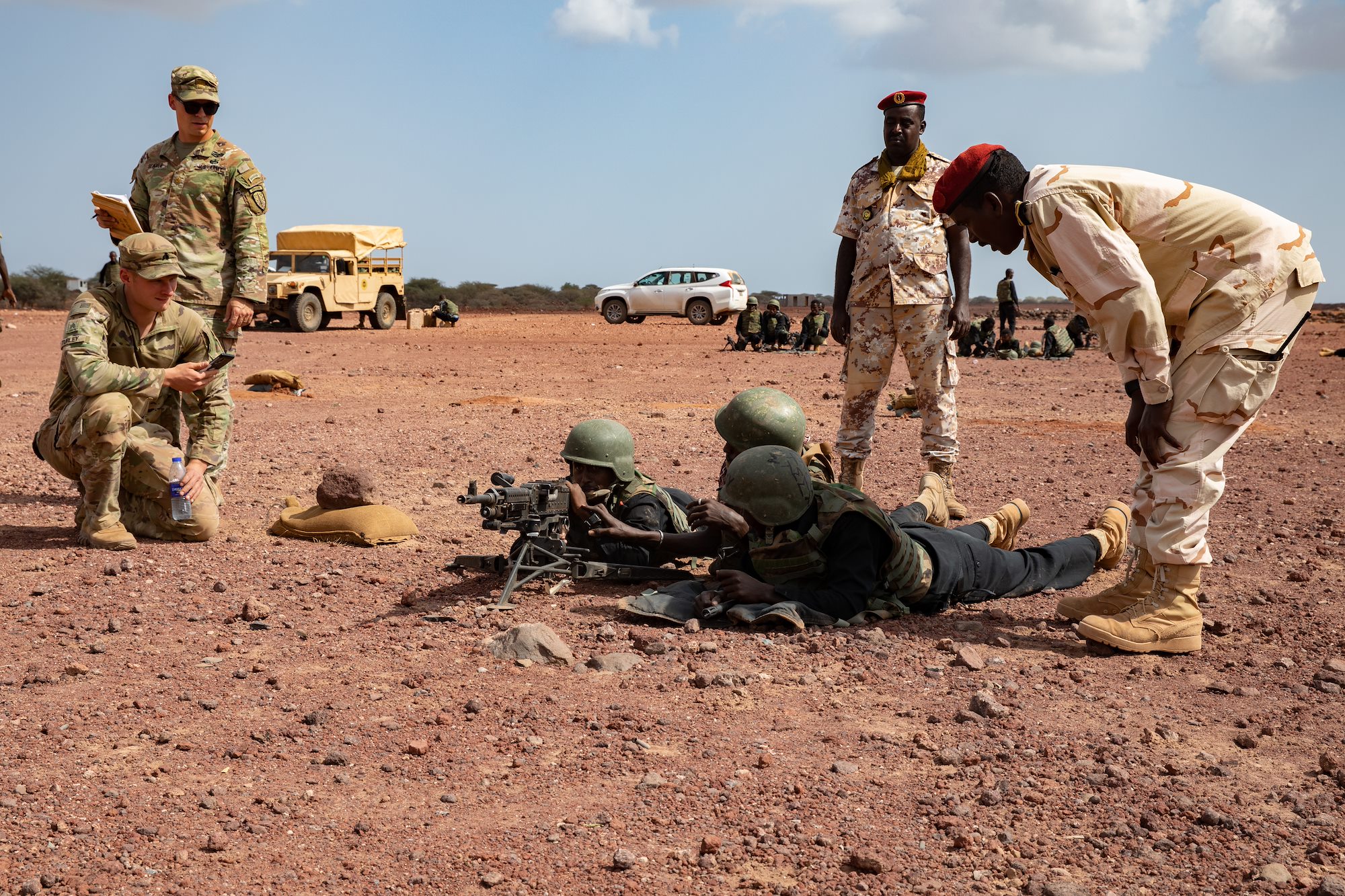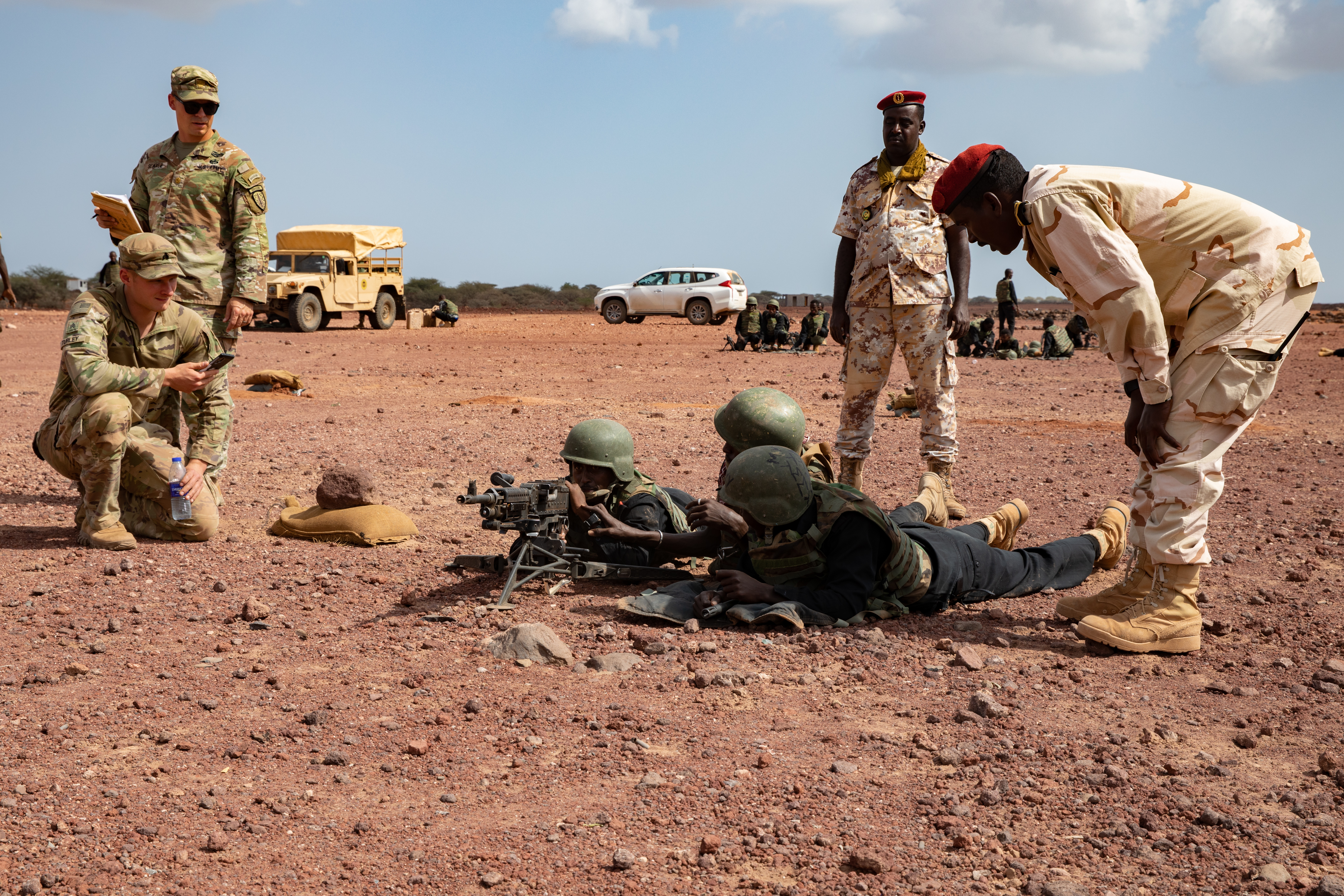 U.S. Soldiers assigned to Task Force Red Dragon, Combined Joint Task Force-Horn of Africa, assist with a Machine Gun University competition between Djiboutian Battalion Intervention Rapadie machine gun teams at Ali Oune, Djibouti, Jan. 26, 2022.