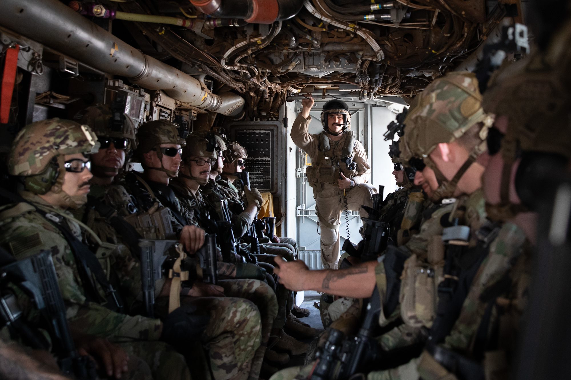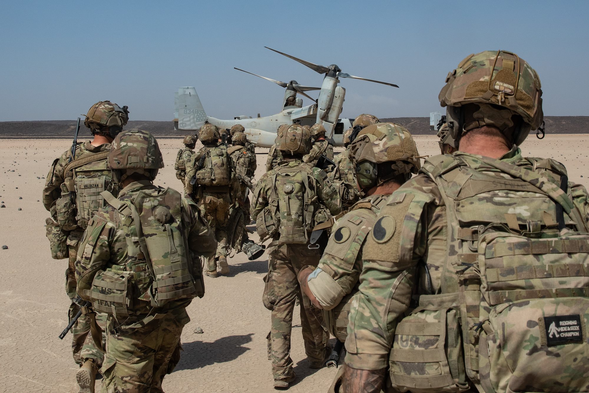 (CJTF-HOA), prepare to board an MV-22 Osprey during an air assault with the U.S. Marine Corps Marine Medium Tiltrotor Squadron-161 (VMM-161) in the Grand Bara Desert, Feb. 8, 2022. The EARF is postured to