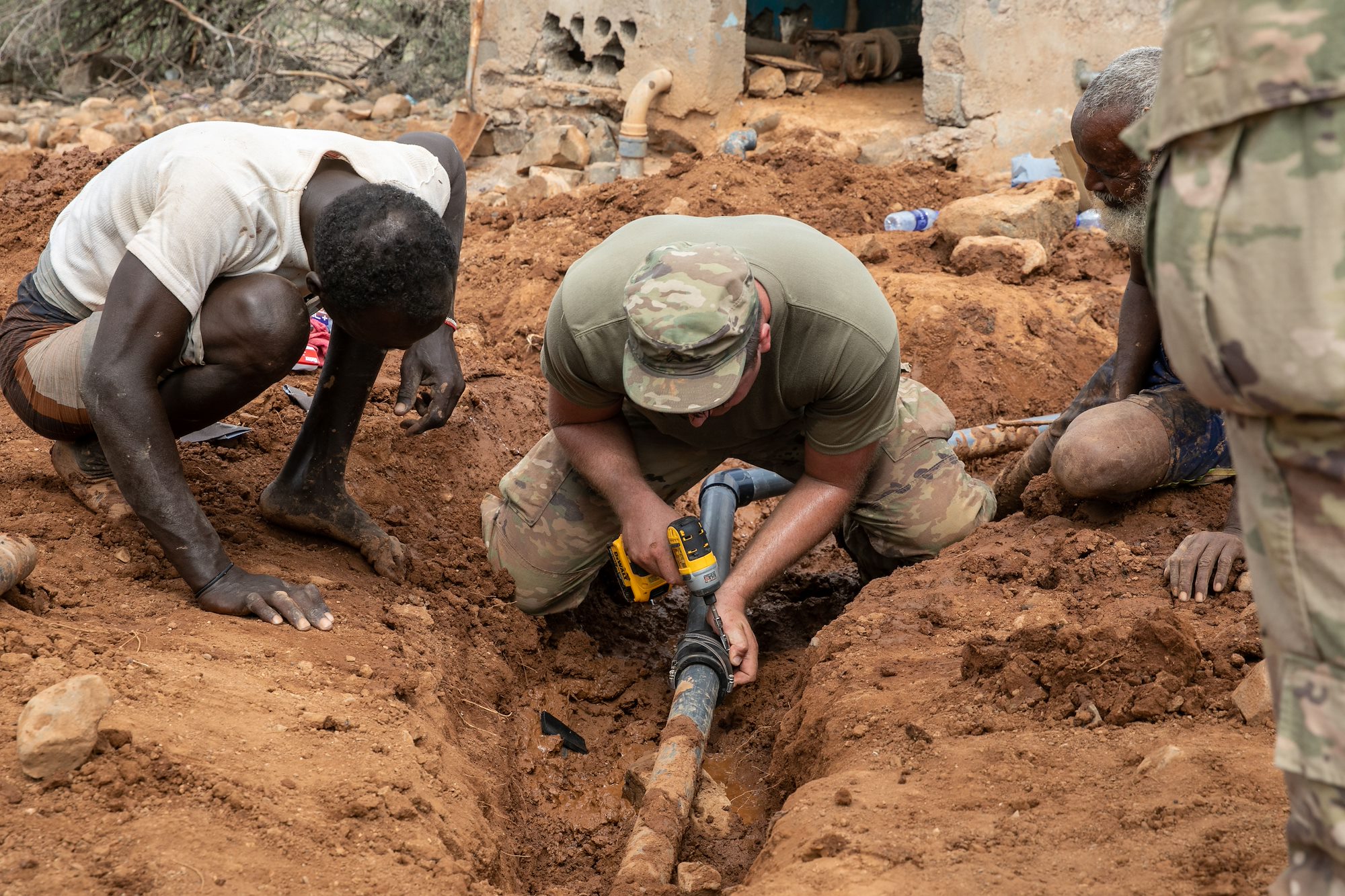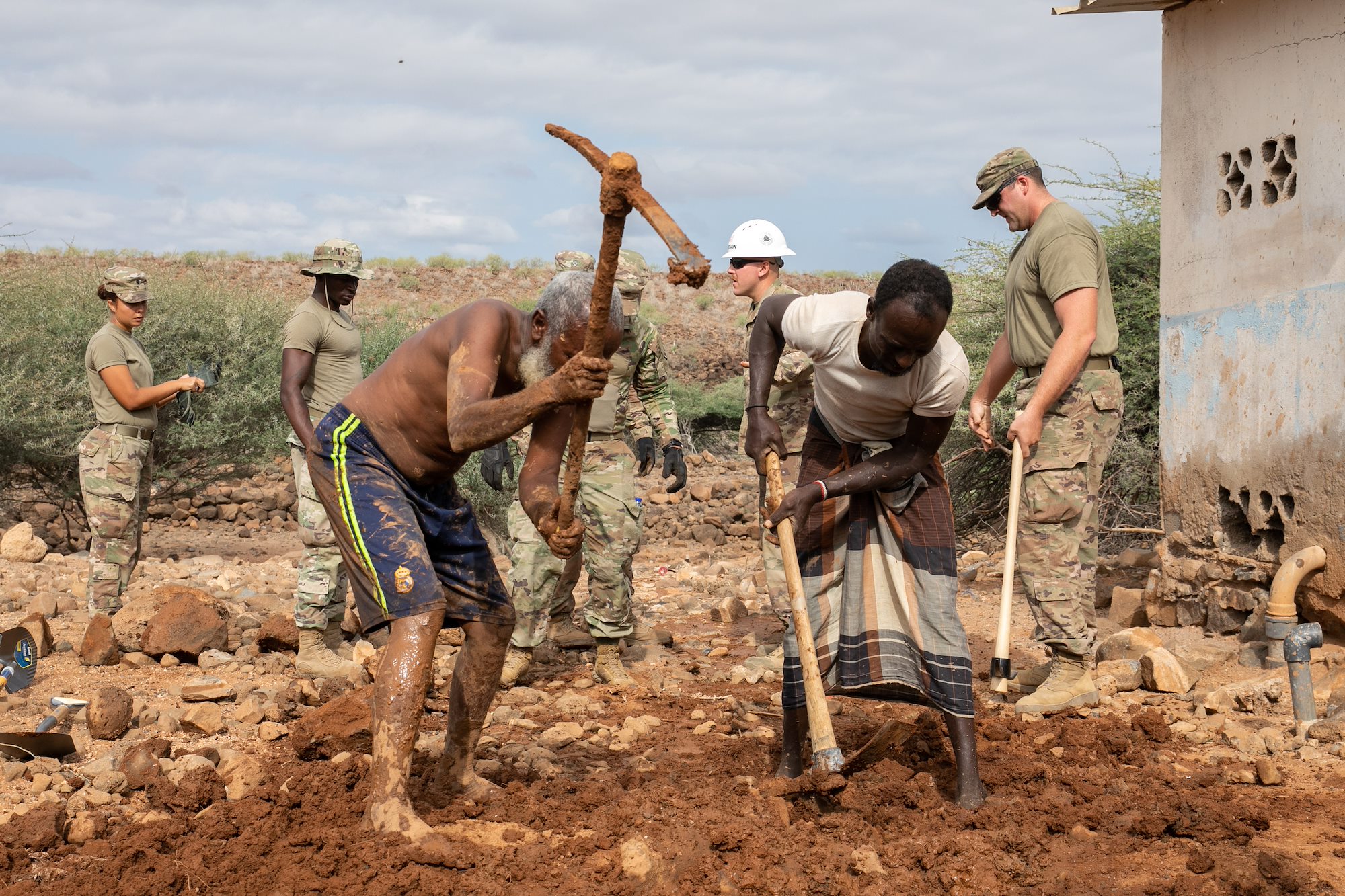 Djiboutians and U.S. Soldiers dig out a broken pipe during a well leak repair at Chabelley Village, Djibouti, Dec. 22, 2021. CJTF-HOA and 712th ESC engineers worked alongside villagers to restore the village’s source of drinking water. CJTF-HOA personnel, located at Camp Lemonnier, Djibouti, regularly work with government leaders and citizens on a variety of projects to promote stability in East Africa. (U.S. Army National Guard photo by Spc. Gauret Stearns)