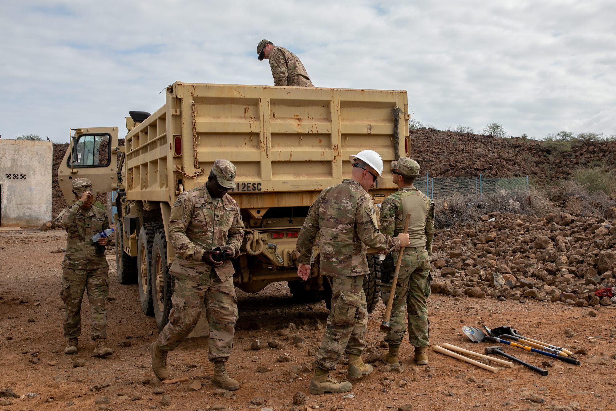 U.S. Army Soldiers from the 712th Engineer Support Company (712th ESC), Combined Joint Task Force – Horn of Africa (CJTF-HOA), unload a truck before repairing a leaking well in Chabelley Village, Djibouti, Dec. 22, 2021. CJTF-HOA and 712th ESC engineers worked alongside villagers to restore the village’s source of drinking water. CJTF-HOA personnel, located at Camp Lemonnier, Djibouti, regularly work with government leaders and citizens on a variety of projects to promote stability in East Africa. (U.S. Army National Guard photo by Spc. Gauret Stearns)