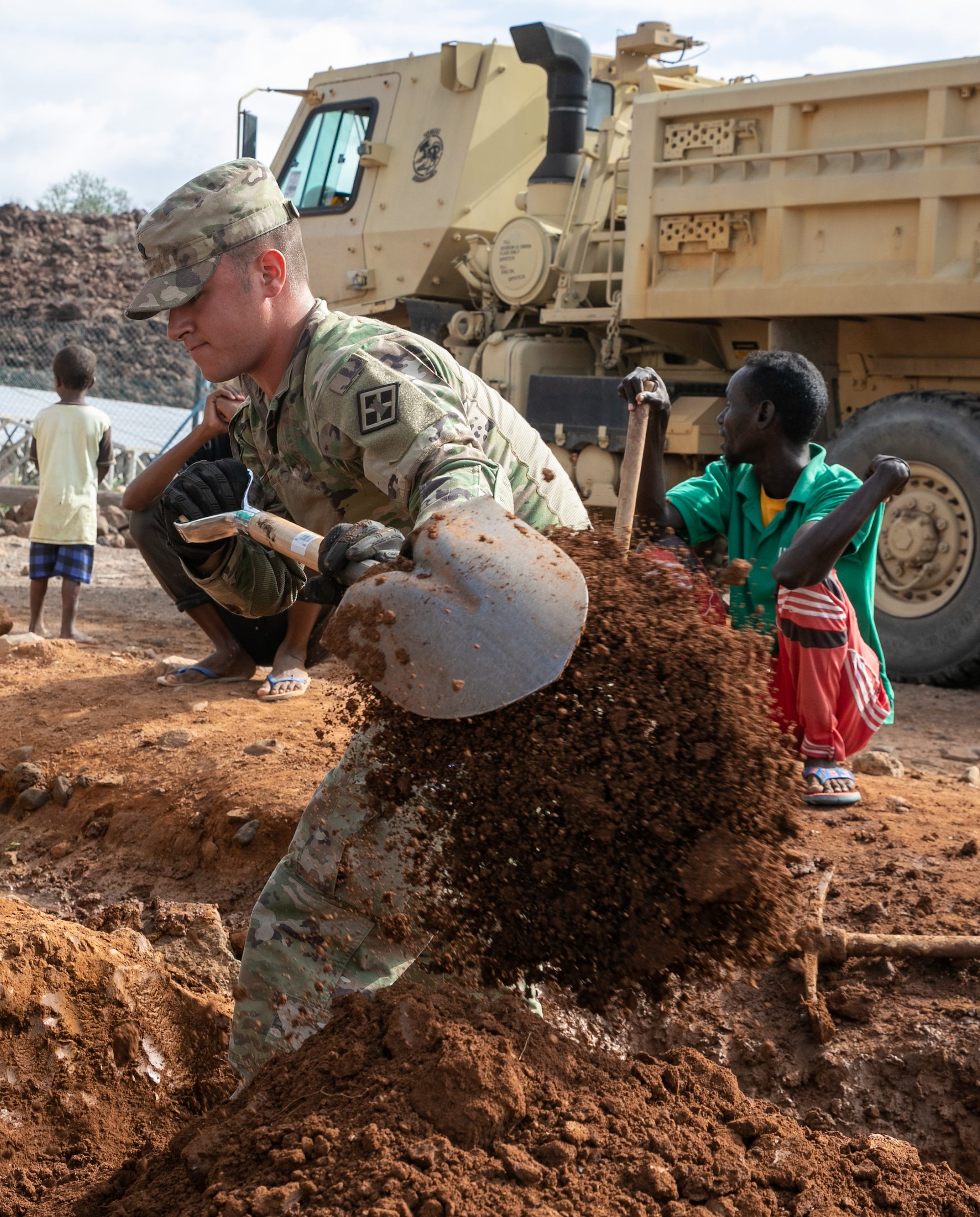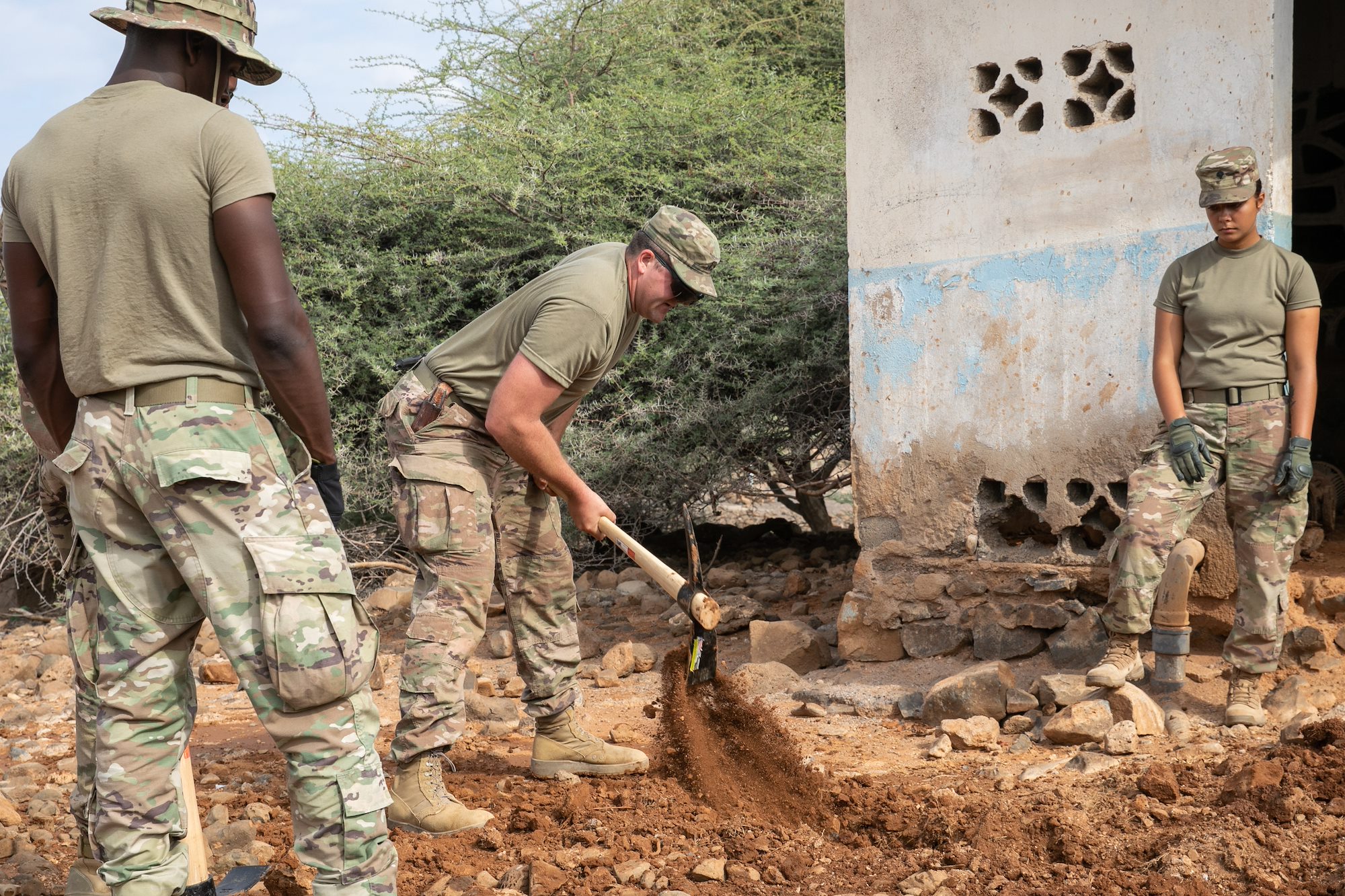 U.S. Soldiers dig a water drainage trench during a well leak repair project at Chabelley Village, Djibouti, Dec. 22, 2021. CJTF-HOA and 712th ESC engineers worked alongside villagers to restore the village’s source of drinking water. CJTF-HOA personnel, located at Camp Lemonnier, Djibouti, regularly work with government leaders and citizens on a variety of projects to promote stability in East Africa. (U.S. Army National Guard photo by Spc. Gauret Stearns)