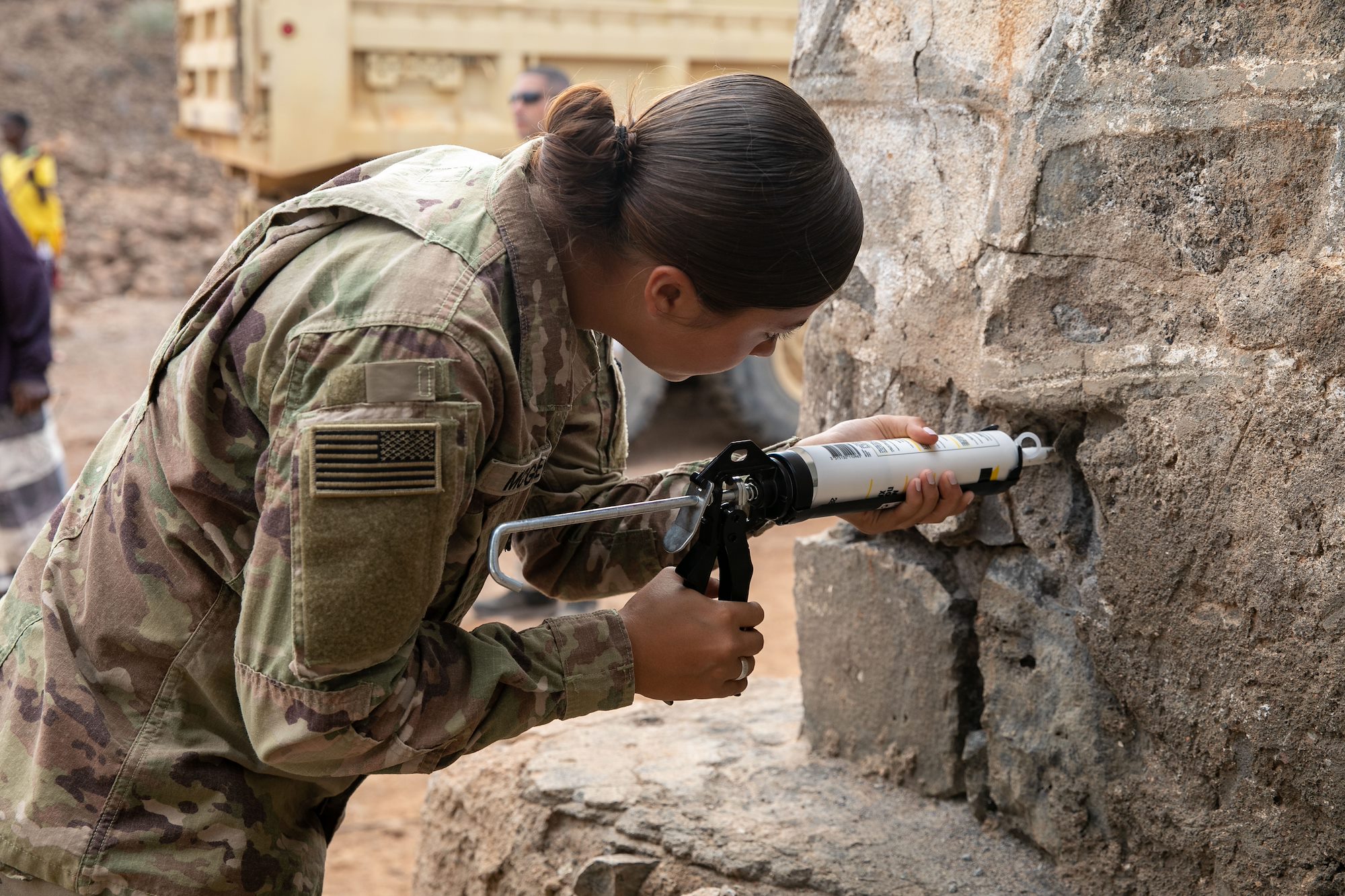 U.S. Army Spc. Hailey McGrew, engineer specialist, 712th Engineer Support Company (712th ESC), Combined Joint Task Force – Horn of Africa (CJTF-HOA), caulks an exterior cistern crack during a well leak repair project at Chabelley Village, Djibouti, Dec. 29, 2021. CJTF-HOA and 712th ESC engineers worked alongside villagers to restore the village’s source of drinking water. CJTF-HOA personnel, located at Camp Lemonnier, Djibouti, regularly work with government leaders and citizens on a variety of projects to promote stability in East Africa. (U.S. Army National Guard photo by Spc. Gauret Stearns)