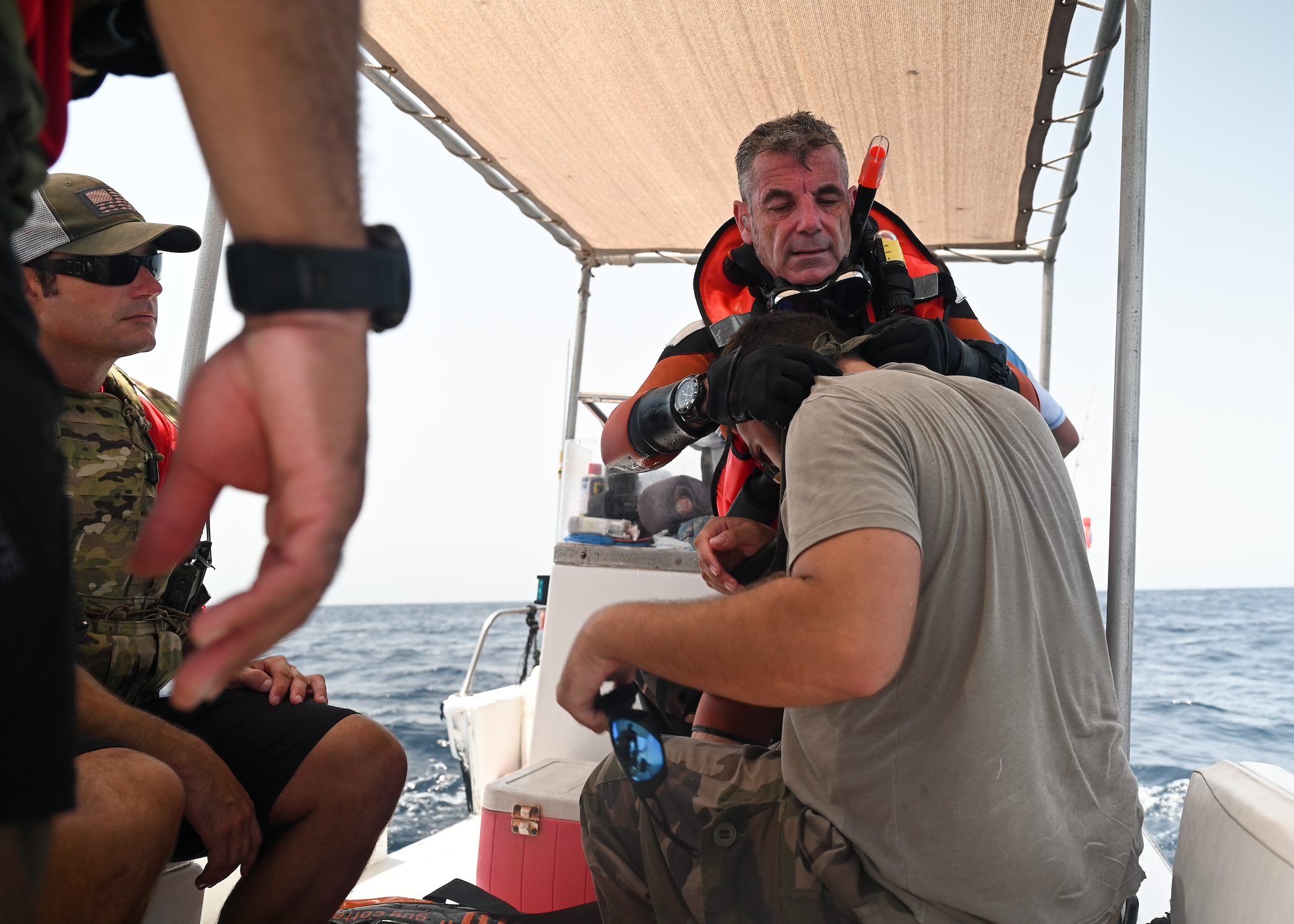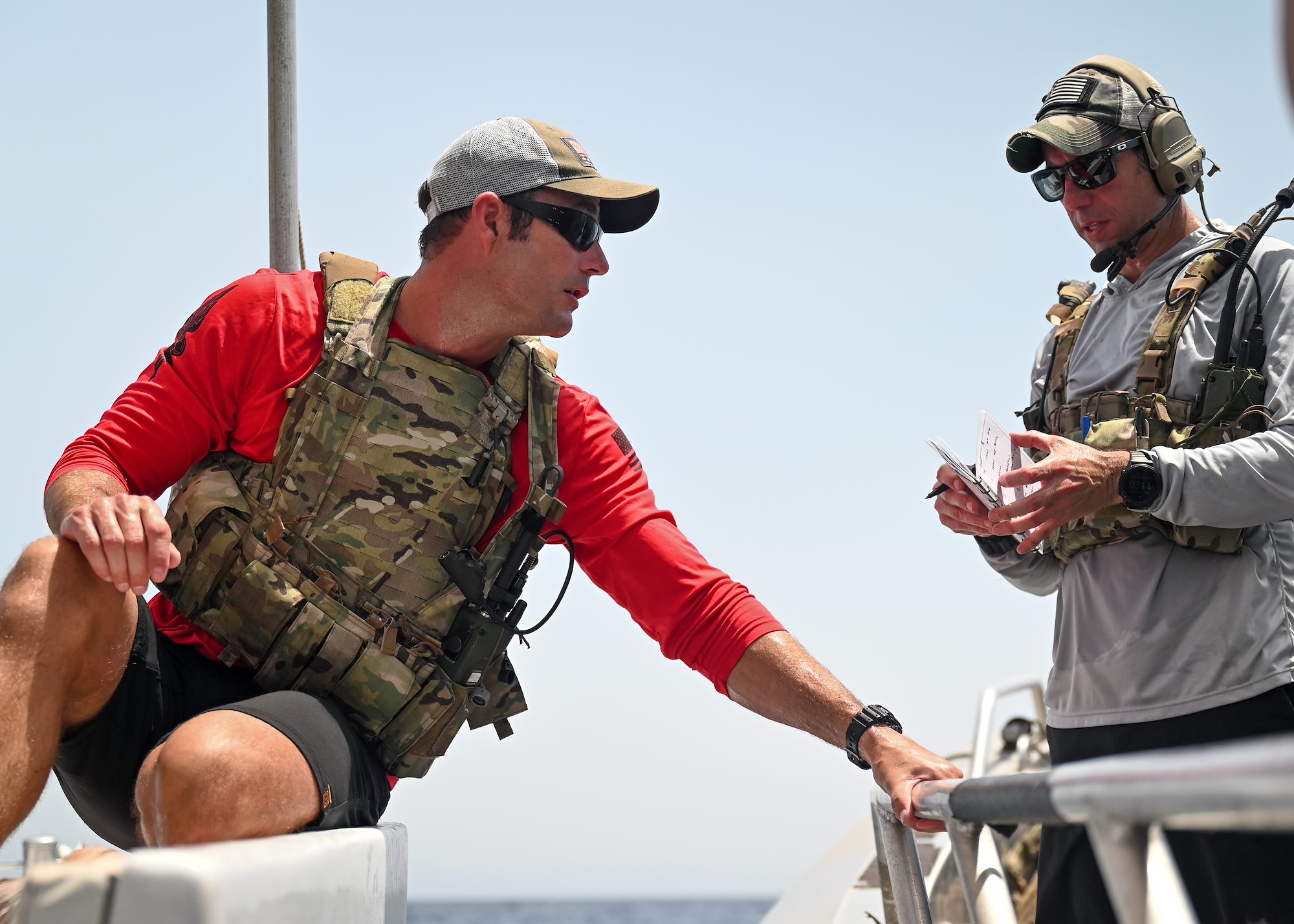 U.S. Air Force Senior Master Sgt. Matt Williams, left, 82nd Expeditionary Rescue Squadron pararescueman, relays medical information to U.S. Air Force Senior Master Sgt. Patrick DiCrasto, 82nd ERQS tactical air control party specialist, during a joint water rescue training in the Gulf of Tadjoura June 30, 2021. U.S. and French forces responded to a simulated anti-piracy scenario, honing maritime rescue procedures and enhancing partner capabilities. (U.S. Air Force photo by Staff Sgt. Missy Sterling)