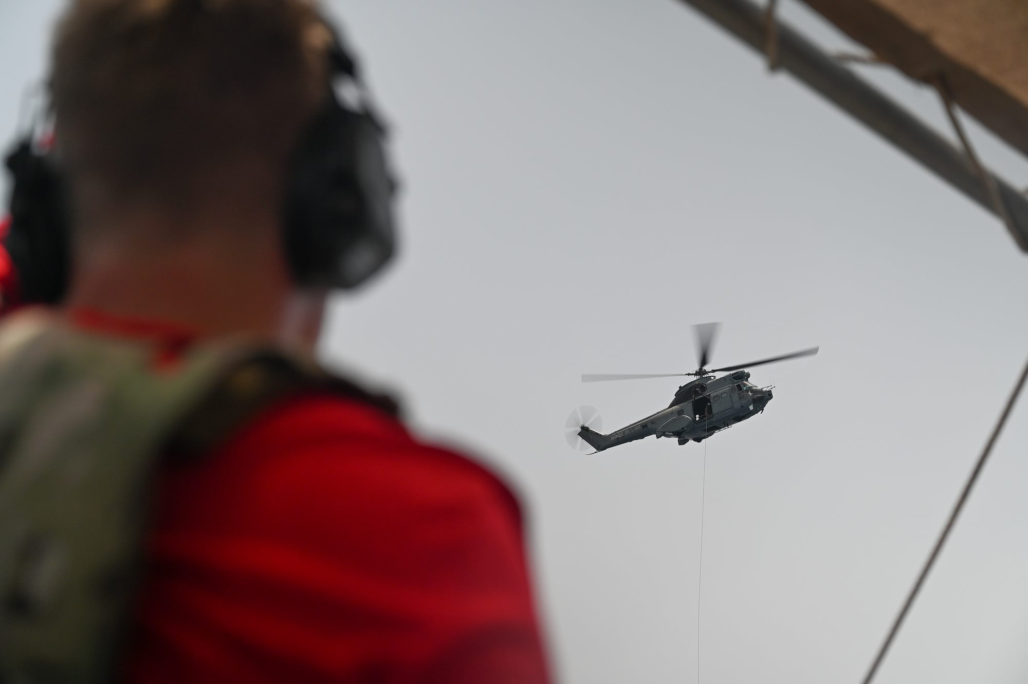 A SA 330 Puma helicopter assigned to the French Air Force’s Transport Squadron ET 88, responds to a simulated medical emergency during a joint water rescue training in the Gulf of Tadjoura June 30, 2021. The SA 330 Puma can be used for hoists and hold up to six litter patients with four additional personnel. (U.S. Air Force photo by Staff Sgt. Missy Sterling)