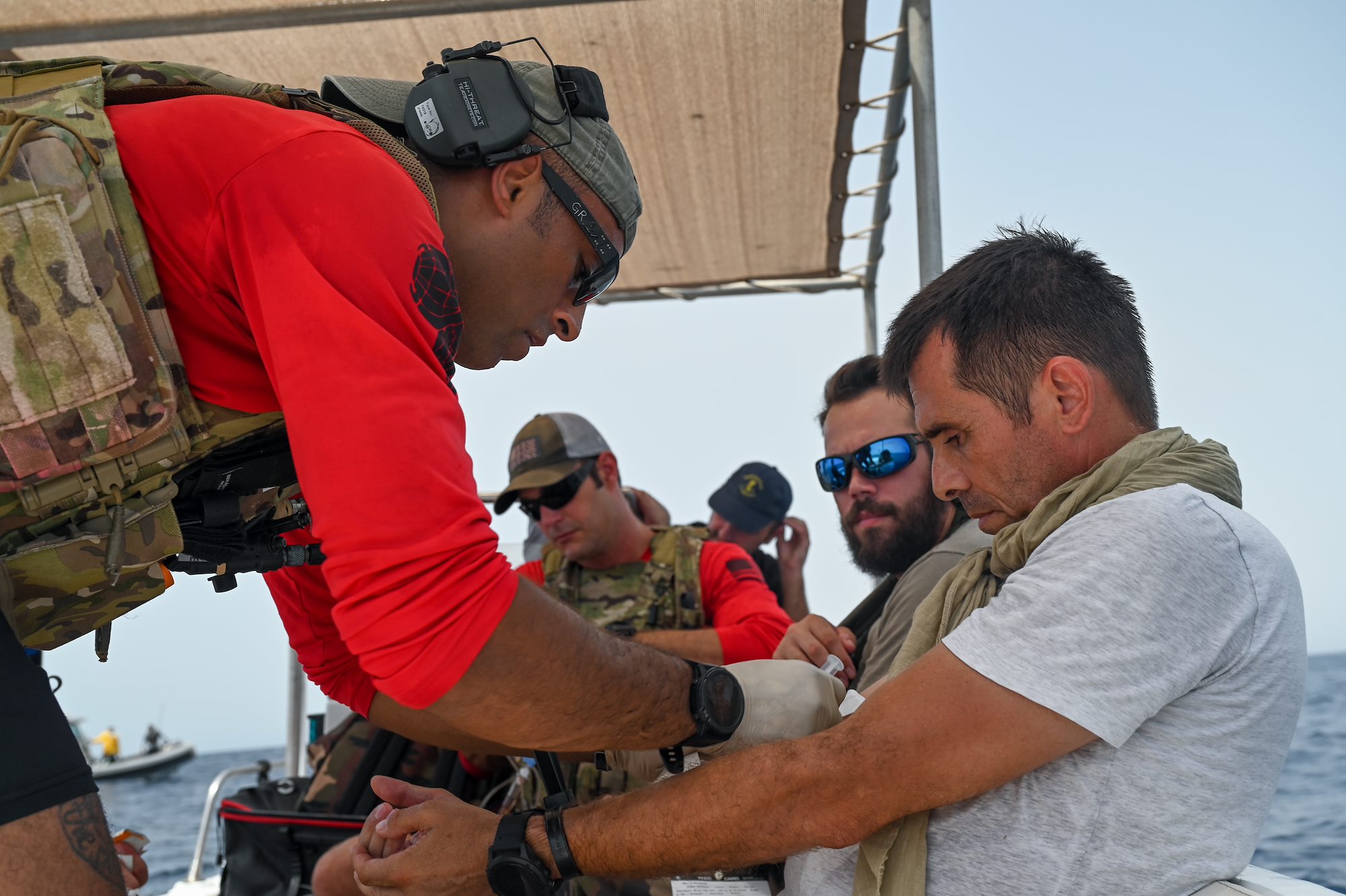 U.S. Air Force Staff Sgt. Killian Gartner, 82nd Expeditionary Rescue Squadron pararescueman, treats a simulated patient during a joint water rescue training in the Gulf of Tadjoura June 30, 2021. Pararescuemen are trained tactical rescue and emergency trauma specialists equipped to locate and treat personnel in any environment. (U.S. Air Force photo by Staff Sgt. Missy Sterling)