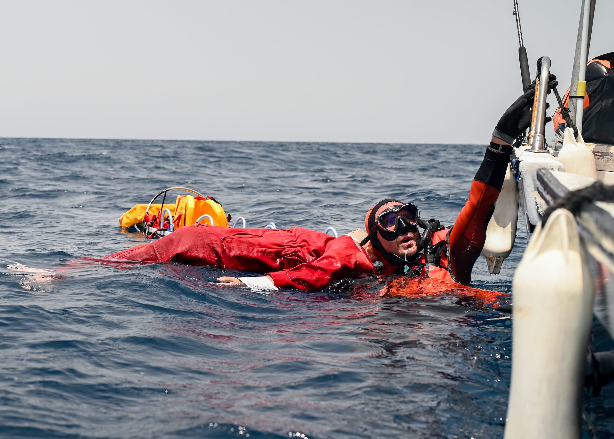 French Air Force rescue divers prepare to hoist a simulated patient during a joint water rescue training in the Gulf of Tadjoura June 30, 2021. U.S. and French forces responded to a simulated anti-piracy scenario, honing maritime rescue procedures and enhancing partner capabilities. (U.S. Air Force photo by Staff Sgt. Missy Sterling)