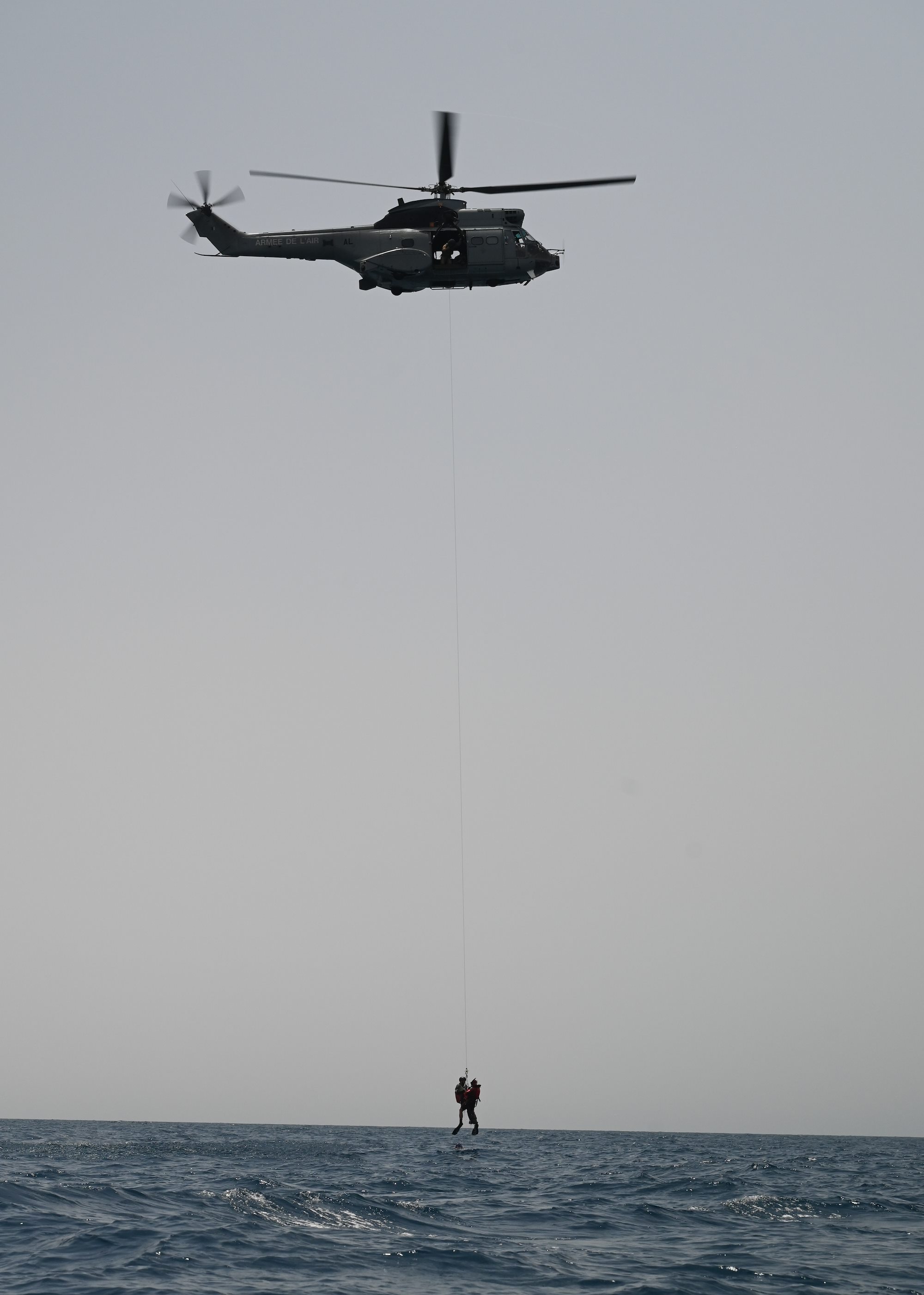 French Air Force rescue divers hoist a simulated patient during a joint water rescue training in the Gulf of Tadjoura June 30, 2021. U.S. and French forces responded to a simulated anti-piracy scenario, honing maritime rescue procedures and enhancing partner capabilities. (U.S. Air Force photo by Staff Sgt. Missy Sterling)