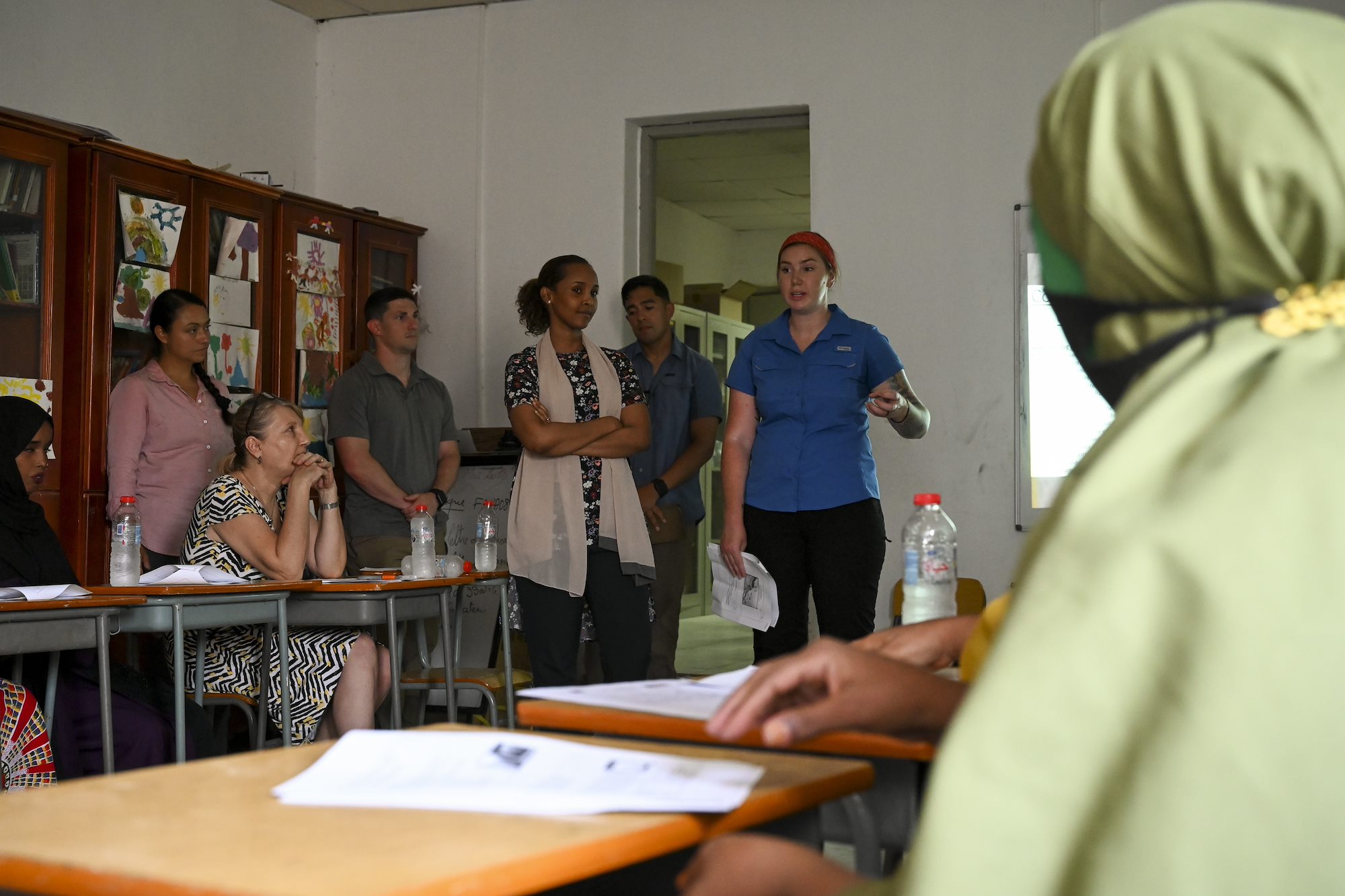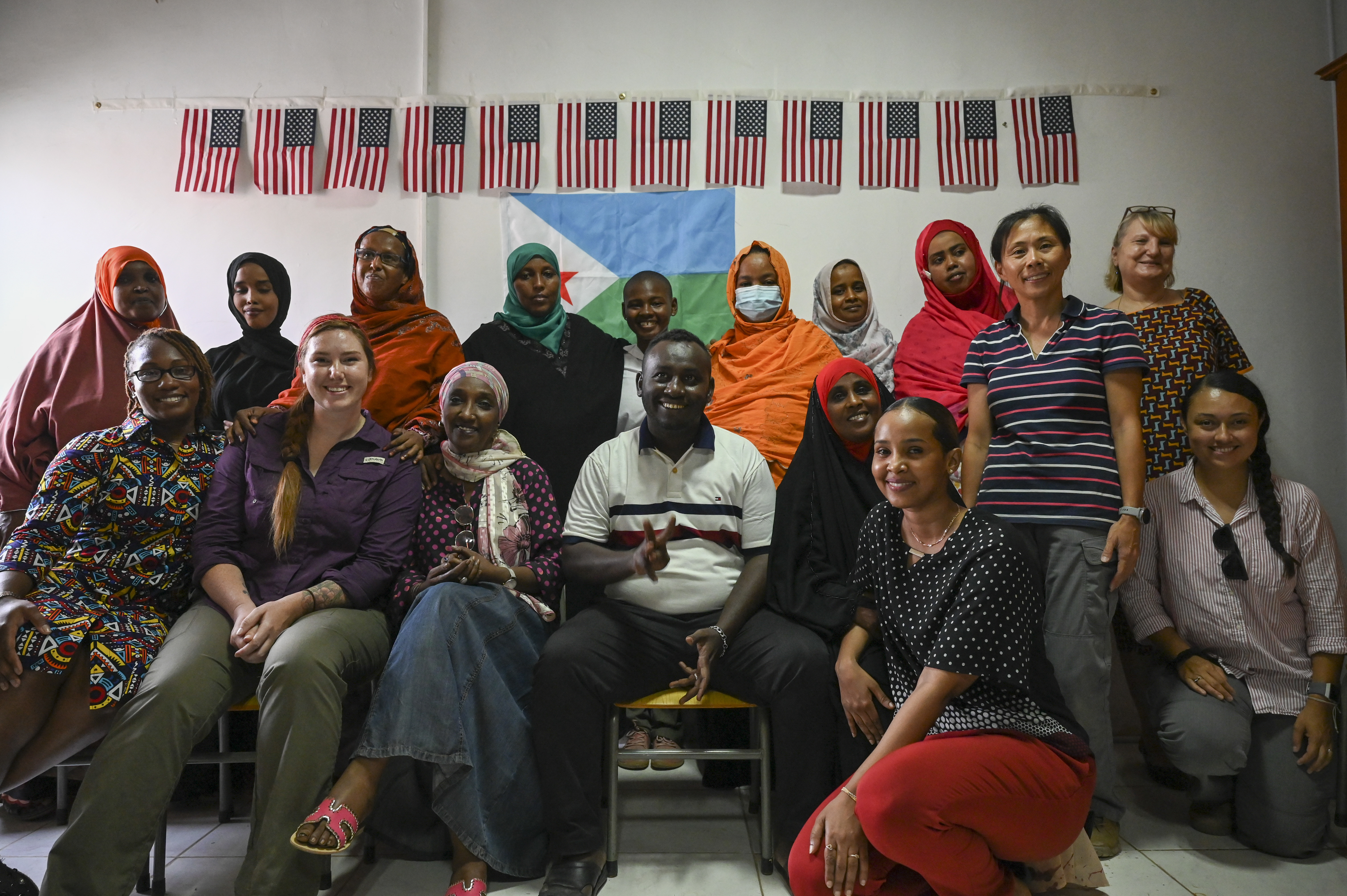 Soldiers with the Civil Affairs East Africa (CA-EA) functional specialty team, in support of Combined Joint Task Force-Horn of Africa, pose with staff and volunteers at Solidarte Feminine July 1, 2021, in Djibouti City, Djibouti. The CA-EA functional specialty team with the assistance of the 404th CA-EA battalion, taught both basic first aid and English to the staff and volunteers at Solidarte Feminine, a local organization in Djibouti, as part of the Women, Peace, and Security program which focuses on meaningful partnerships and empowering women worldwide. (U.S. Air Force photo by Senior Airman Taylor Davis)