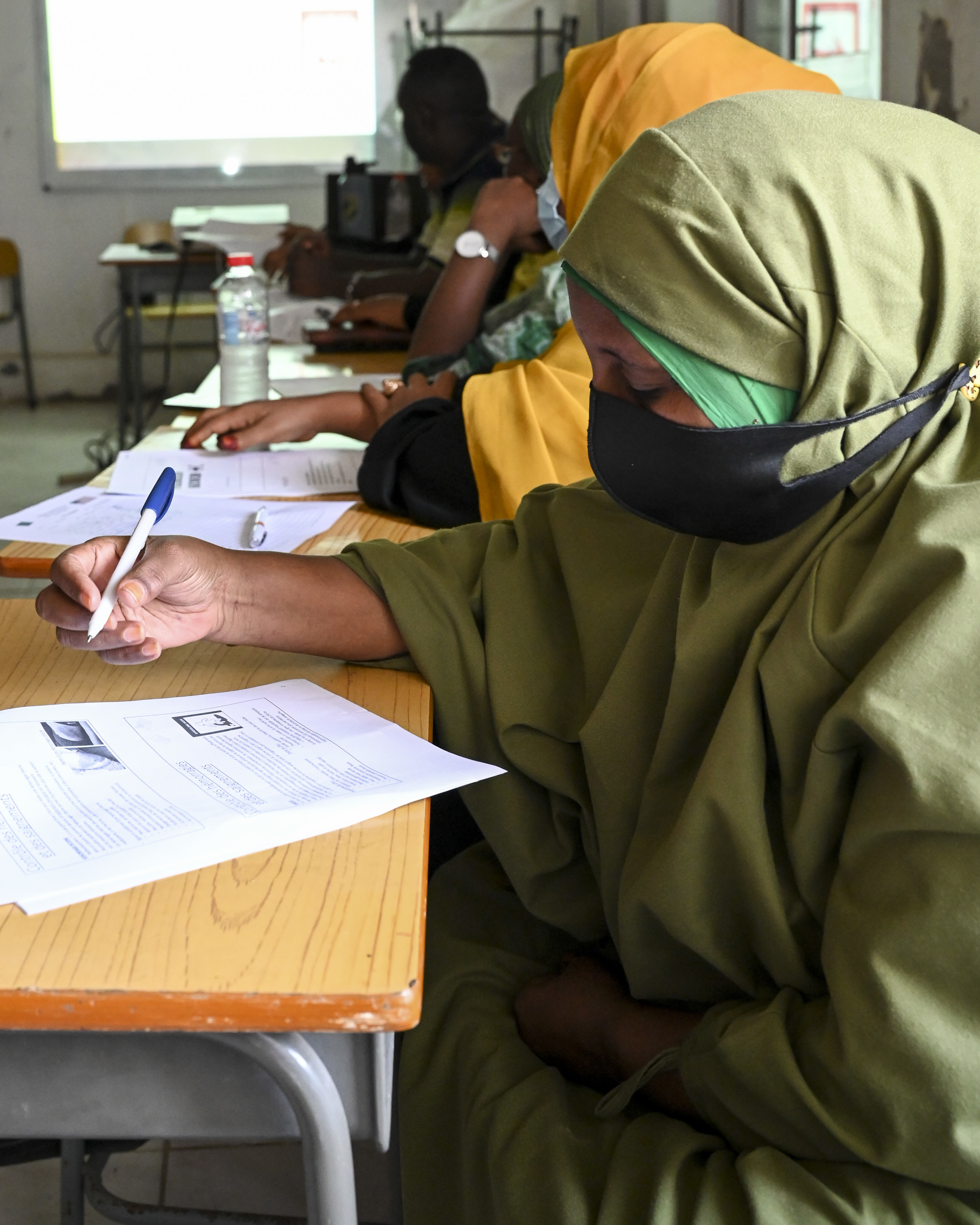 Women take notes in a first aid class taught by Soldiers assigned to the Civil Affairs East Africa (CA-EA) functional specialty team, in support of Combined Joint Task Force-Horn of Africa, at Solidarte Feminine June 29, 2021, in Djibouti City, Djibouti. The women make up the staff at Solidarte Feminine, a local organization in Djibouti that provides resources to women in need as well as those directly or indirectly affected by HIV. (U.S. Air Force photo by Senior Airman Taylor Davis)