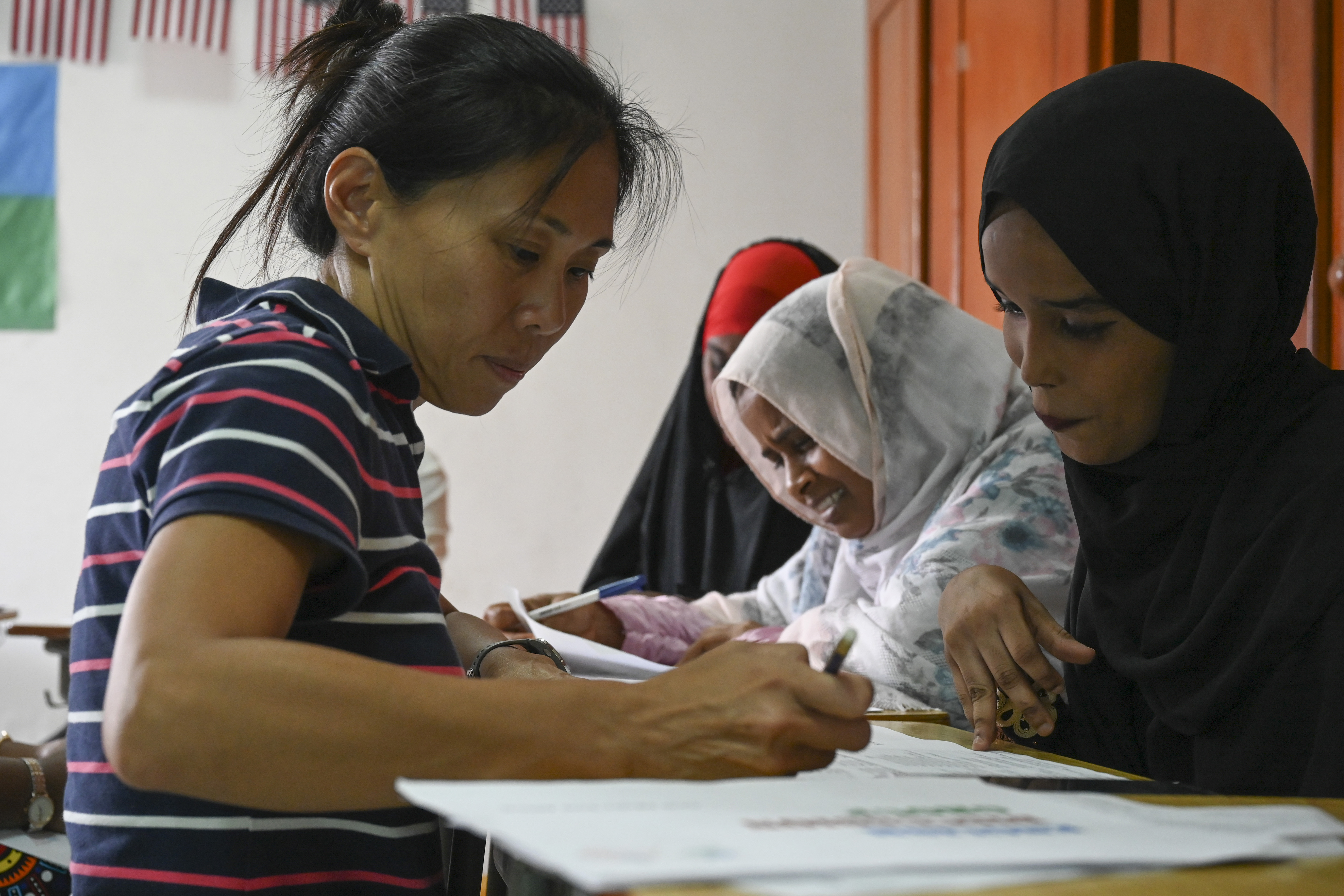 U.S. Army Lt. Col. Sachiyo Kawaguchi, left, a dentist assigned to the Civil Affairs East Africa (CA-EA) functional specialty team in support of Combined Joint Task Force-Horn of Africa, helps teach English to Fatouma Ilyas, right, a volunteer at Solidarte Feminine July 1, 2021, in Djibouti City, Djibouti. The CA-EA functional specialty team has worked with Solidarte Feminine, a local organization in Djibouti, as part of the Women, Peace, and Security program which focuses on meaningful partnerships and empowering women worldwide. (U.S. Air Force photo by Senior Airman Taylor Davis)