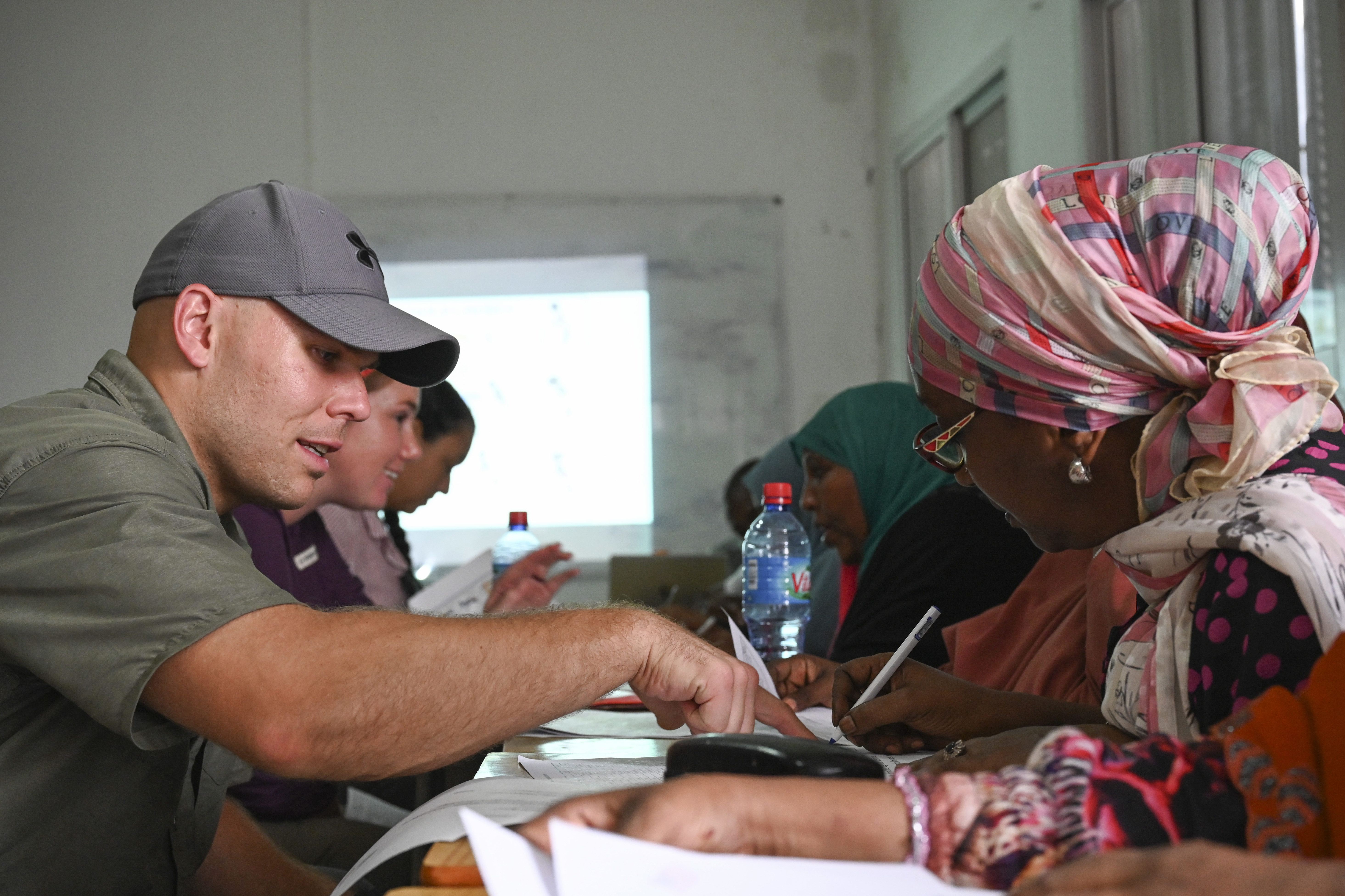 U.S. Army Staff Sgt. Justin Curry, left, team non-commissioned officer with the 404th Civil Affairs East Africa (CA-EA) battalion, in support of Combined Joint Task Force-Horn of Africa, helps teach English to Madina Mohamed, right, Solidarte Feminine treasurer, July 1, 2021, in Djibouti City, Djibouti. The CA-EA functional specialty team and the 404th CA-EA battalion taught both first aid and English to the staff and volunteers at Solidarte Feminine, a local organization in Djibouti that provides resources to women in need as well as those directly or indirectly affected by HIV. (U.S. Air Force photo by Senior Airman Taylor Davis)