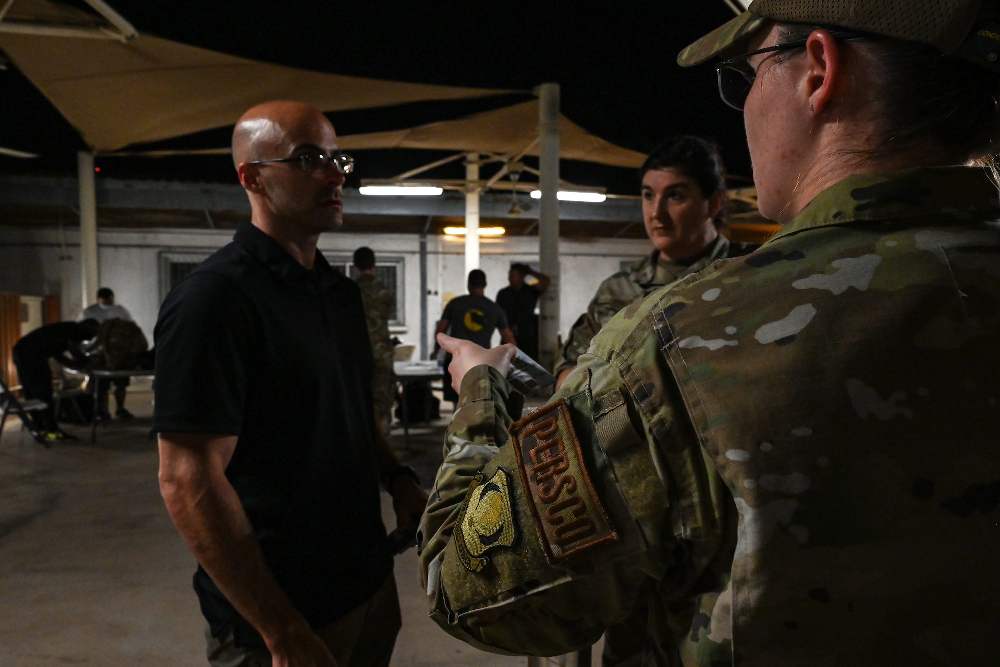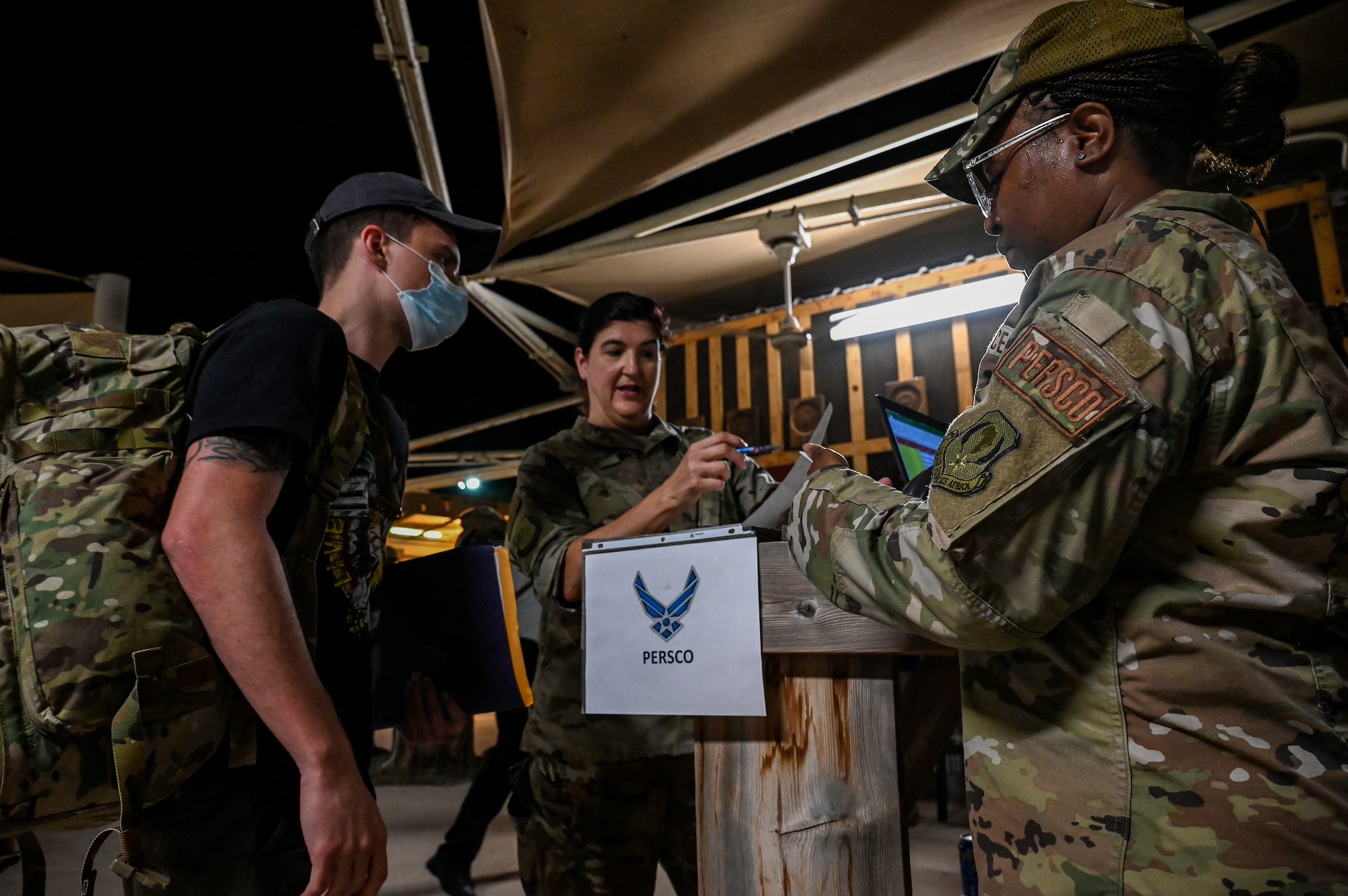 U.S. Air Force Tech Sgt. Ronda Esker, center, the Personnel Support for Contingency Operation (PERSCO) Deliberate and Crisis Action Planning and Execution Segments (DCAPES) operator assigned to the 449th Air Expeditionary Group (AEG) and U.S. Air Force Tech Sgt. Shatoria Davis, right, PERSCO team chief with the 449th AEG, in-processes new Airmen at Camp Lemonnier, Djibouti, July 7, 2021. The PERSCO team is responsible for total force accountability, casualty reporting and also helps with support functions such as reenlistments and processing awards. (U.S. Air Force photo by Senior Airman Taylor Davis)