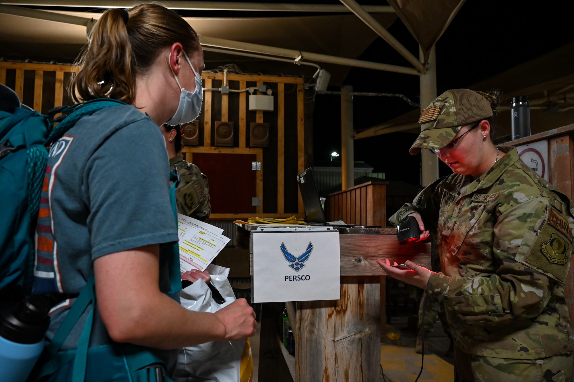 U.S. Air Force Staff Sgt. Cheyenne Hawkins, PERSCO sustainment non-commissioned officer in charge with the 449th AEG, scans an Airman’s military ID during in-processing at Camp Lemonnier, Djibouti, July 7, 2021. The PERSCO team uses the Deliberate and Crisis Action Planning and Execution Segments system (DCAPES) which is their main tool to keep track of accountability of all the Air Force members in East Africa. (U.S. Air Force photo by Senior Airman Taylor Davis)