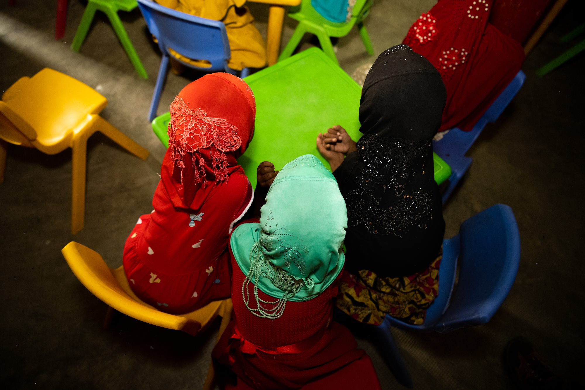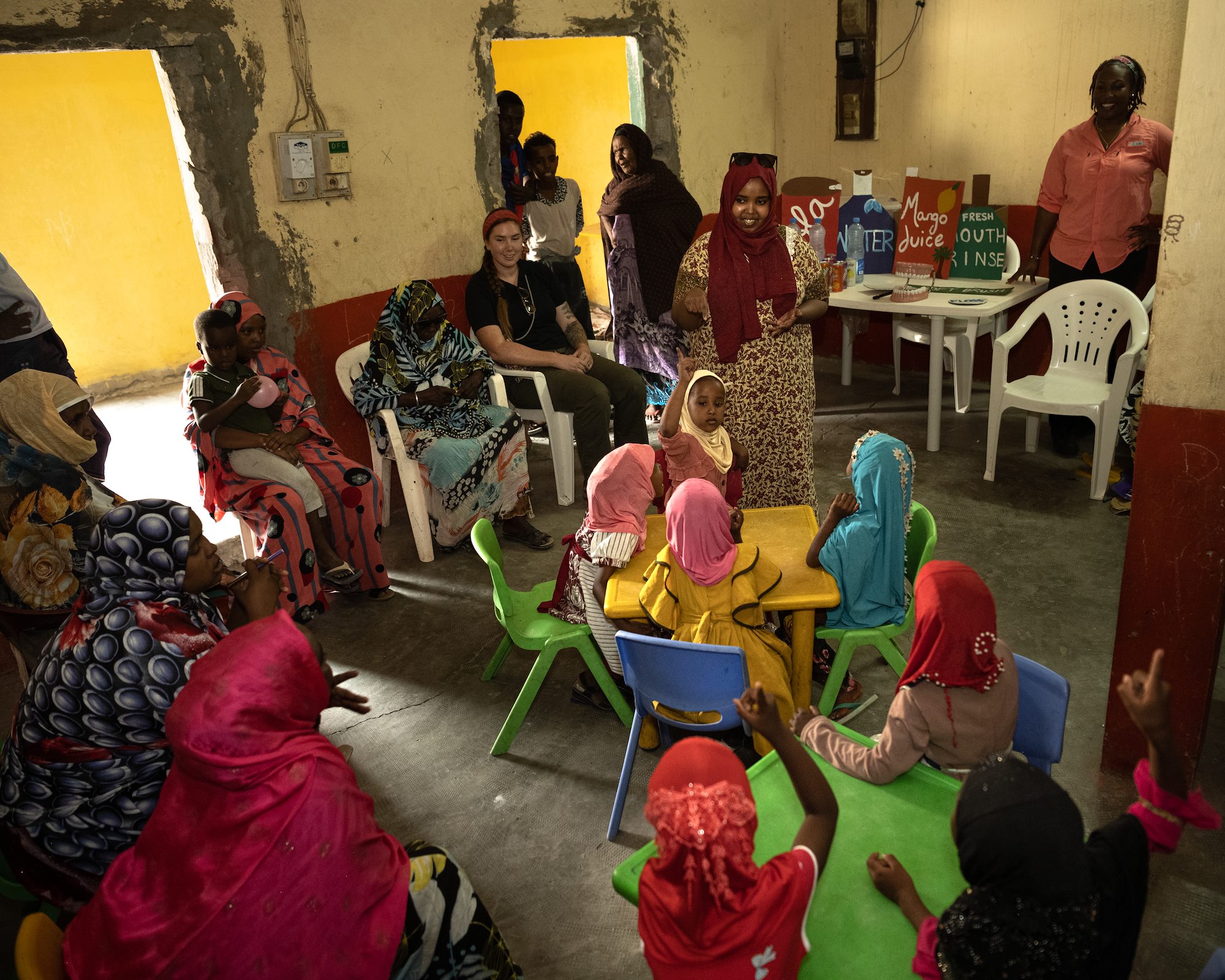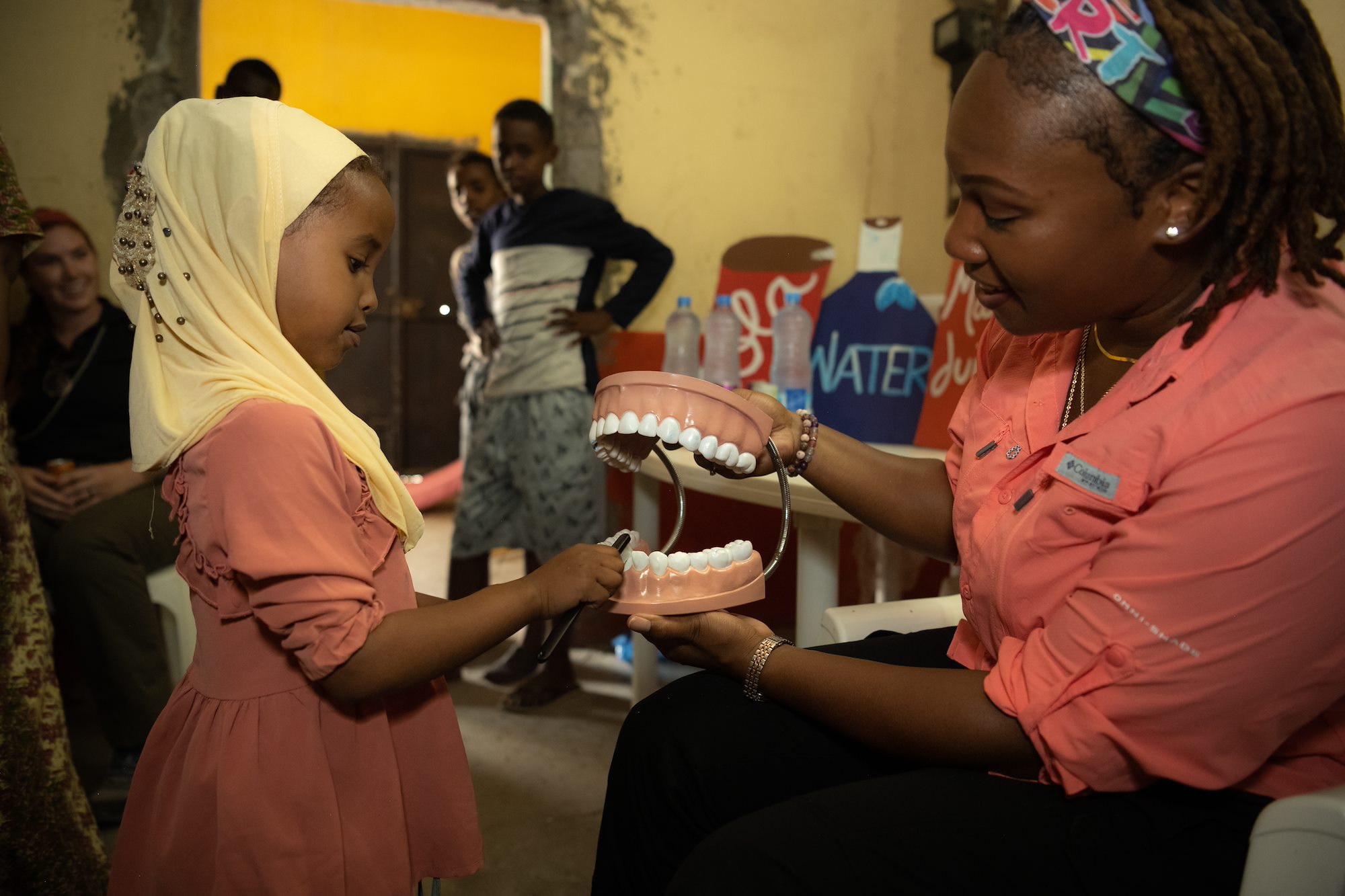 Djiboutian girls lean in to pay attention to an oral hygiene class led by U.S. Army Soldiers with the Civil Affairs Functional Specialty Team, Southern European Task Force – Africa, and hosted in partnership with the Association des Femmes de We’a in We’a, Djibouti, Aug. 11, 2021.