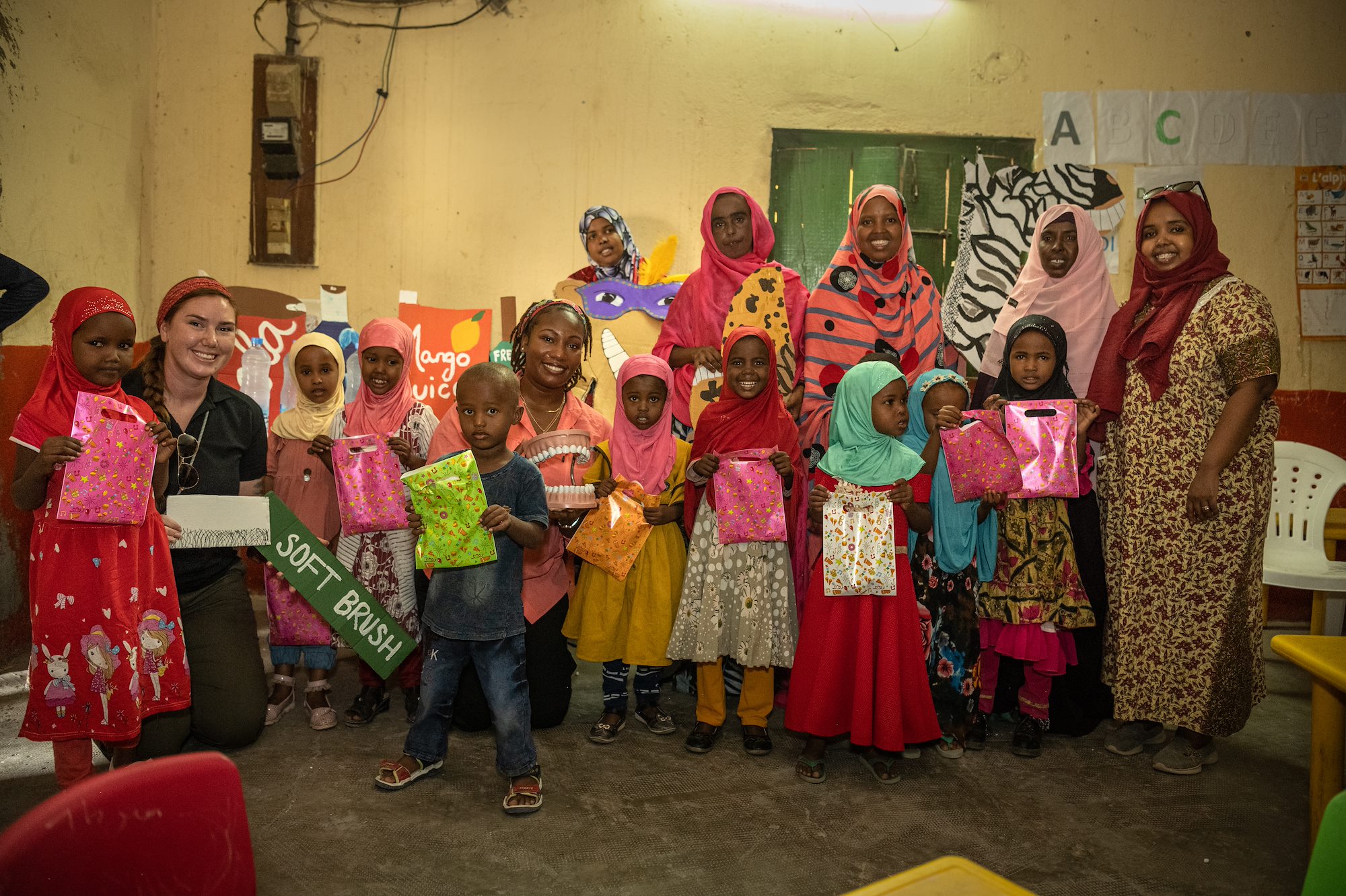 Children and teachers with the Association des Femmes de We’a and U.S. Army Soldiers with the Civil Affairs Functional Specialty Team, Southern European Task Force – Africa display their new dental supplies after completing an oral hygiene class in We’a, Djibouti, Aug. 11, 2021.