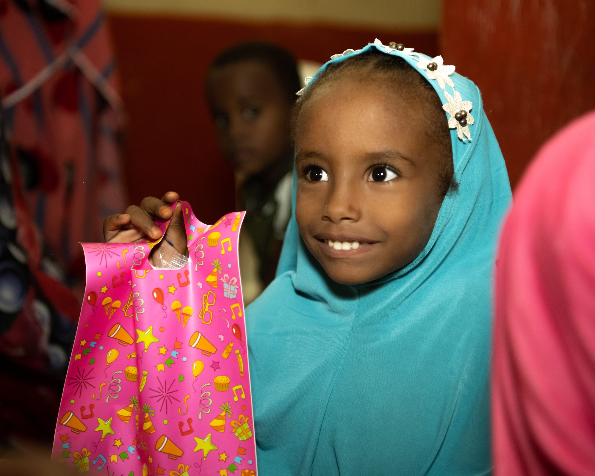 A Djiboutian schoolgirl holds a bag with dental hygiene products provided by U.S. Army Soldiers with the Civil Affairs Functional Specialty Team, Southern European Task Force – Africa as part of an oral hygiene class hosted in partnership with the Association des Femmes de We’a in We’a, Djibouti, Aug. 11, 2021.