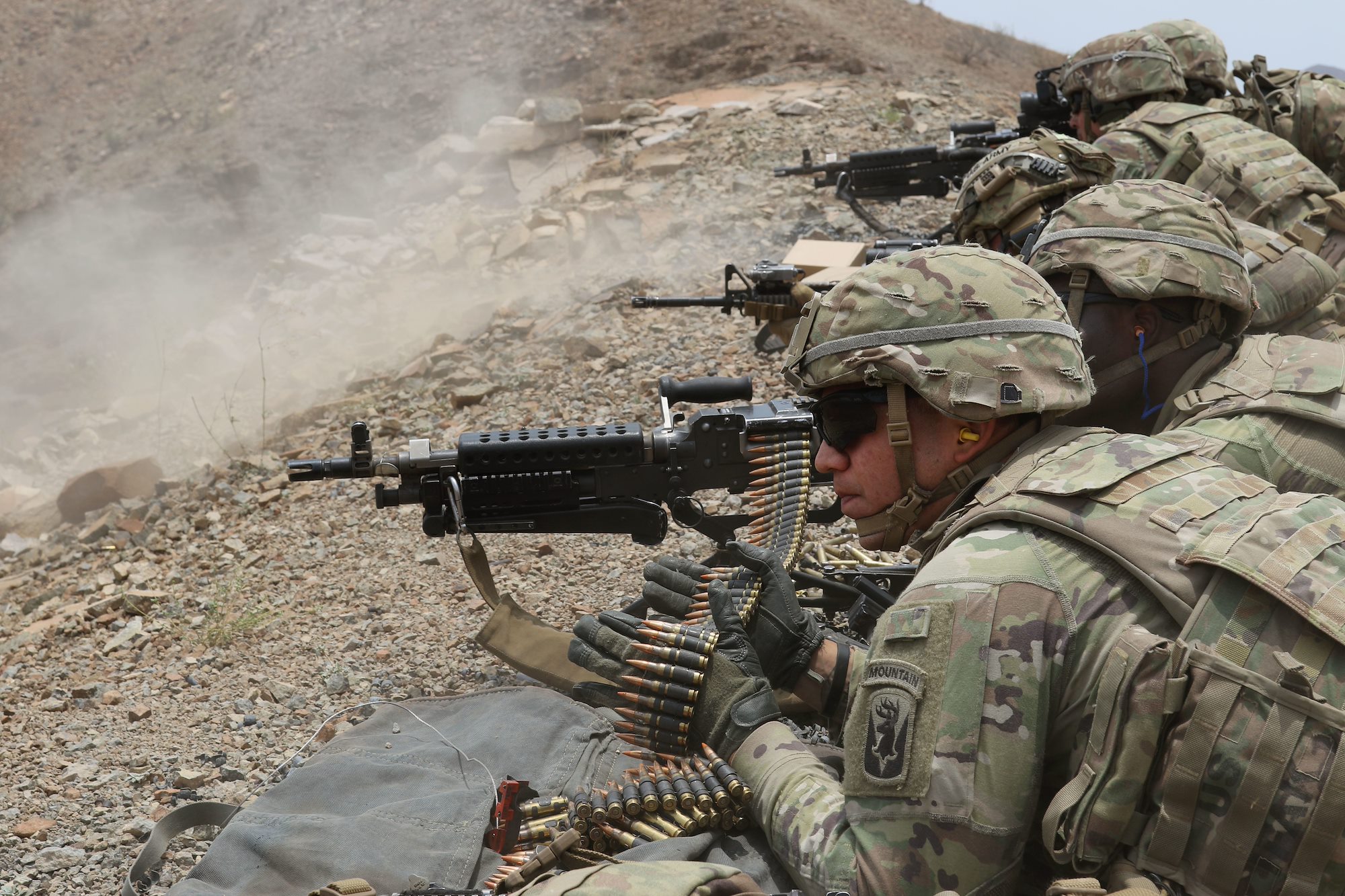 U.S. Army Soldiers assigned to the East Africa Response Force (EARF), Task Force Iron Gray, in support of Combined Joint Task Force-Horn of Africa, conduct a joint live fire exercise with French Forces assigned to 5th Overseas Intermarines Regiment (5e RIAOM) in Djibouti, May 17, 2021. The EARF provides a combat-ready rapid deployment capability to support crises operations in the U.S. Africa Command Area of Responsibility. (U.S. Army photo by Staff Sgt. Dustin Jordan)