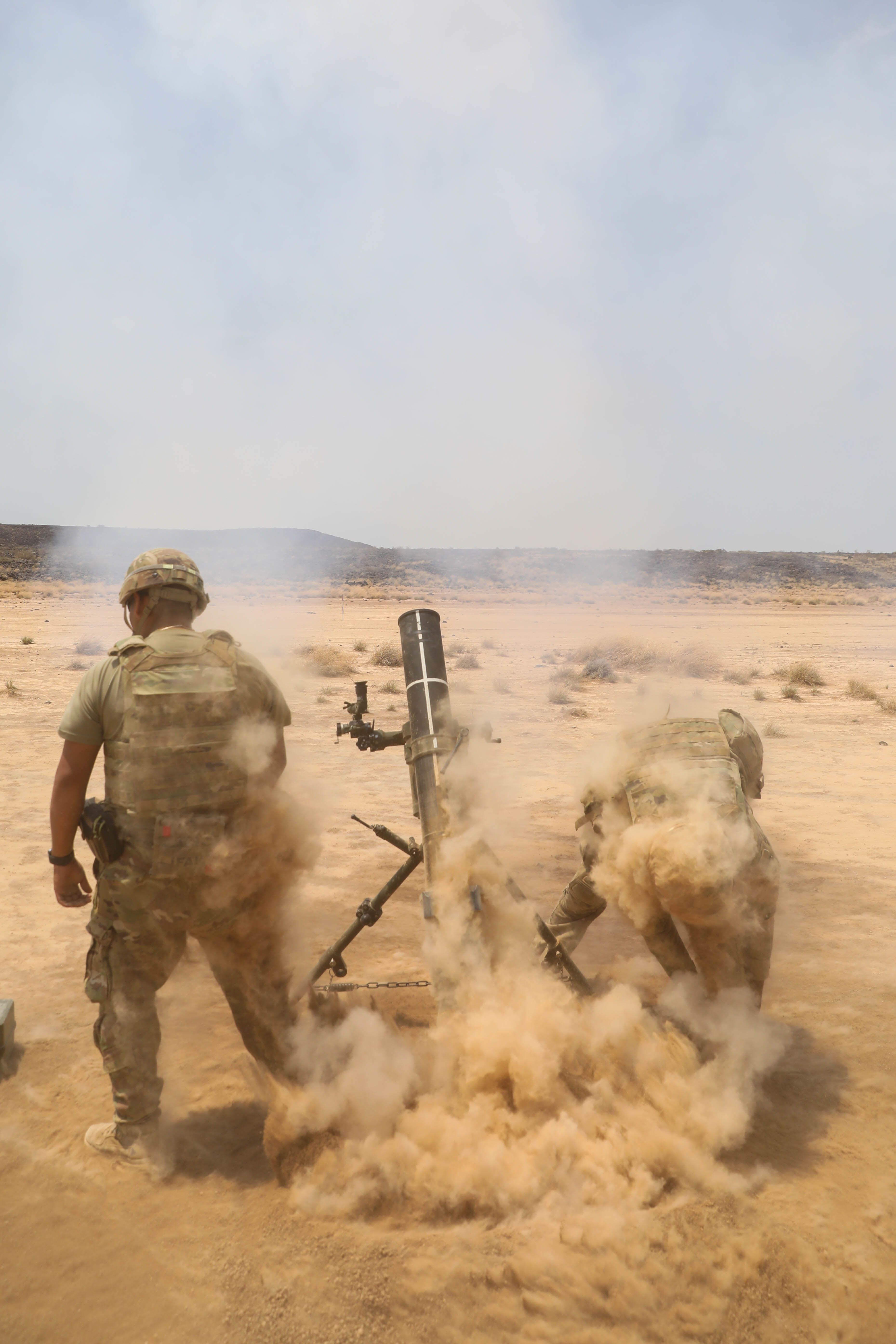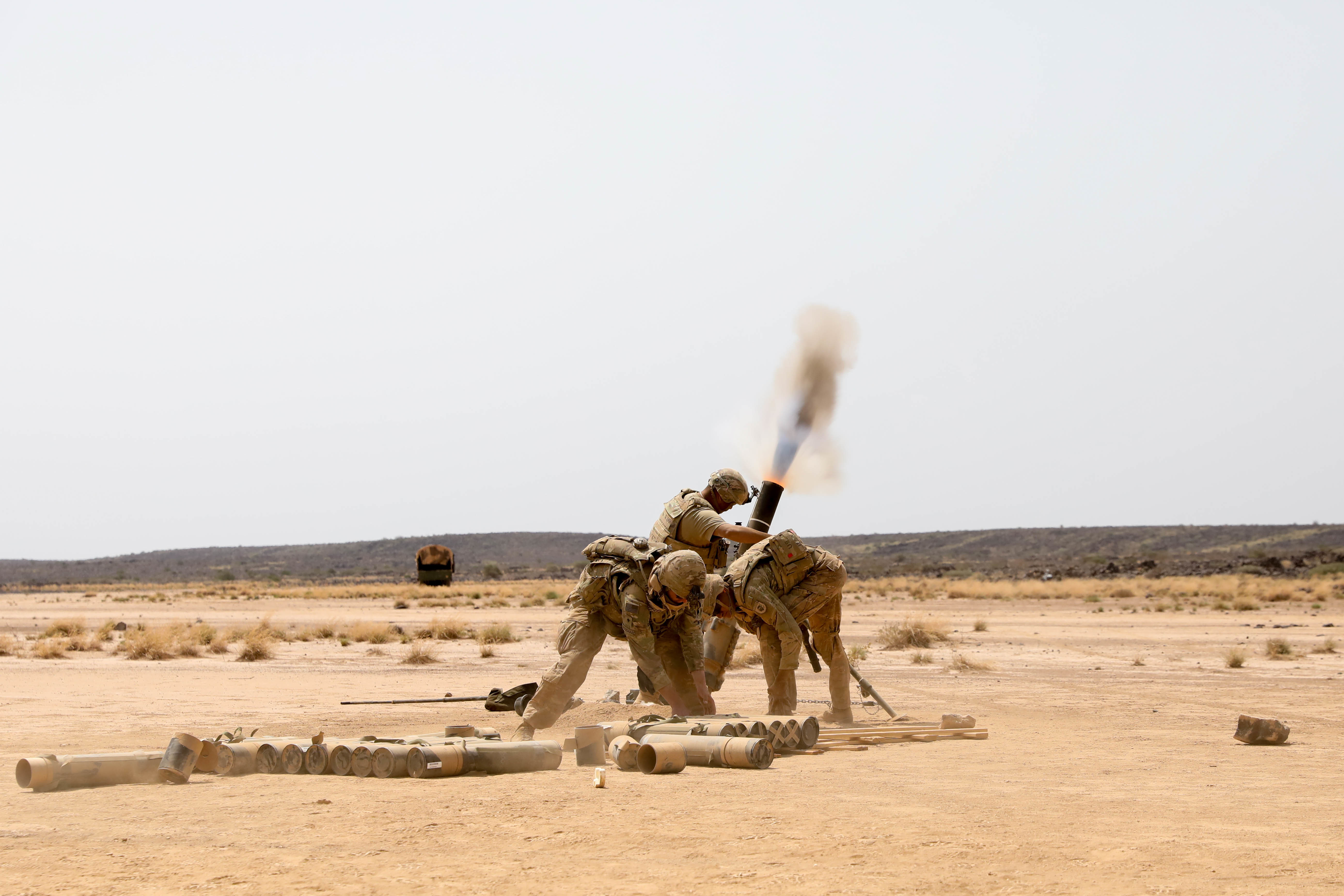 U.S. Army Soldiers with 1-102nd Infantry Regiment (Mountain), Task Force Iron Gray, Combined Joint Task Force-Horn of Africa (CJTF-HOA), fire 120mm mortars during a joint combined arms live-fire training exercise with French Soldiers assigned to the 5th Overseas Interarms Regiment (5e RIAOM) at the Djiboutian Range Complex, Djibouti, Aug. 11, 2021. This joint training exercise allowed both French and U.S. forces to work together to build regional cooperation and improve each nation's fighting force. CJTF-HOA, operating from Camp Lemonnier, Djibouti, regularly trains with and works alongside allied and partner nations, coalition forces, and interagency/intergovernmental organizations to achieve a unified effort in East Africa. (U.S. Army National Guard photo by Pfc. Gauret Stearns)