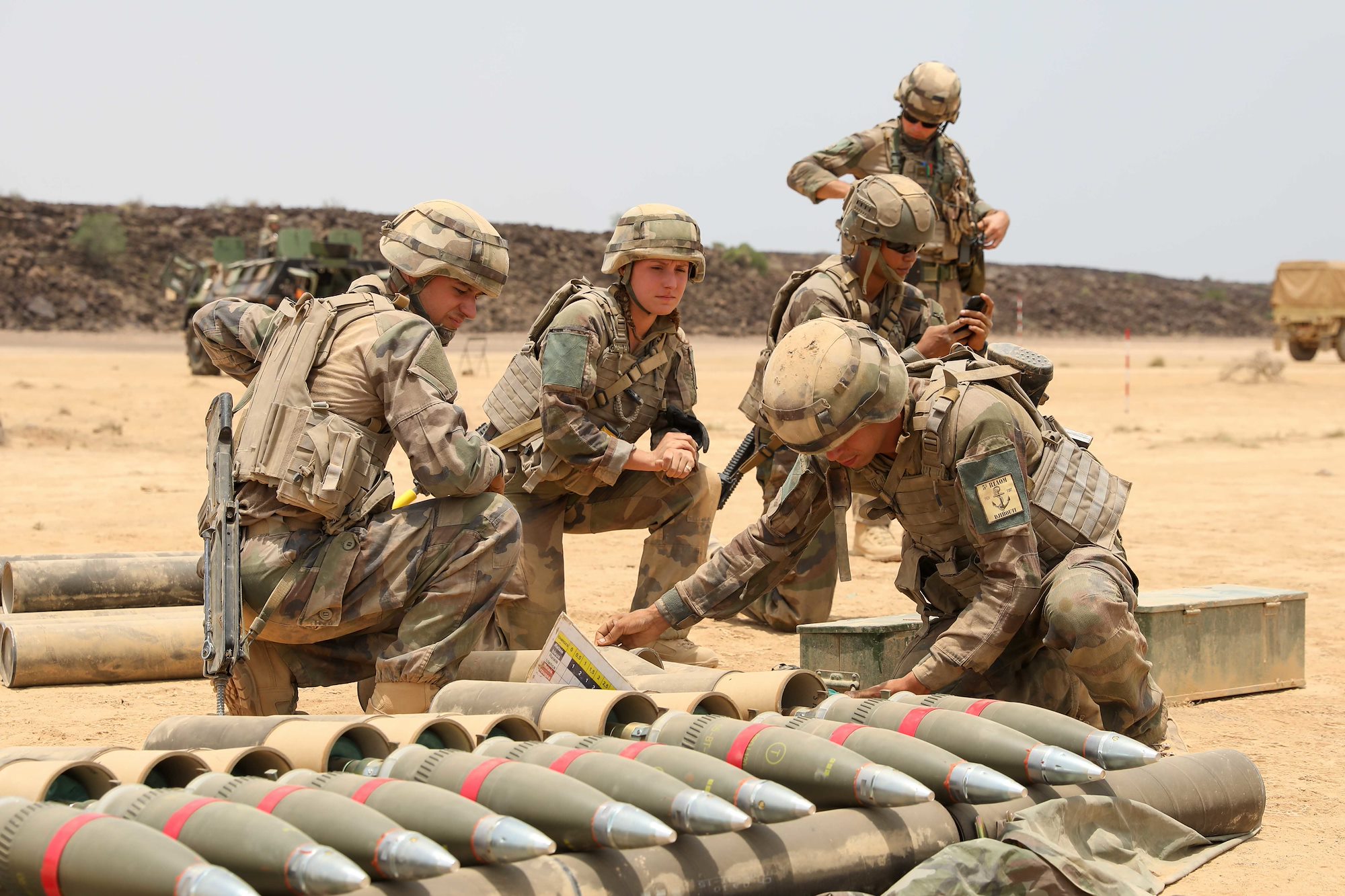 French Soldiers assigned to the 5th Overseas Interarms Regiment (5e RIAOM) prepare mortar shells during a joint combined arms live-fire training exercise with U.S. Army Soldiers from 1-102nd Infantry Regiment (Mountain), Task Force Iron Gray, Combined Joint Task Force-Horn of Africa (CJTF-HOA), at the Djiboutian Range Complex, Djibouti, Aug. 11, 2021. This joint training exercise allowed both French and U.S. forces to work together to build regional cooperation and improve each nation's fighting force. CJTF-HOA, operating from Camp Lemonnier, Djibouti, regularly trains with and works alongside allied and partner nations, coalition forces, and interagency/intergovernmental organizations to achieve a unified effort in East Africa. (U.S. Army National Guard photo by Pfc. Gauret Stearns)