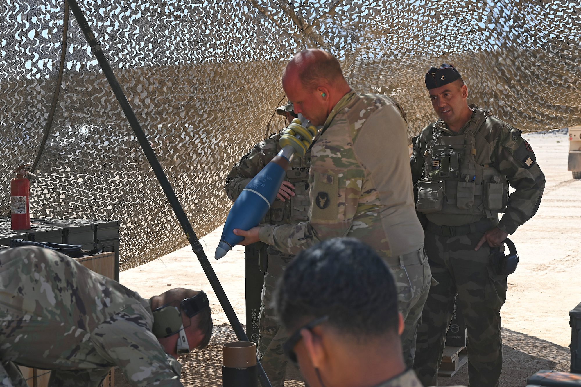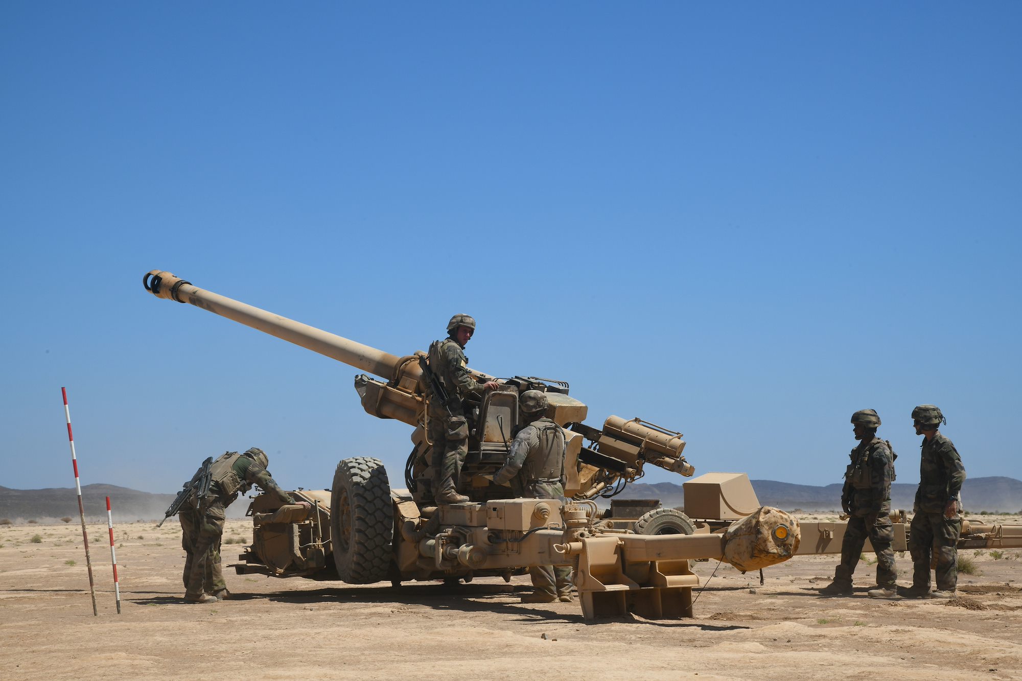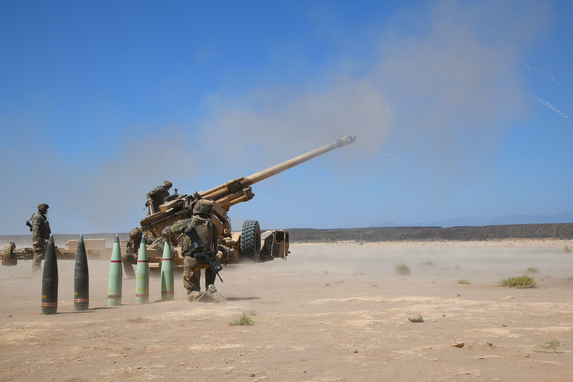 U.S. Army Soldiers assigned to the East Africa Response Force (EARF) in support of the Combined Joint Task Force-Horn of Africa (CJTF-HOA) and French Soldiers assigned to the 5th Overseas Intermarines Regiment (RIAOM) participate in a live-fire joint artillery training event at the Djiboutian Range Complex, Djibouti, Feb. 2, 2021. The purpose of the joint training was to share French and U.S. Army artillery techniques and further the relationship between EARF Soldiers and the 5th RIAOM. (U.S. Air Force photo by Tech. Sgt. Dana J. Cable)