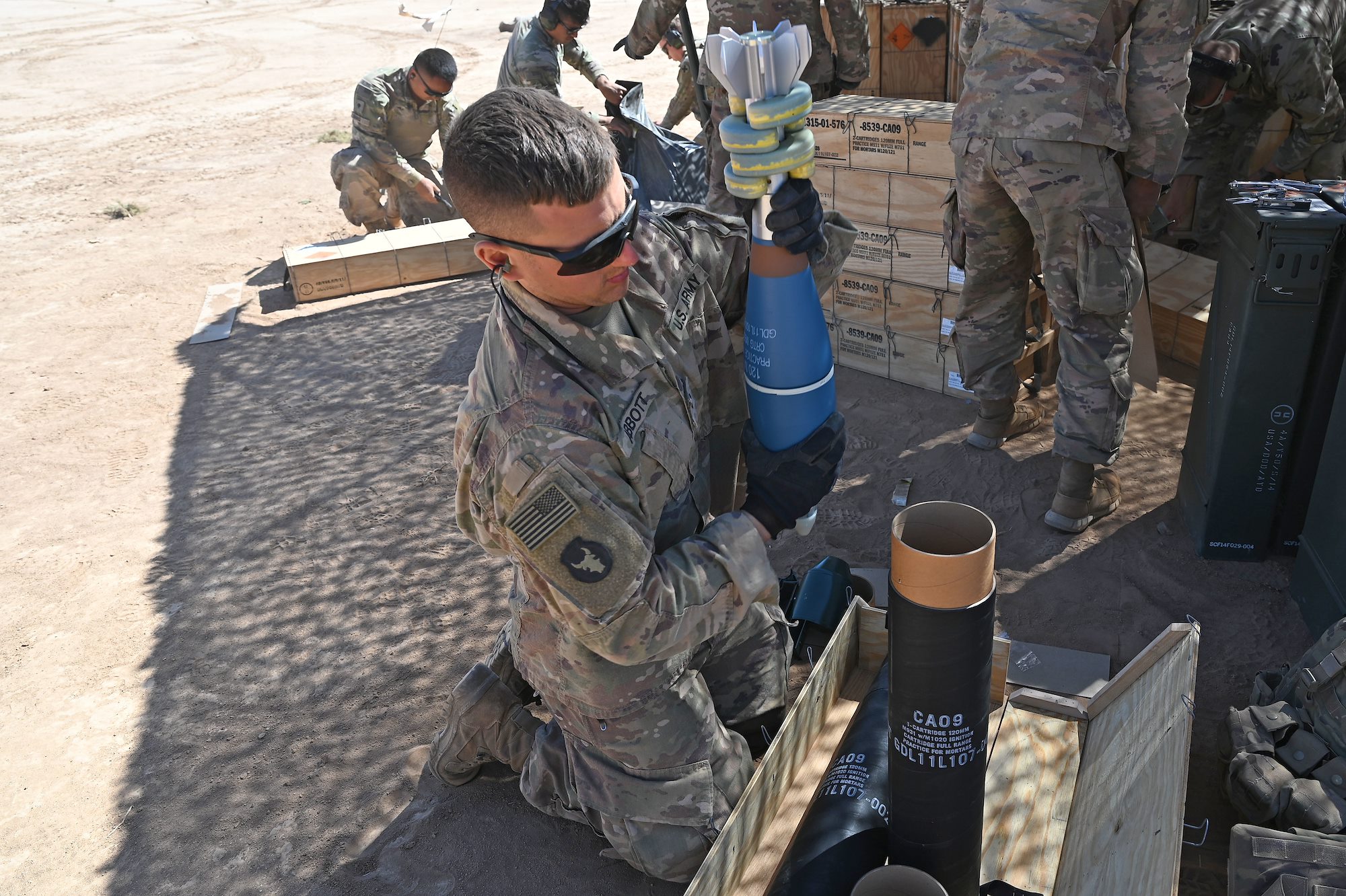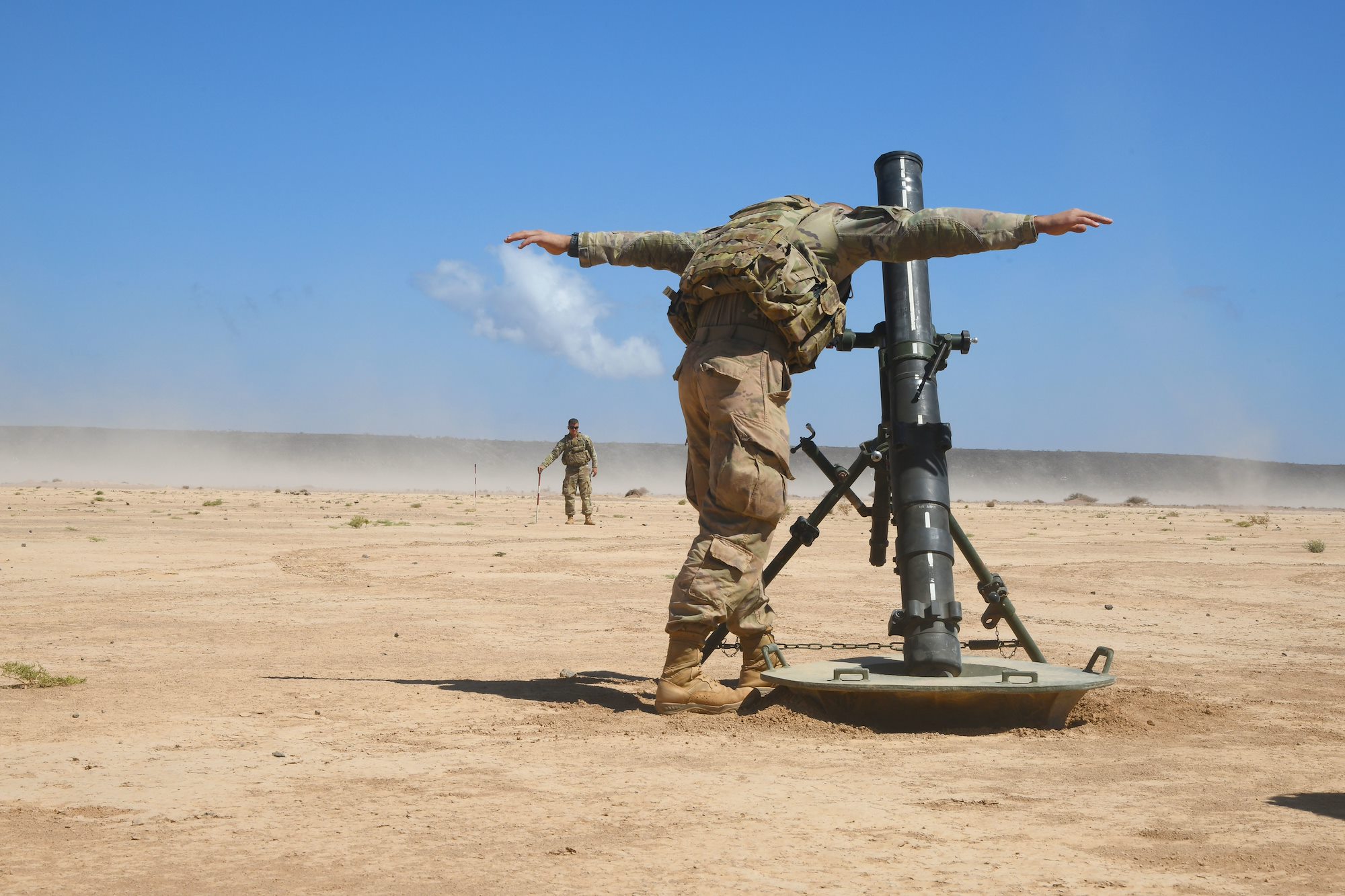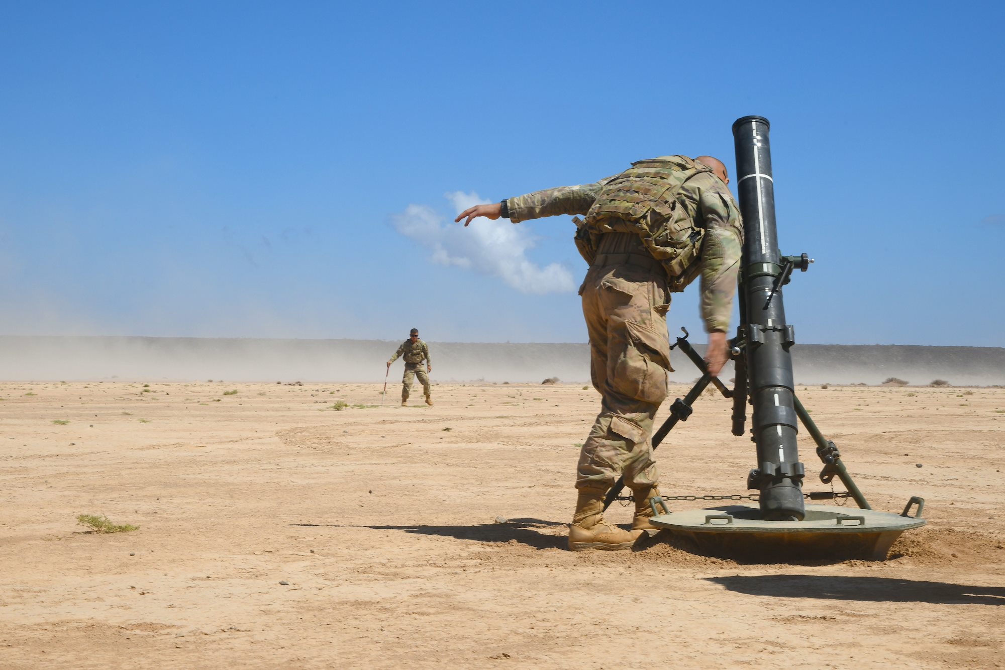 U.S. Army Soldiers assigned to the East Africa Response Force (EARF) in support of the Combined Joint Task Force-Horn of Africa (CJTF-HOA) and French Soldiers assigned to the 5th Overseas Intermarines Regiment (RIAOM) participate in a live-fire joint artillery training event at the Djiboutian Range Complex, Djibouti, Feb. 2, 2021. The purpose of the joint training was to share French and U.S. Army artillery techniques and further the relationship between EARF Soldiers and the 5th RIAOM. (U.S. Air Force photo by Tech. Sgt. Dana J. Cable)
