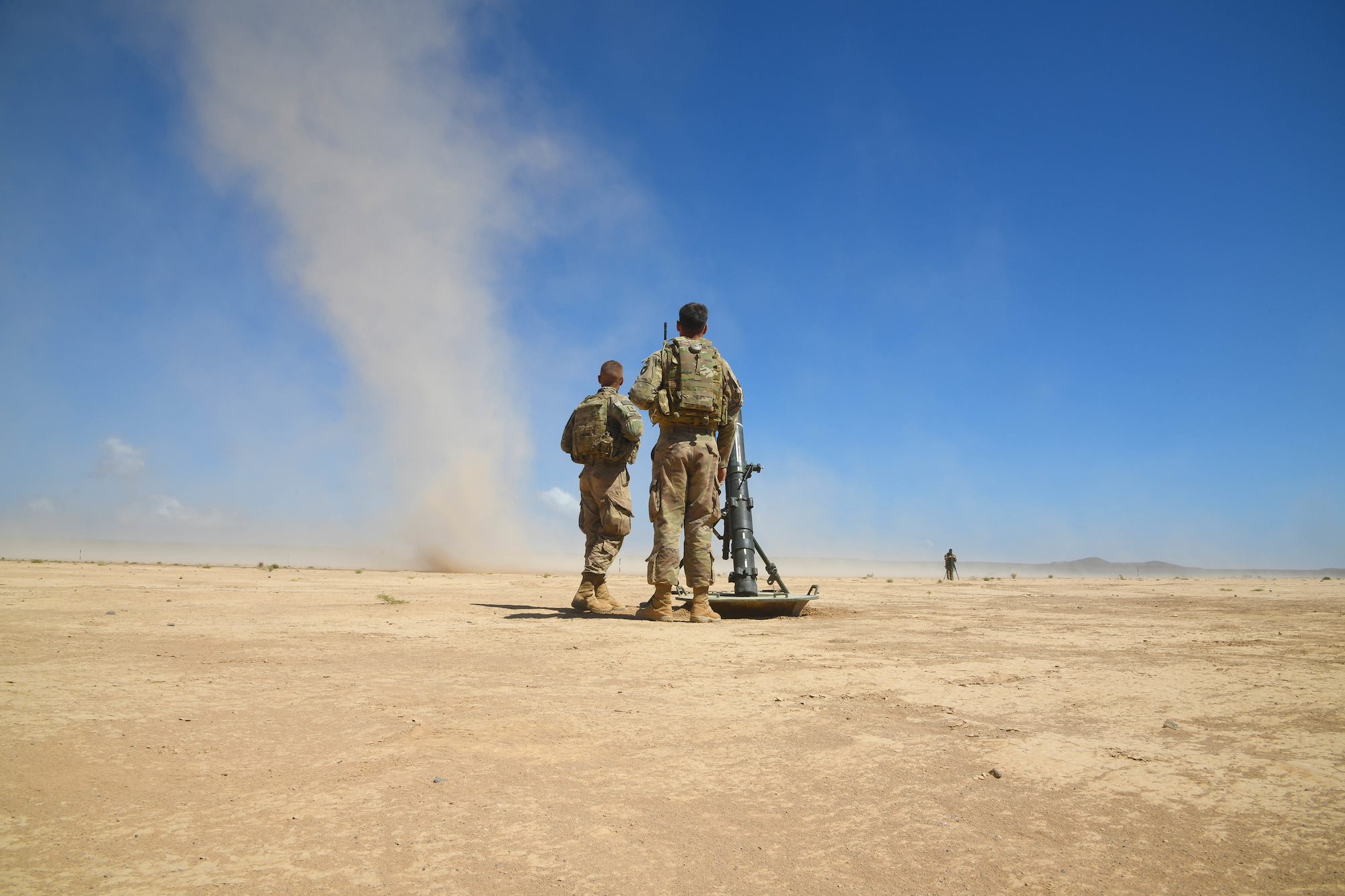 U.S. Army Soldiers assigned to the East Africa Response Force (EARF) in support of the Combined Joint Task Force-Horn of Africa (CJTF-HOA) and French Soldiers assigned to the 5th Overseas Intermarines Regiment (RIAOM) participate in a live-fire joint artillery training event at the Djiboutian Range Complex, Djibouti, Feb. 2, 2021. U.S. and French forces took turns firing their weapons systems and demonstrating their capabilities. (U.S. Air Force Photo by Senior Airman Kristin Savage)