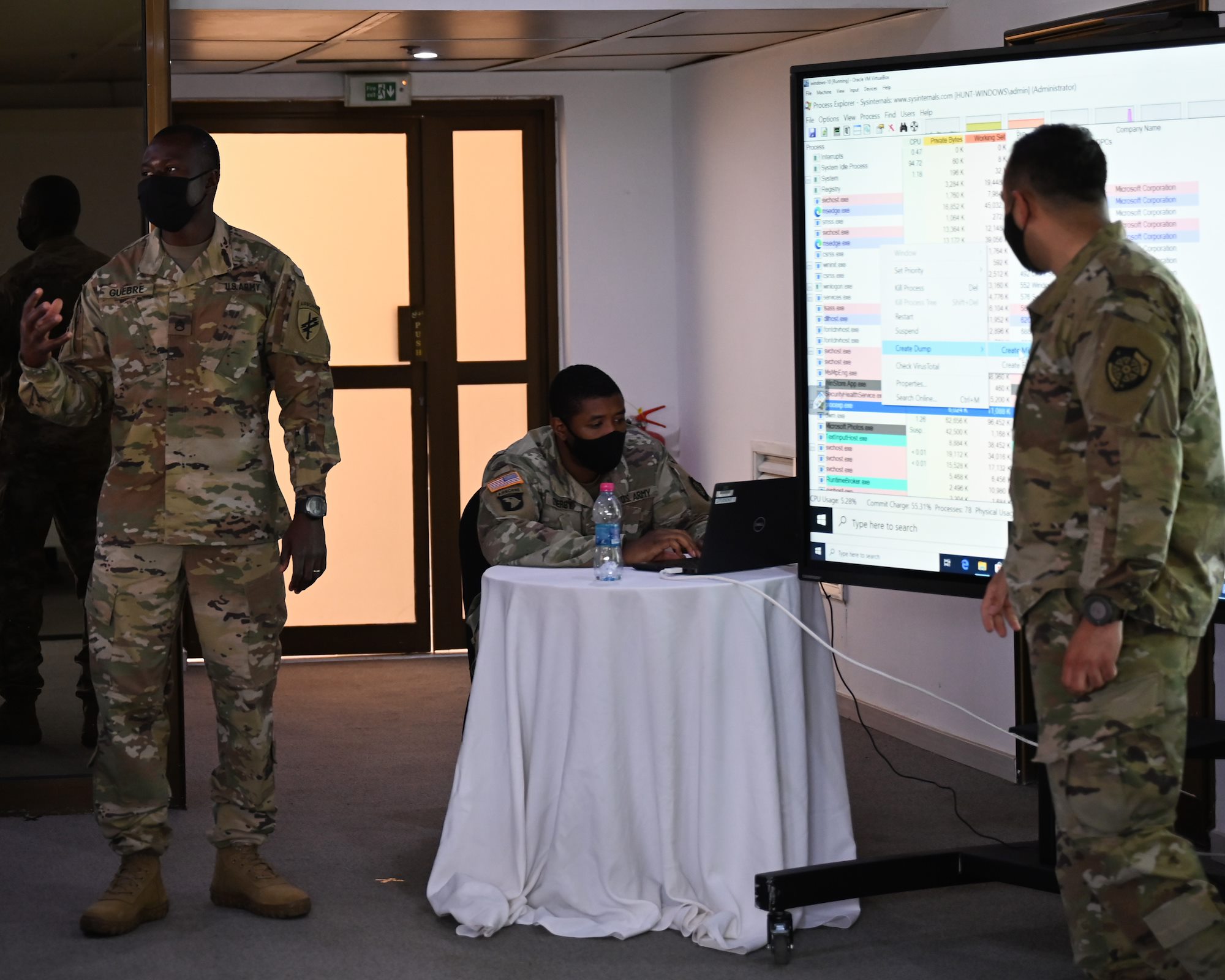 U.S. Army Soldiers assigned to the 200 Cyber Protection Team, Fort Gordon, Georgia, and a U.S. Army Soldier assigned to Combined Joint Task Force- Horn of Africa (CJTF-HOA), lead a cyber-defense and inoperability engagement at the Sheraton Hotel, Djibouti, Feb. 14, 2021. As a result of the event, Djibouti, France and the United States will be better equipped to communicate and collaborate more efficiently. (U.S. Air Force photo by Senior Airman Taylor Davis)