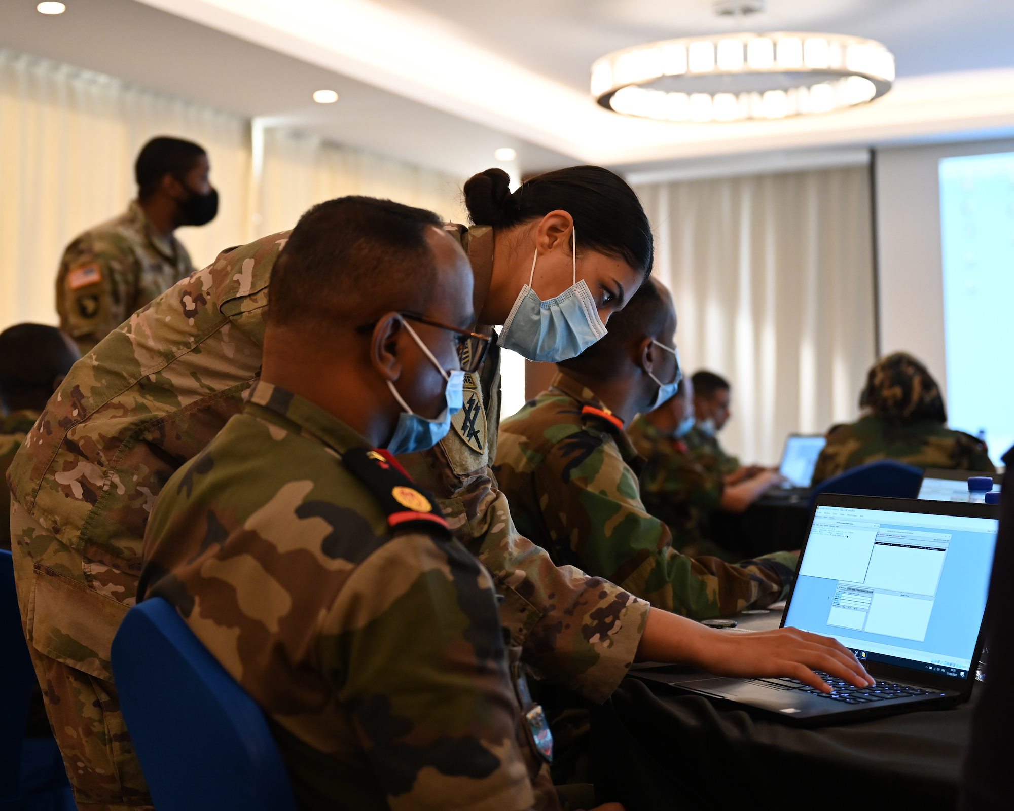 U.S. Army Spc. Quret Ain, a member of Civil Affairs East Africa, in support of Combined Joint Task Force- Horn of Africa (CJTF-HOA), helps a soldier assigned to the Armed Forces of Djibouti (FAD) during a cyber defense engagement at the Sheraton Hotel, Djibouti, Feb. 17, 2021. The engagement allowed participants to improve their ability to communicate securely and improve their cyber defense interoperability. (U.S. Air Force photo by Senior Airman Taylor Davis)