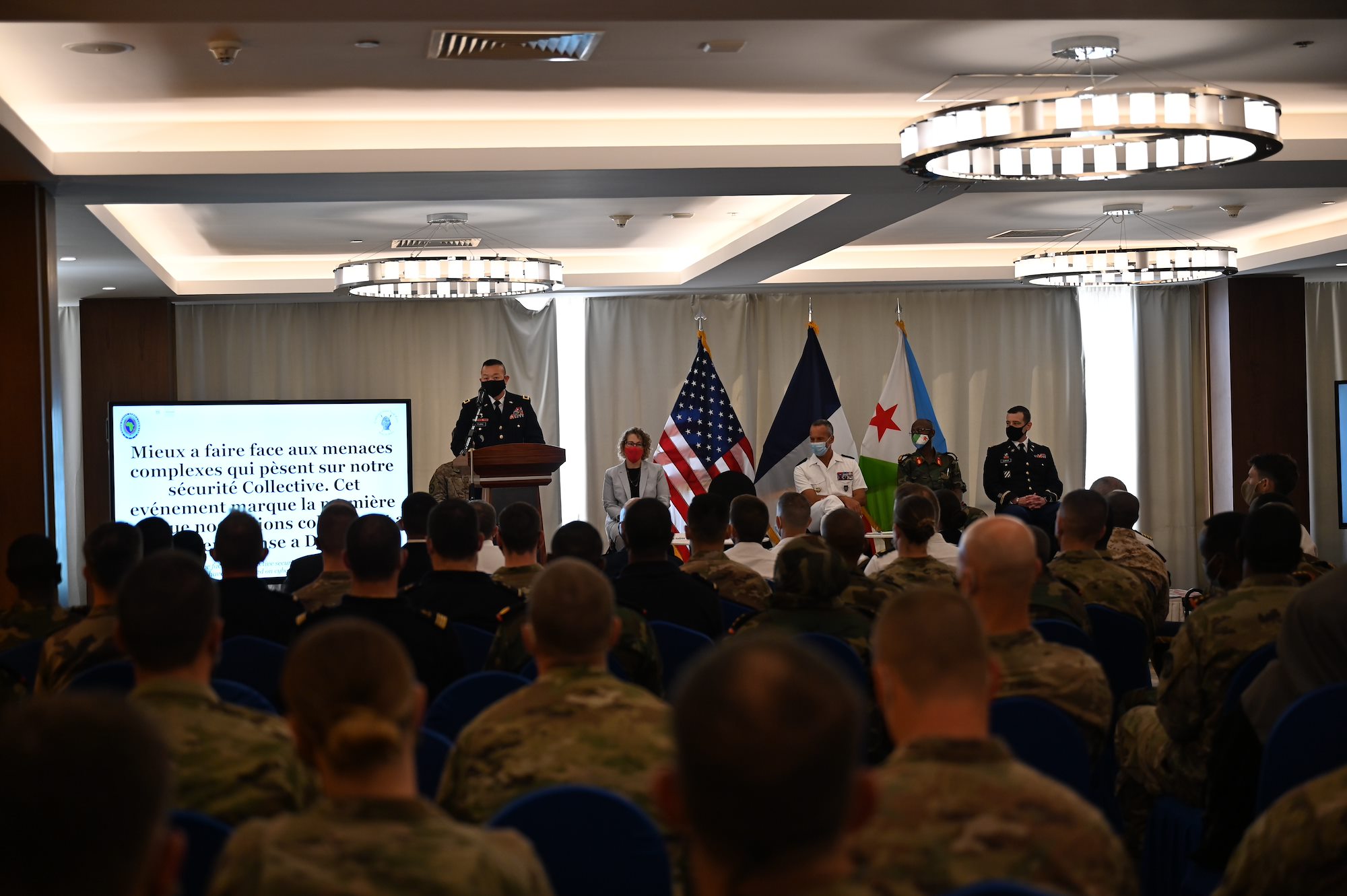 U.S. Army Maj. Gen. Lapthe C. Flora, commander, Combined Joint Task Force- Horn of Africa (CJTF-HOA), speaks at the Cyber Defense and Interoperability Engagement closing ceremony at the Sheraton Hotel, Djibouti, Feb. 18, 2021. Participants of the engagement participated in four days of collaboration between the United States, Djibouti, and France in an effort to improve the three partner nation’s ability to communicate securely. (U.S. Air Force photo by Senior Airman Taylor Davis)