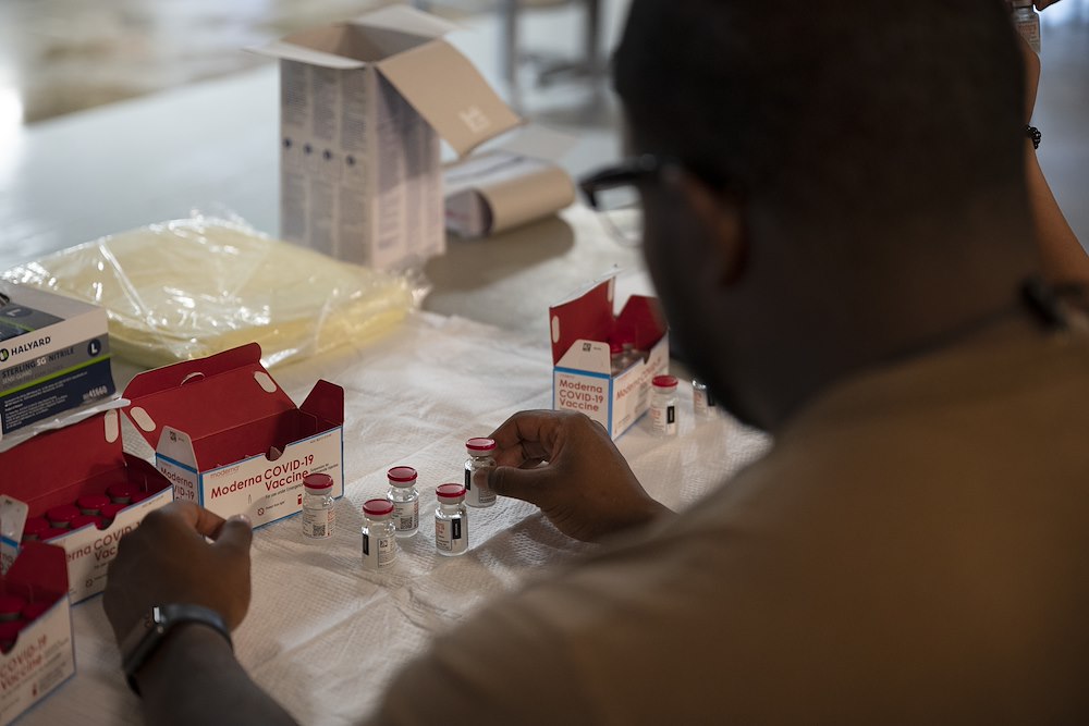 U.S. Navy Hospital Corpsman 2nd Class Quentin Denzel Foley, a preventive medicine technician with the Expeditionary Medical Facility (EMF), prepares the COVID-19 vaccine for use at Camp Lemonnier, Djibouti, Feb. 27, 2021. The vaccine was kept at a frozen state at minus 25 C to minus 15 C and thawed the day of use in order to maintain its viability. (U.S. Air Force photo by Senior Airman Taylor Davis)