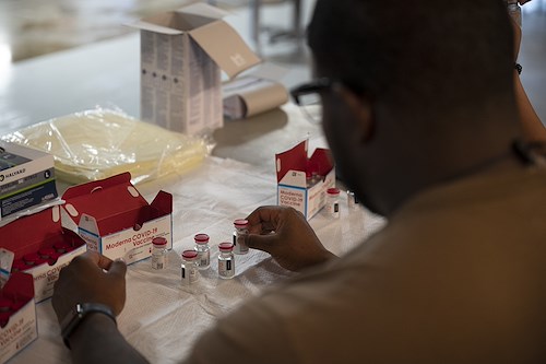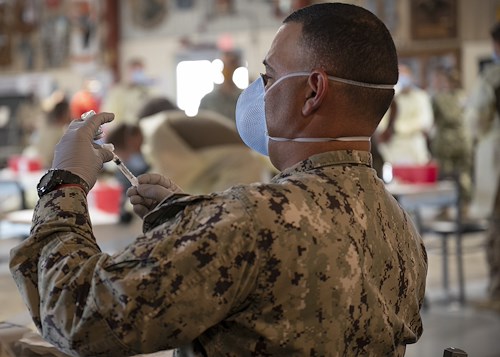U.S. Navy Lt. David Cruz, the preventive medicine department head with the Expeditionary Medical Facility (EMF), prepares the COVID-19 vaccine for use at Camp Lemonnier, Djibouti, Feb. 27, 2021. Medical personnel at Camp Lemonnier administered the first round of the vaccine to around 600 people. (U.S. Air Force photo by Senior Airman Taylor Davis)
