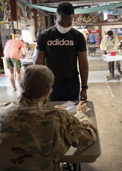 A medical member at Camp Lemonnier checks in a COVID-19 vaccine volunteer at Camp Lemonnier, Djibouti, Feb. 27, 2021. The medical team at Camp Lemonnier set up various stations in order to make the vaccination process as efficient, safe and quick as possible. (U.S. Air Force photo by Senior Airman Taylor Davis)