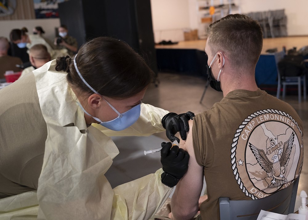 U.S. Army Staff. Sgt. Kristin Zimmerman, a civil affairs team medic with Civil Affairs East Africa, administers the COVID-19 vaccine at Camp Lemonnier, Djibouti, Feb. 27, 2021. Though the vaccine is voluntary, around 1,100 personnel at Camp Lemonnier have now received their first round of the COVID-19 vaccine. (U.S. Air Force photo by Senior Airman Taylor Davis)