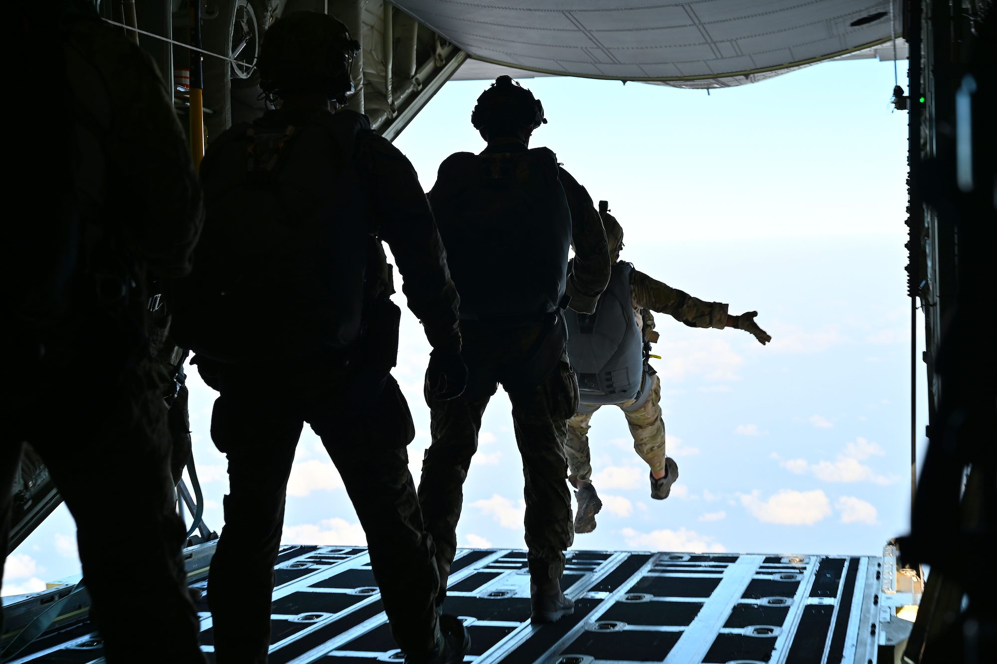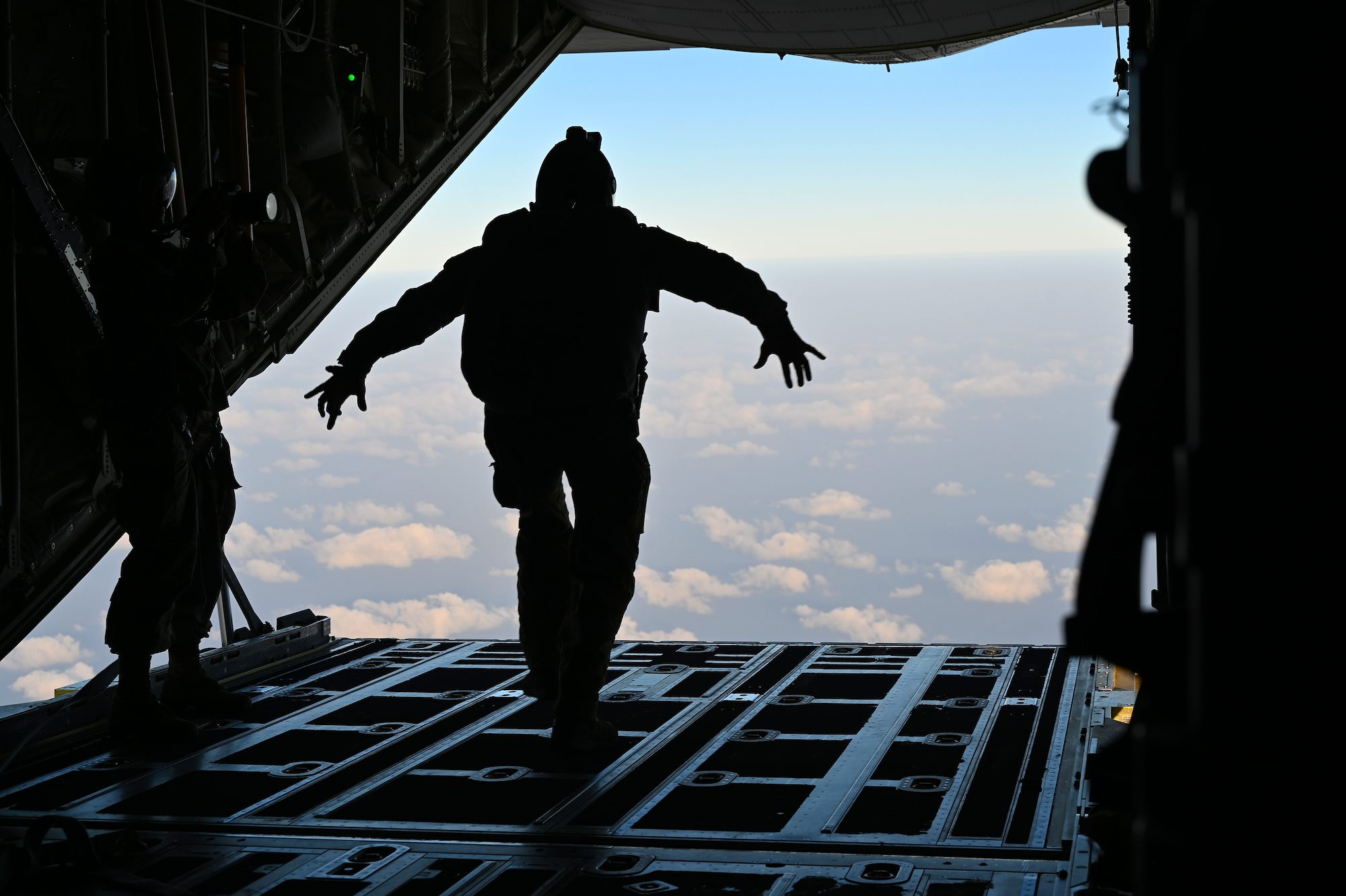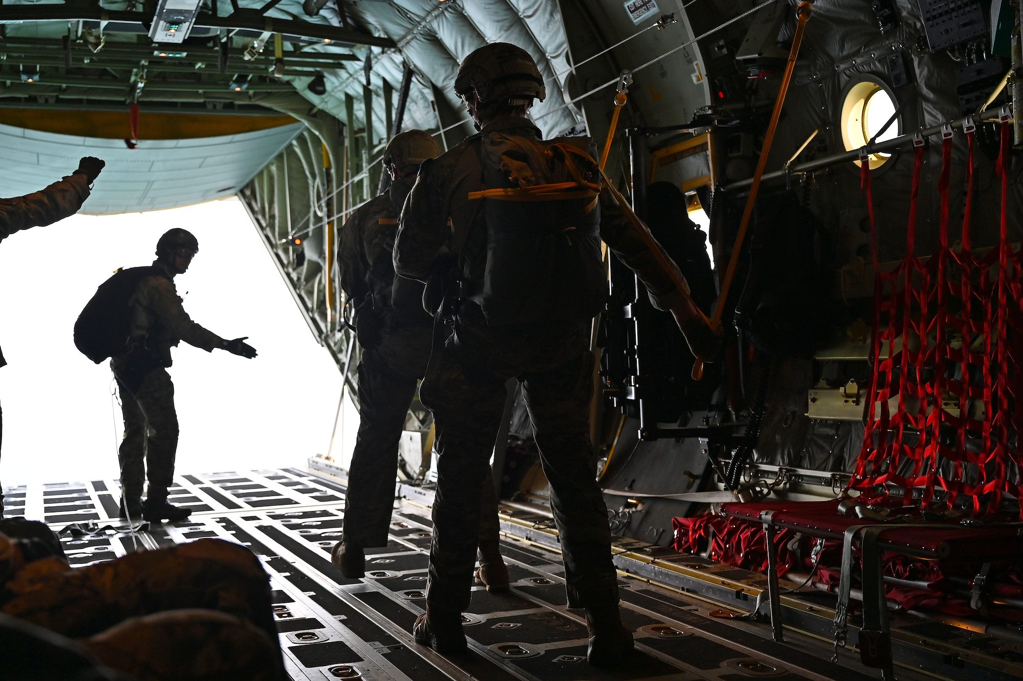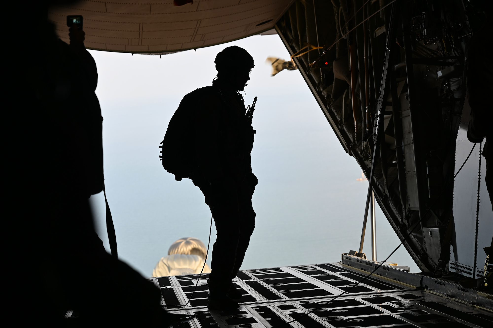 U.S. Air Force Senior Airman Kirk Mumau, 75th Expeditionary Airlift Squadron loadmaster, watches as pararescuemen jump out of C-130J Super Hercules over East Africa, Dec. 24, 2020. The 75th EAS supports Combined Joint Task Force-Horn of Africa (CJTF-HOA) with medical evacuations, disaster relief, humanitarian and airdrop operations. (U.S. Air Force photo by Tech. Sgt. Dana J. Cable)