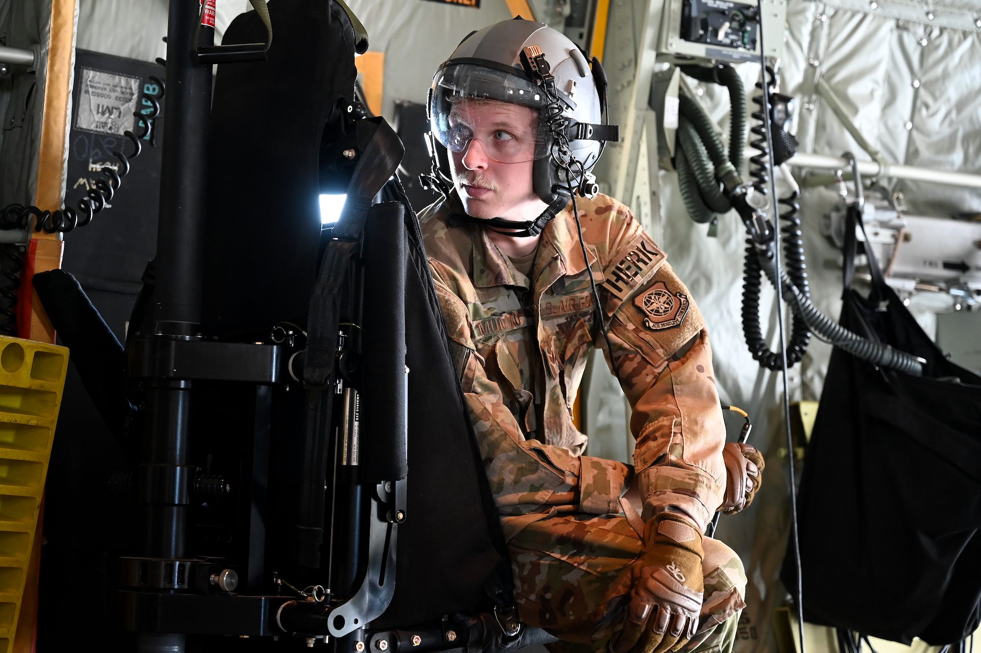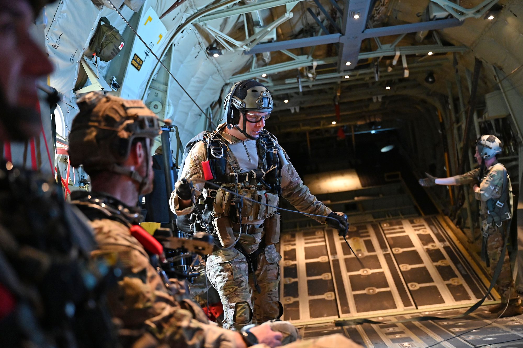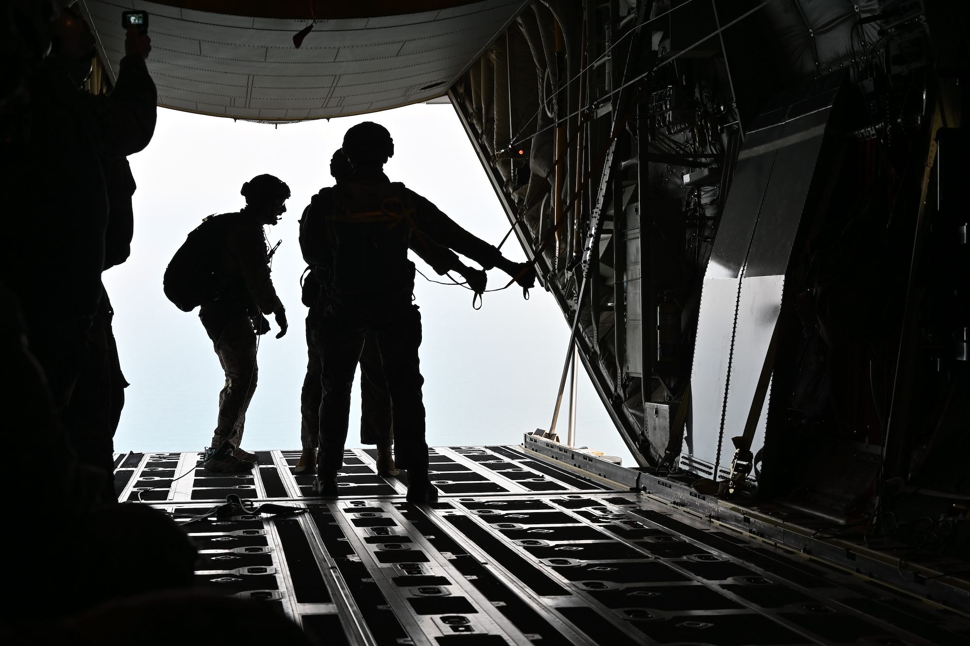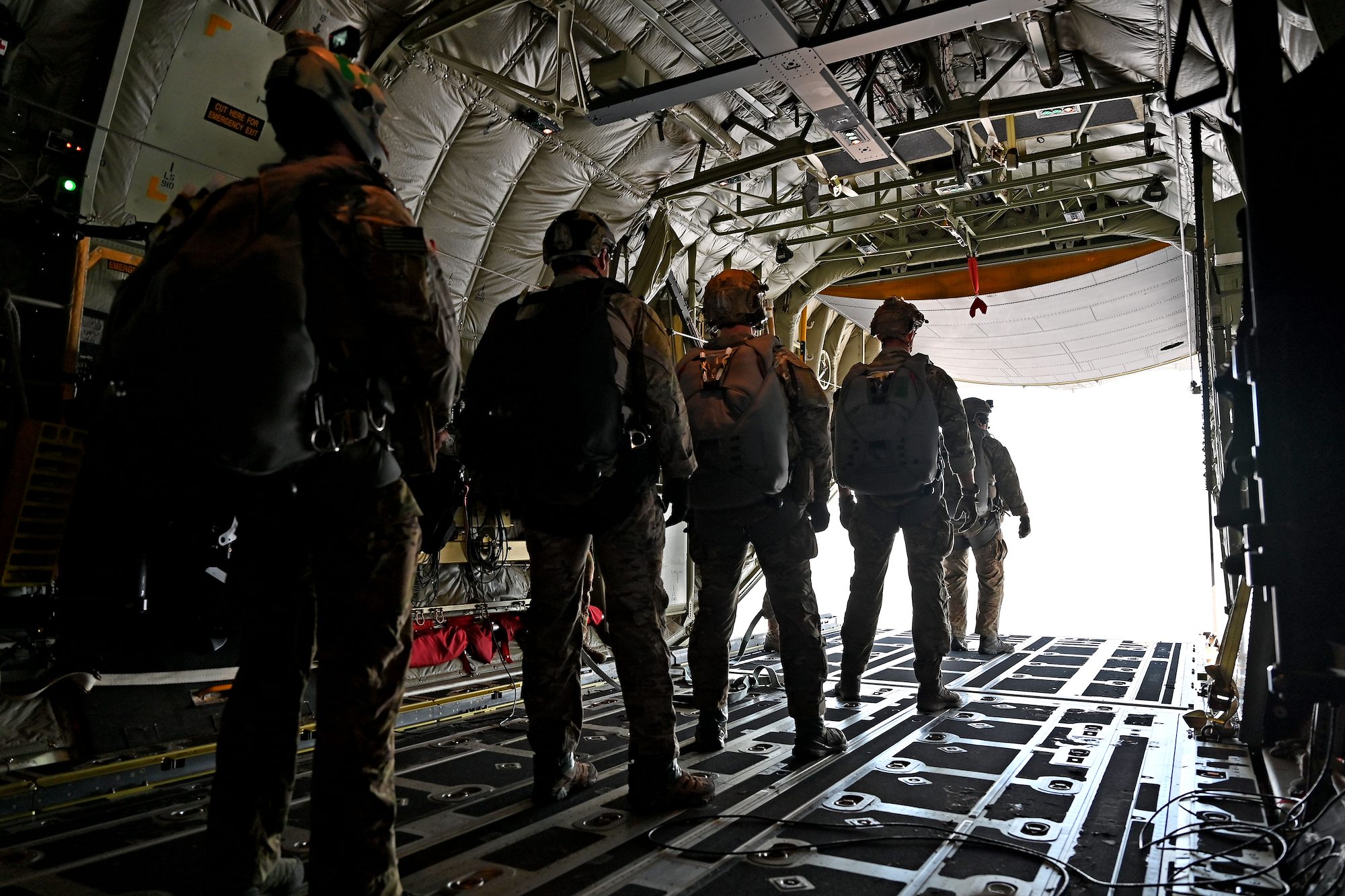 U.S. Air Force Senior Airman Kirk Mumau, 75th Expeditionary Airlift Squadron loadmaster, watches as pararescuemen jump out of C-130J Super Hercules over East Africa, Dec. 24, 2020. The 75th EAS supports Combined Joint Task Force-Horn of Africa (CJTF-HOA) with medical evacuations, disaster relief, humanitarian and airdrop operations. (U.S. Air Force photo by Tech. Sgt. Dana J. Cable)
