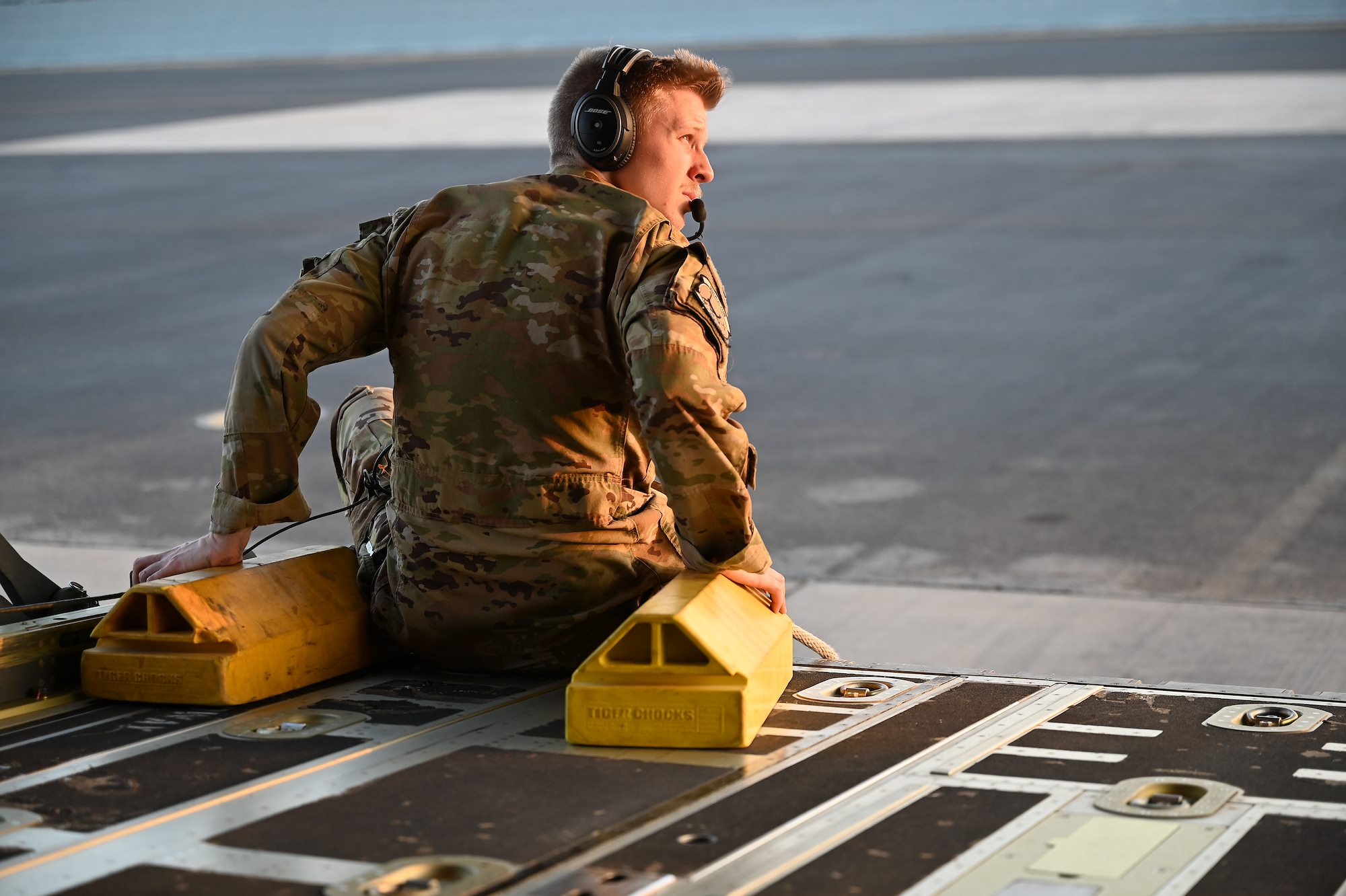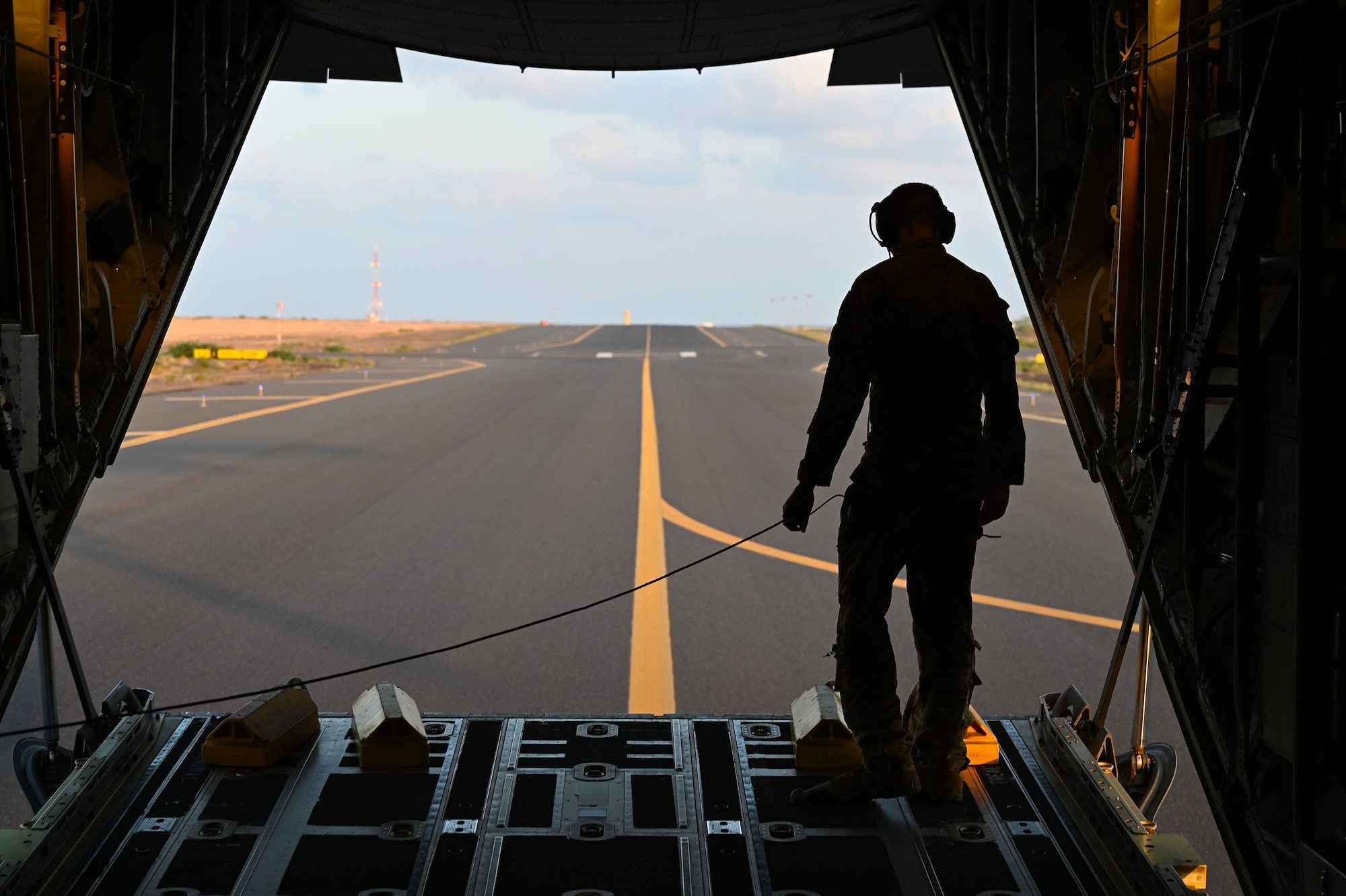 U.S. Air Force Senior Airman Kirk Mumau, 75th Expeditionary Airlift Squadron loadmaster, stands in the back of C-130J Super Hercules as it prepares to park at Camp Lemonnier, Djibouti, Dec. 24, 2020. The 75th EAS supports Combined Joint Task Force-Horn of Africa (CJTF-HOA) with medical evacuations, disaster relief, humanitarian and airdrop operations. (U.S. Air Force photo by Tech. Sgt. Dana J. Cable)