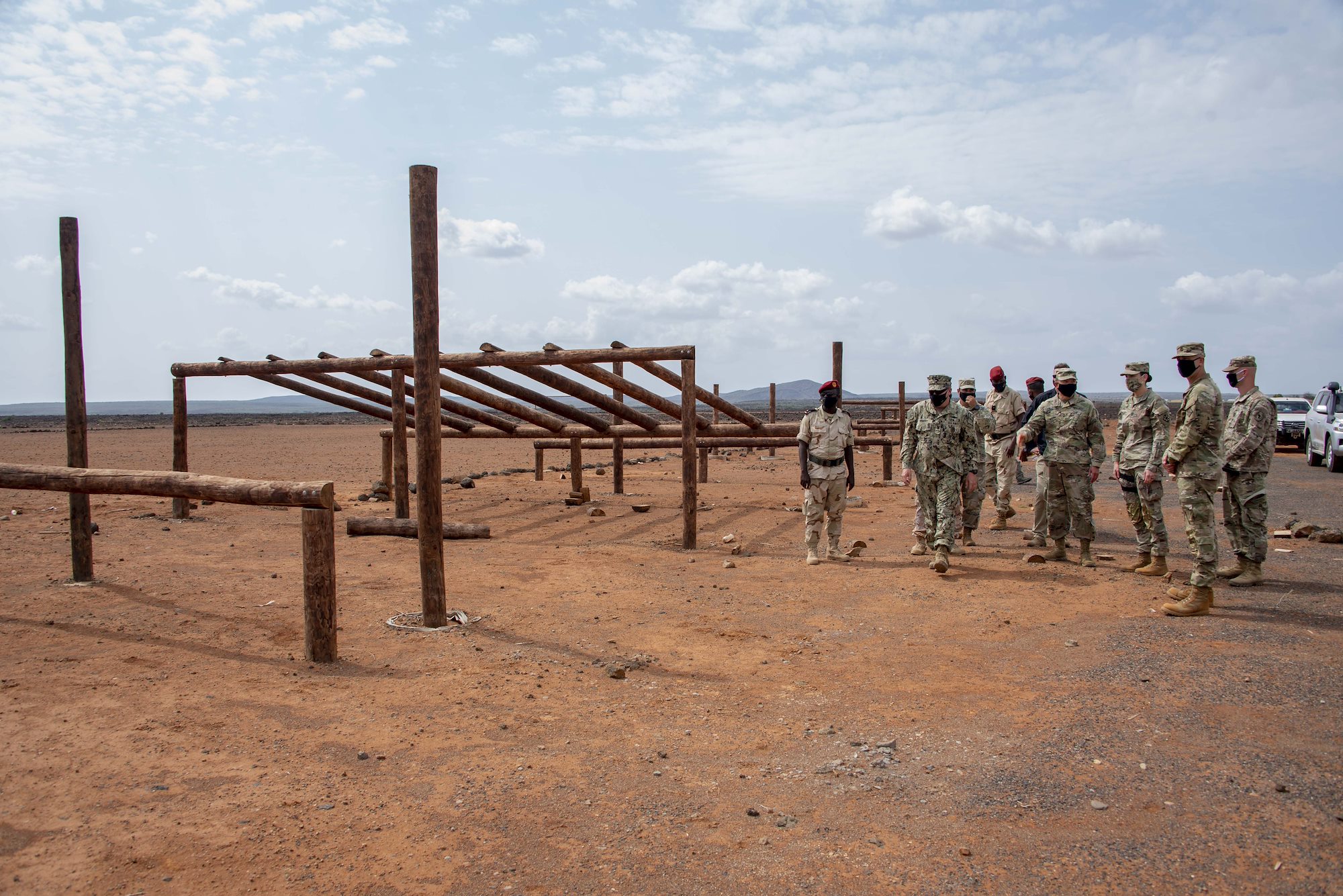 U.S. and Djiboutian leaders observe the construction of a new obstacle course for the Djiboutian Army, Jan.11, 2021, at an undisclosed location in East Africa. The 760th Engineer Vertical Construction Company (EVCC), and the Security Forces Assistance Brigade (SFAB), are working with the Djiboutian military to enhance their skills and training environment. (U.S. Air Force photos by Senior Airman Kristin Savage)
