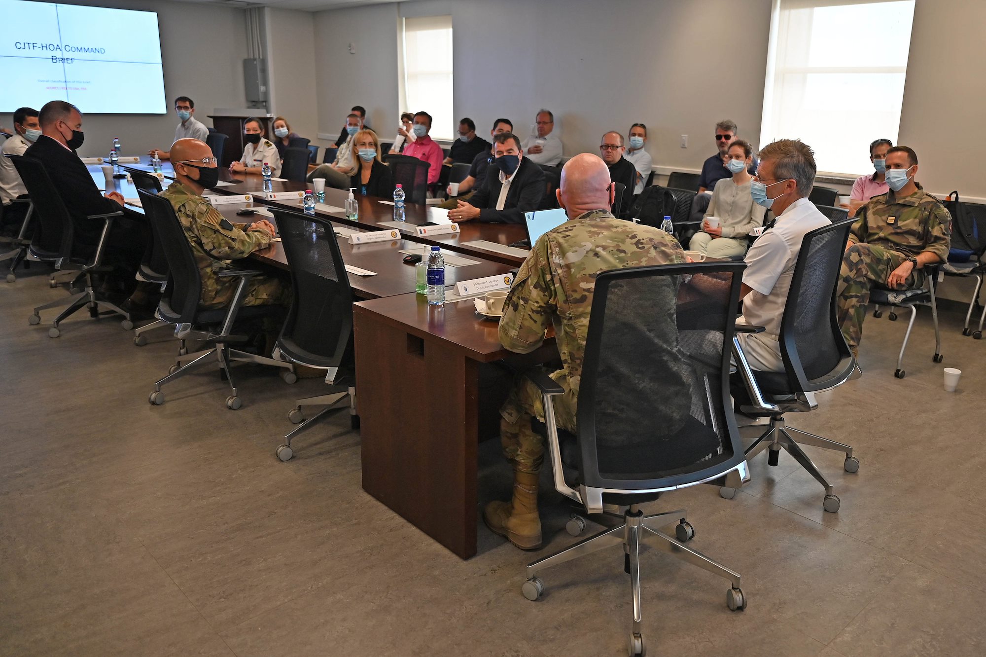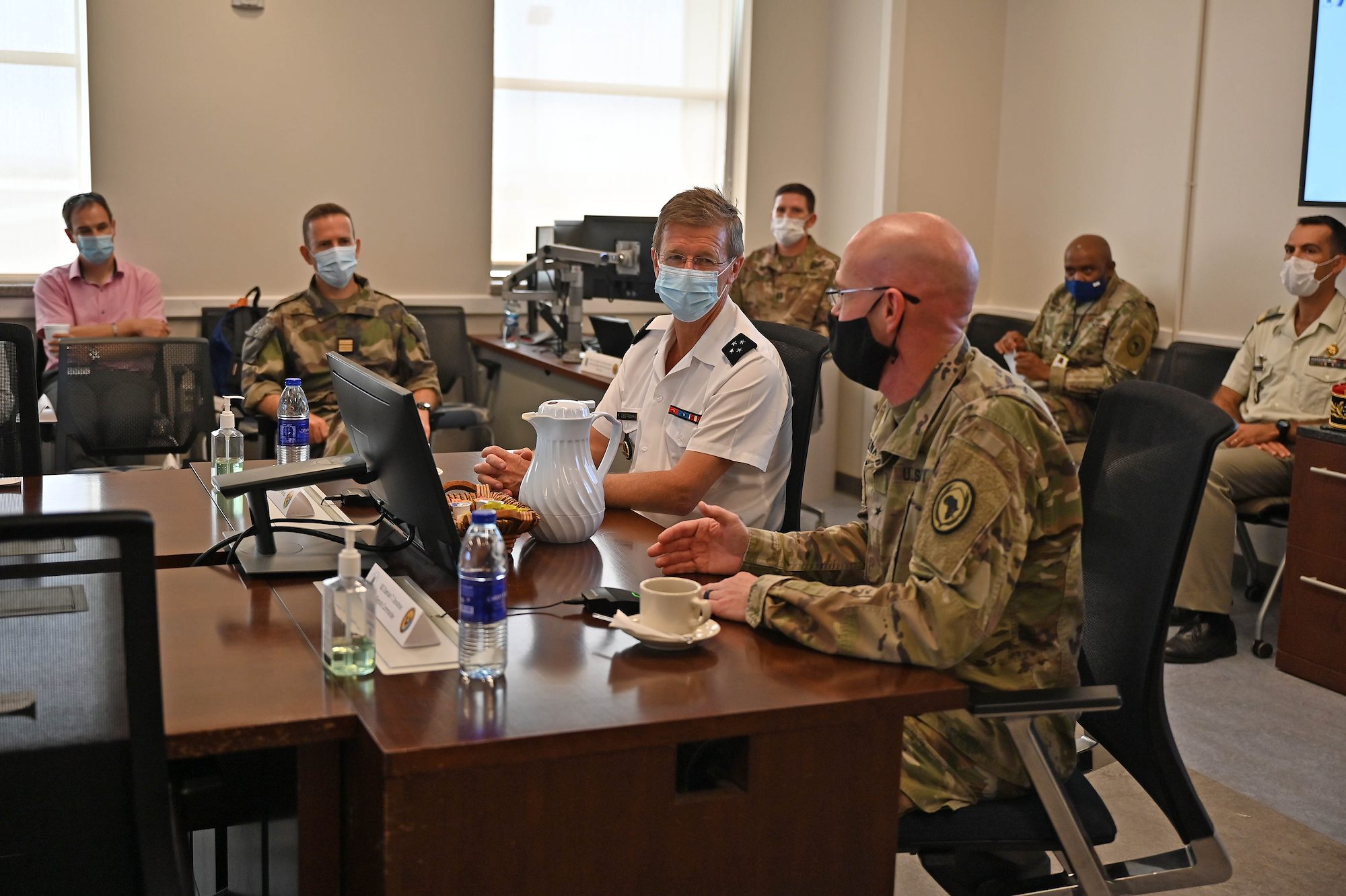 French Général de Corps d'Armee Patrick Destremau, Director of the Institute of Higher National Defense Studies (IHEDN) and Higher Military Education (EMS), along with members of his staff and distinguished guests receive a mission brief from U.S. Army Brig. Gen. Damian T. Donahoe deputy commanding general, Combined Joint Task Force-Horn of Africa (CJTF-HOA), at Camp Lemonnier, Djibouti, Jan. 11, 2021. The members of this IHEDN include senior civilian and military leaders, French and partner-nations alike, who will acquire a better understanding of international relations and defense issues. (U.S. Air Force photo by Tech. Sgt. Dana J. Cable)