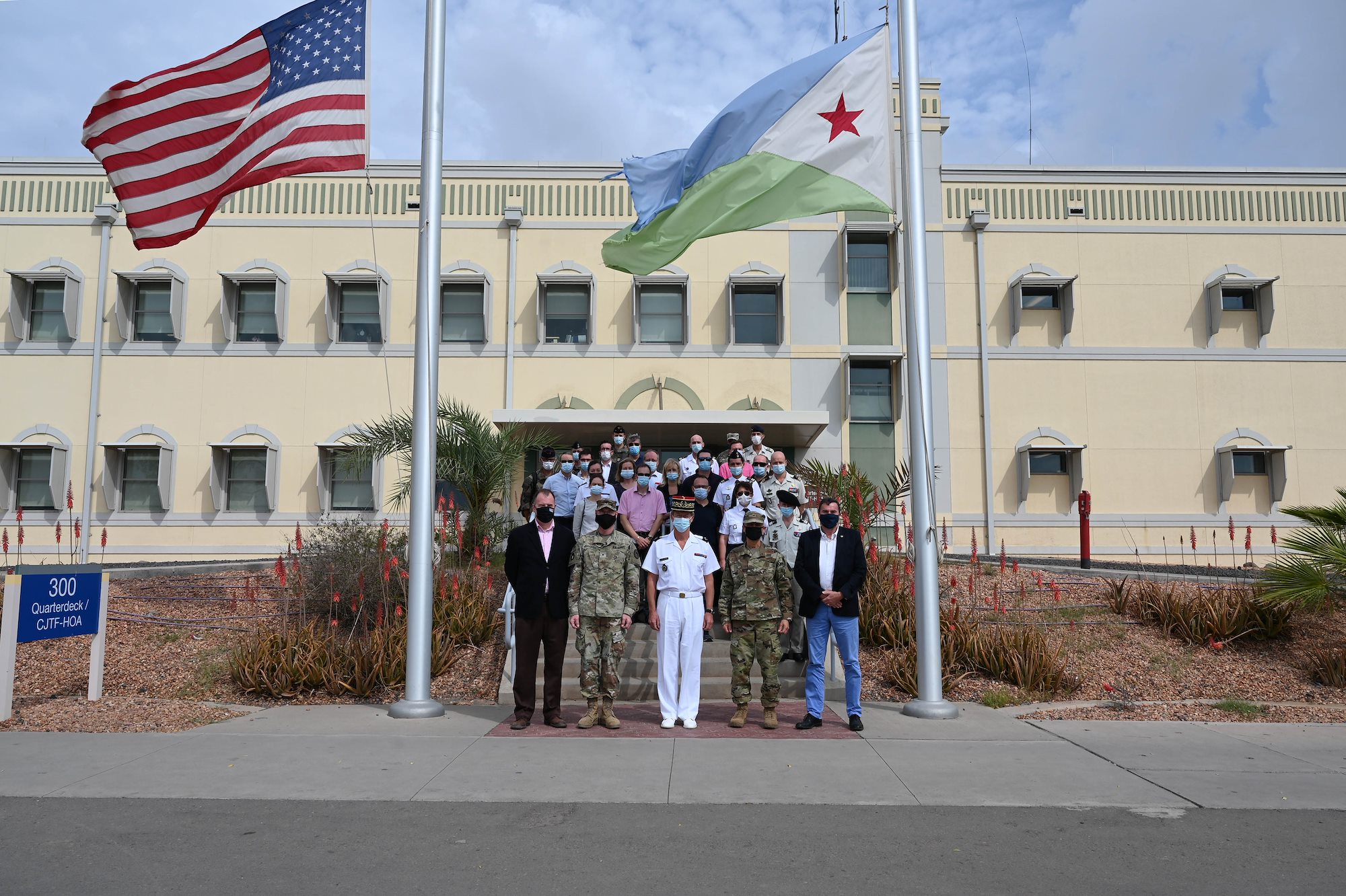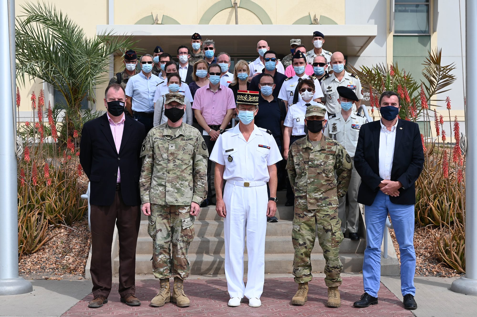 French Général de Corps d'Armee Patrick Destremau, Director of the Institute of Higher National Defense Studies (IHEDN) and Higher Military Education (EMS), along with members of his staff, distinguished guests and Combined Joint Task Force-Horn of Africa leadership pose for a group photograph during a visit to Camp Lemonnier, Djibouti, Jan. 11, 2021. The members of this IHEDN include senior civilian and military leaders, French and partner-nations alike, who will acquire a better understanding of international relations and defense issues. (U.S. Air Force photo by Tech. Sgt. Dana J. Cable)