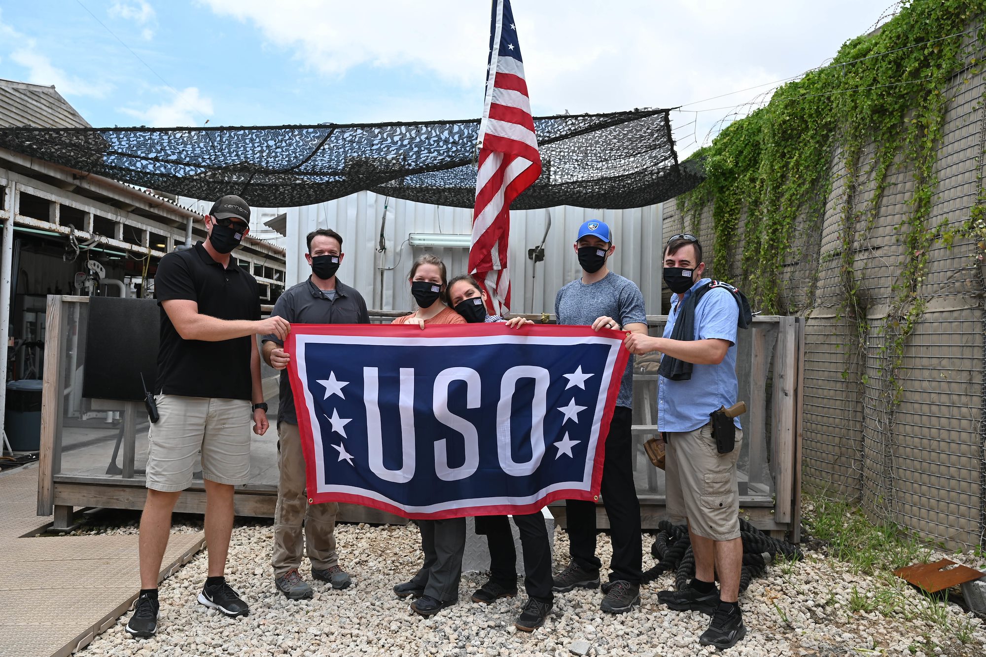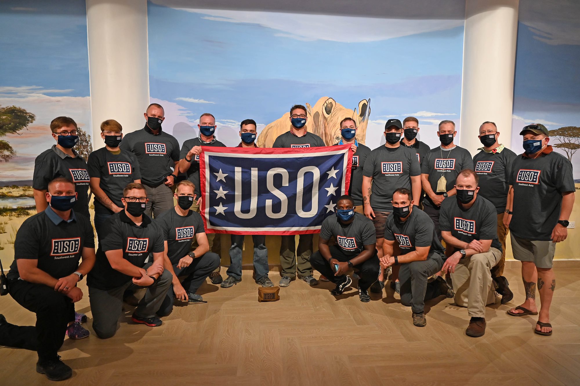 Deployed Service members pose for a photo after a USO event in East Africa Nov. 12, 2020. The USO was formed in 1941 as a response to President Roosevelt's call for a civilian organization to boost the morale of U.S. troops during WWII. (U.S. Air Force photo by Tech. Sgt. Dana J. Cable)
