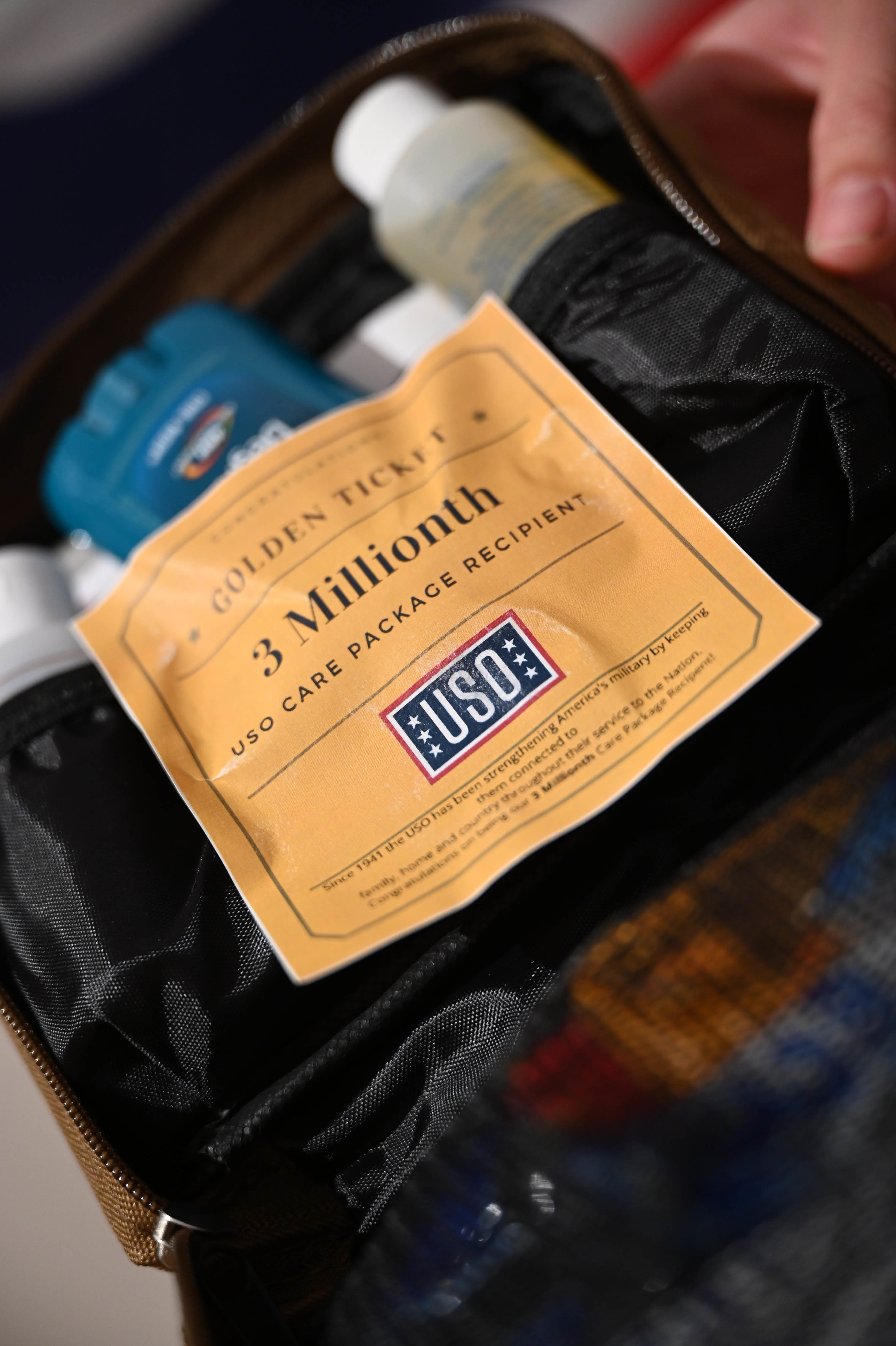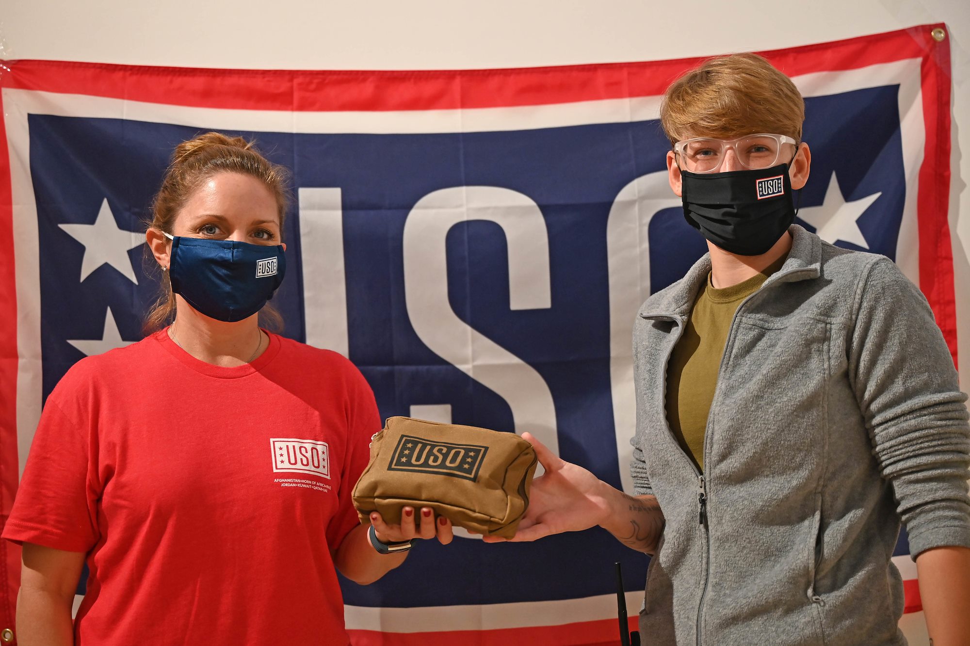 U.S. Army Spc. Kayla Lystad, a Minnesota National Guardsmen deployed with Task Force Bayonet in support of Combined Joint Task Force – Horn of Africa, receives the 3 million USO care package in East Africa, Nov. 11, 2020. The USO is a nonprofit organization that has supported U.S. service members and their families for nearly 80 years. (U.S. Air Force photo by Tech. Sgt. Dana J. Cable)
