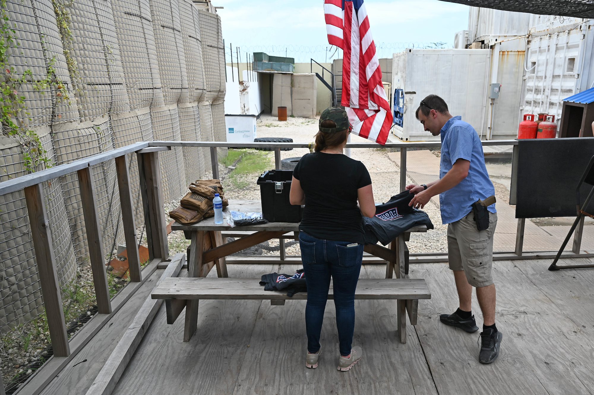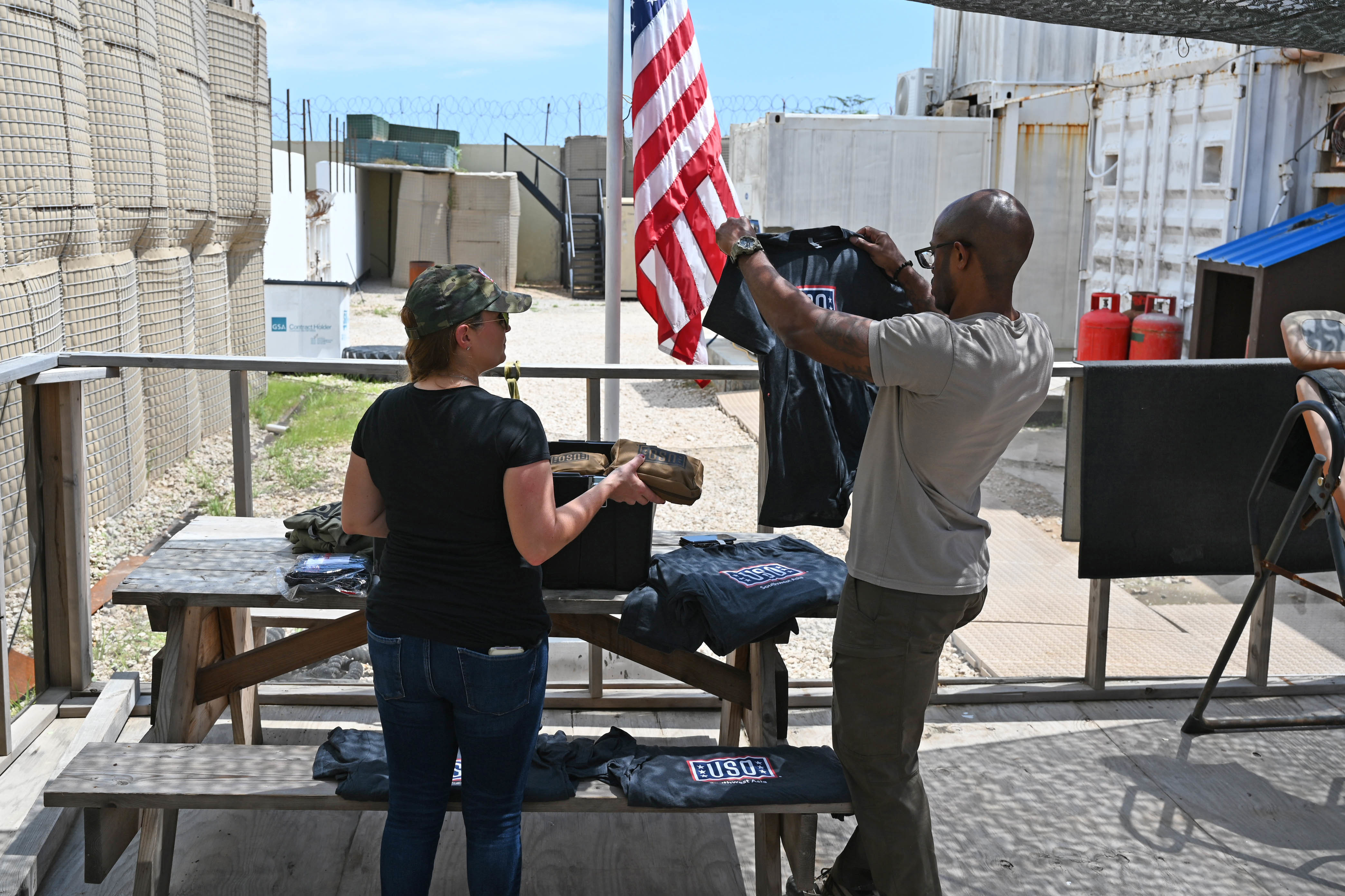 Holly Coffer, USO Camp Lemonnier manager, hands out care packages and shirts during a USO event in East Africa, Nov. 12, 2020. The USO is a nonprofit organization that has supported U.S. service members and their families for nearly 80 years. (U.S. Air Force photo by Tech. Sgt. Dana J. Cable)
