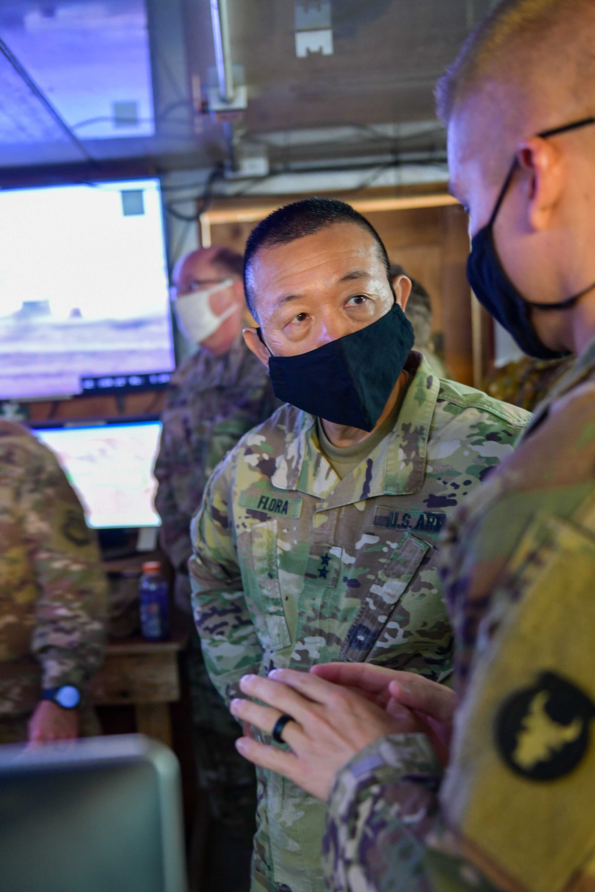 U.S. Army Maj. Gen. Lapthe C. Flora, commanding general, Combined Joint Task Force - Horn of Africa (CJTF-HOA), receives a Drone Buster brief during his visit to Chabelley Airfield, Djibouti, Oct.31, 2020. Flora spent the afternoon getting a first-hand look at force protection measures and thanking serves members for their continued service. (U.S. Army National Guard photo by Sgt. Brandon Julson)