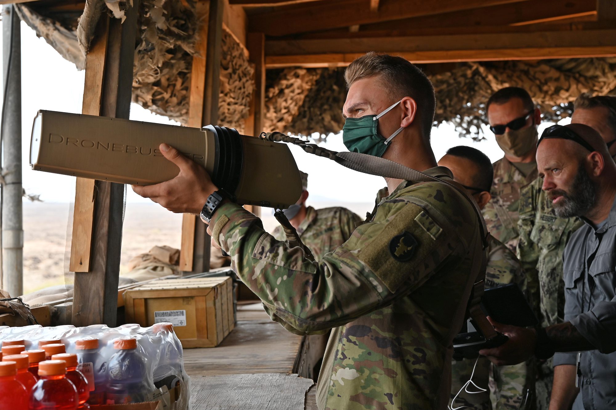 A Soldier with Task Force Bayonet demonstrates the use of a Drone Buster for U.S. Army Maj. Gen. Lapthe C. Flora, commanding general, Combined Joint Task Force-Horn of Africa (CJTF-HOA), during his visit to Chabelley Airfield, Djibouti, Oct. 31, 2020. Flora spent the afternoon getting a first-hand look at force protection measures and thanking serves members for their continued service. (U.S. Air Force photo by Tech. Sgt. Dana J. Cable)