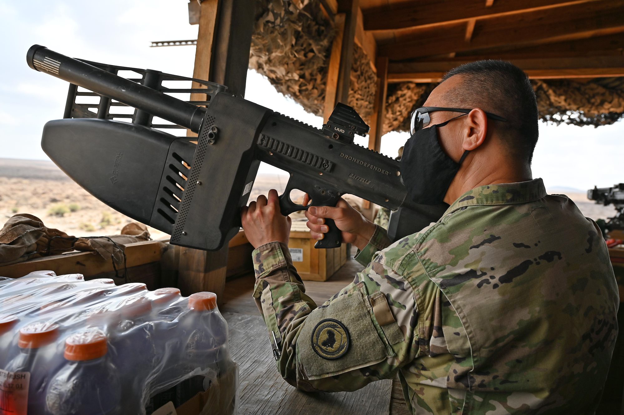 U.S. Army Maj. Gen. Lapthe C. Flora, commanding general, Combined Joint Task Force-Horn of Africa (CJTF-HOA), operates a Drone Defender V2 during his visit to Chabelley Airfield, Djibouti, Oct. 31, 2020. The Drone Defender V2 is an electronic warfare weapon that is capable of downing and disabling a small Unmanned Aircraft System. Flora spent the afternoon getting a first-hand look at force protection measures and thanking serves members for their continued service. (U.S. Air Force photo by Tech. Sgt. Dana J. Cable)