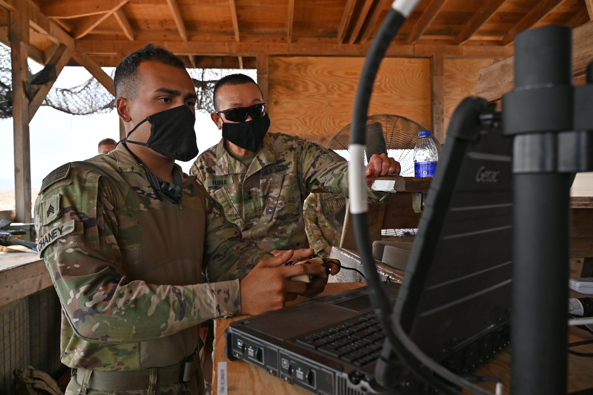 U.S. Army Sgt. Julian Chaney, fire support specialist with Task Force Bayonet, shows U.S. Army Maj. Gen. Lapthe C. Flora, commanding general, Combined Joint Task Force-Horn of Africa (CJTF-HOA), a new security camera capability in a watchtower at Chabelley Airfield, Djibouti, Oct. 31, 2020. Flora spent the afternoon getting a first-hand look at force protection measures and thanking serves members for their continued service. (U.S. Air Force photo by Tech. Sgt. Dana J. Cable)