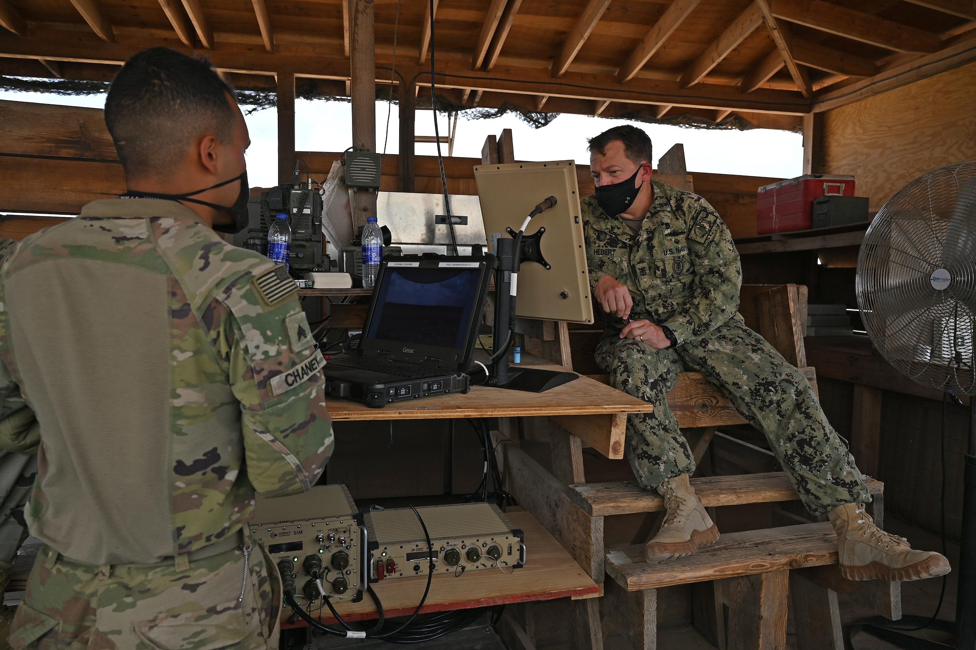 U.S. Navy Command Master Chief Petty Officer Alex Hebert, command senior enlisted leader, Combined Joint Task Force - Horn of Africa (CJTF-HOA), checks out a new security camera capability in a watchtower at Chabelley Airfield, Djibouti, Oct. 31, 2020. Hebert spent the afternoon getting a first-hand look at force protection measures and thanking serves members for their continued service. (U.S. Air Force photo by Tech. Sgt. Dana J. Cable)