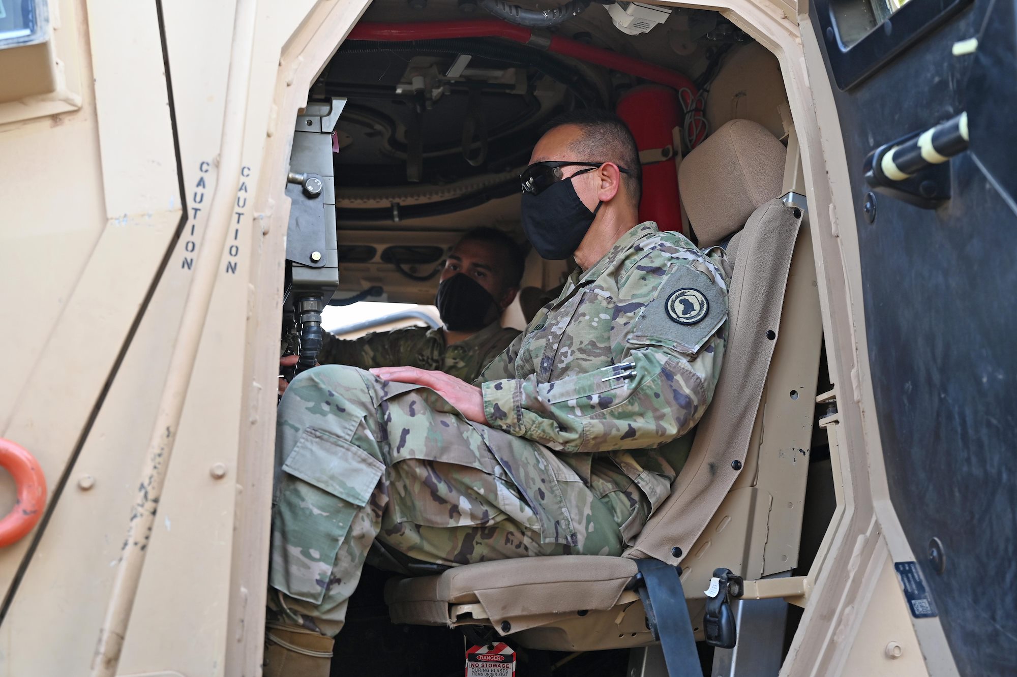 A U.S Army Soldier from Task Force Bayonet shows U.S. Army Maj. Gen. Lapthe C. Flora, commanding general, Combined Joint Task Force-Horn of Africa (CJTF-HOA), the inside of a Mine Resistant Ambush Protected (MRAP) vehicle at Chabelley Airfield, Djibouti, Oct. 31, 2020. Flora spent the afternoon getting a first-hand look at force protection measures and thanking serves members for their continued service. (U.S. Air Force photo by Tech. Sgt. Dana J. Cable)